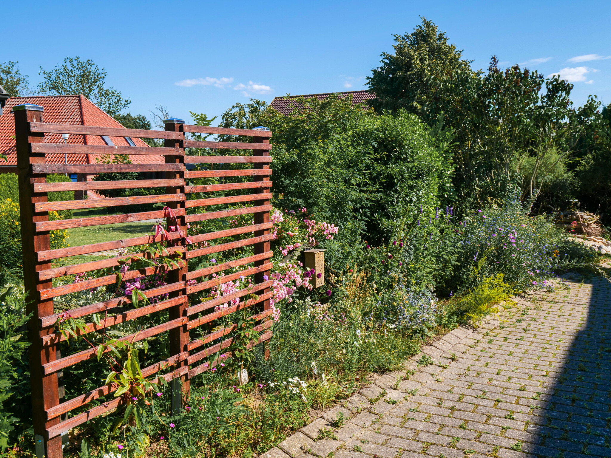 Da durch das Entfernen des Kirschlorbeers der Sichtschutz zum Nachbargrundstück entfiel, errichteten wir ein hölzernes Rankgitter, das die Sichtachse zu unseren Fenstern auflockert. An dieser Rankhilfe wachsen zwei ungefüllte Clematis-Sorten – eine der wenigen nicht-heimischen Pflanzen im Beet, jedoch bewusst insektenfreundlich ausgewählt.