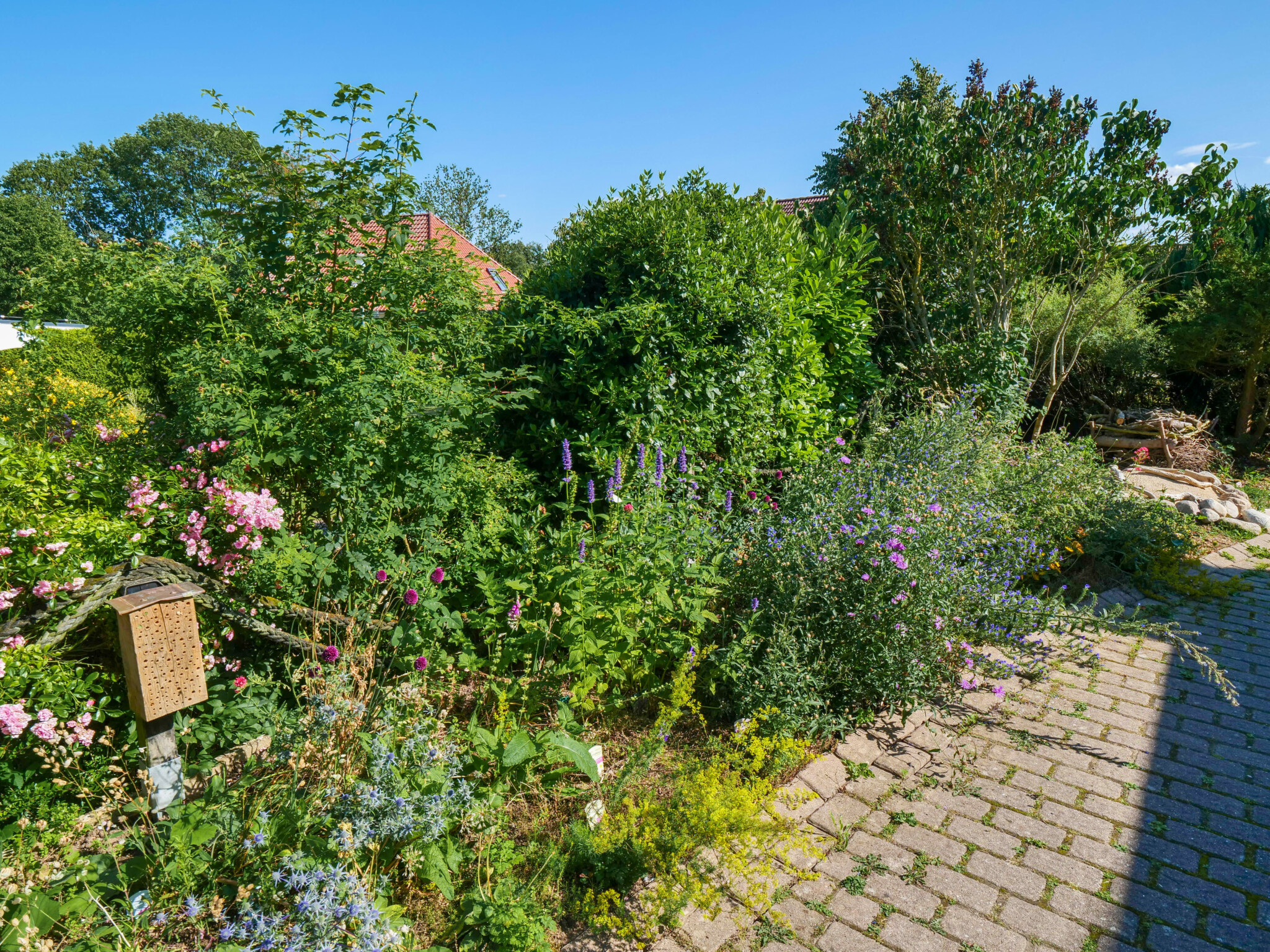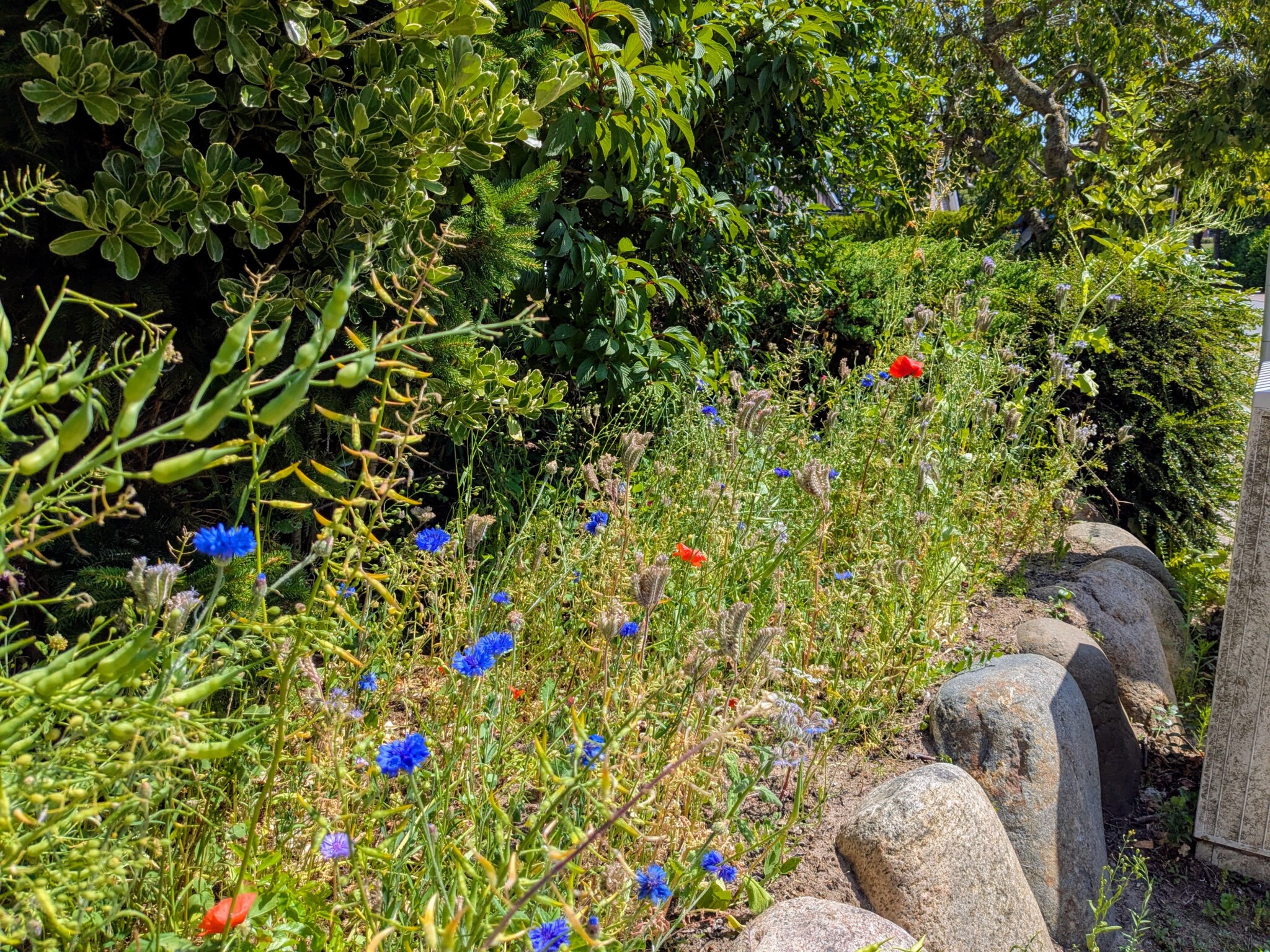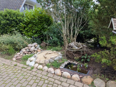 Als zusätzliches Element entstand ein kleiner Miniteich, bepflanzt mit heimischen Wasser- und Uferpflanzen. Er bietet nicht nur Insekten eine wertvolle Wasserquelle, sondern zieht auch Vögel und andere tierische Besucher an und ergänzt damit das ökologische Angebot unseres Gartens.
