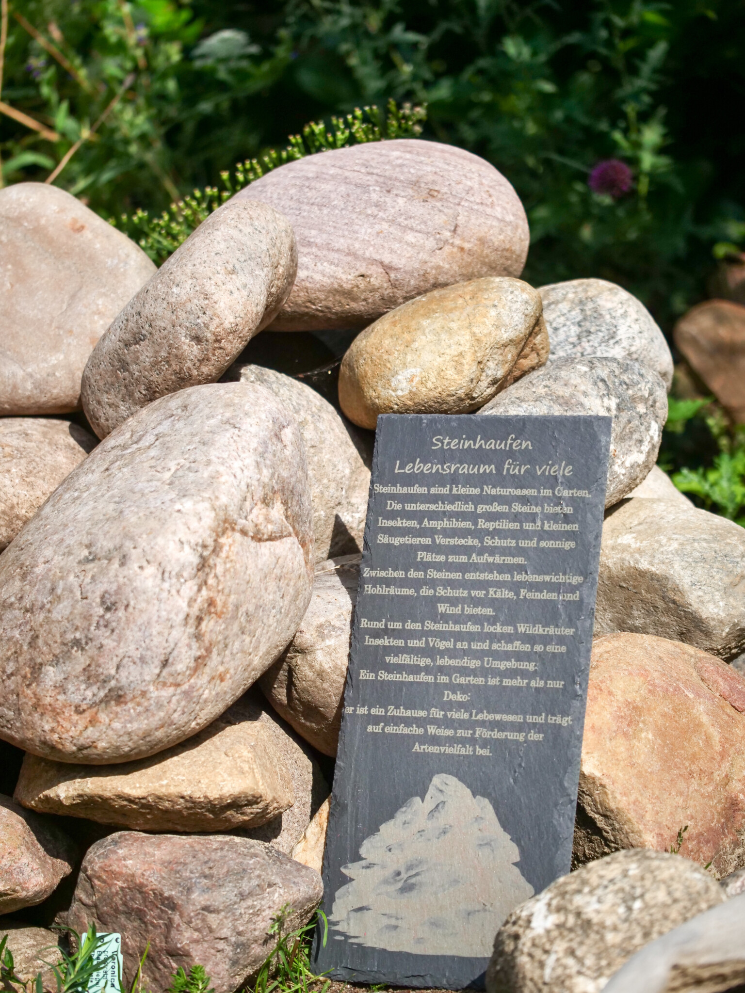 Als nächstes haben wir einen Steinhaufen aus Feldsteinen angelegt. Dabei haben wir darauf geachtet, größere Hohlräume zwischen den Steinen zu lassen, um Versteckmöglichkeiten für Tiere wie Eidechsen, Insekten oder Kleinsäuger zu schaffen.