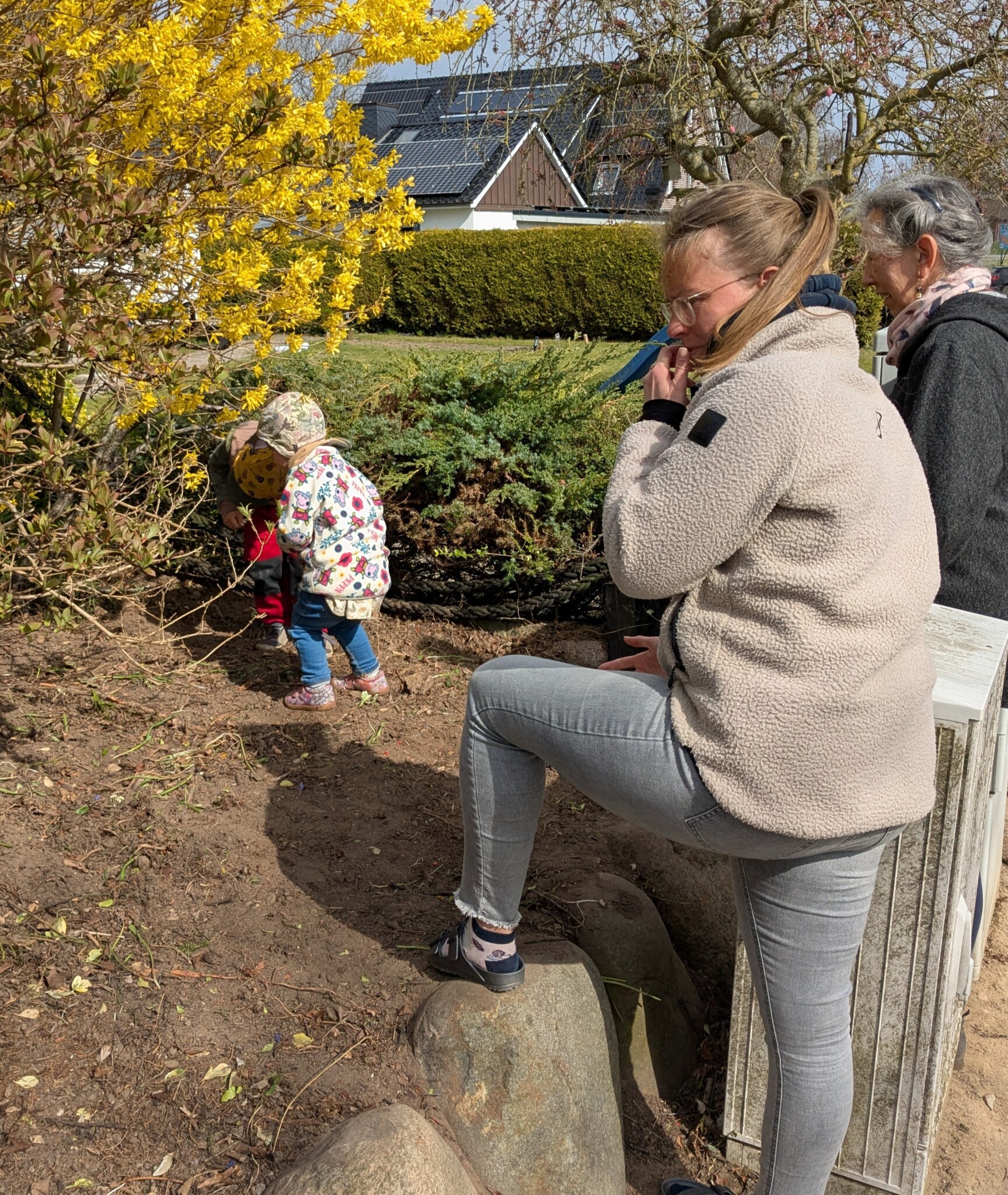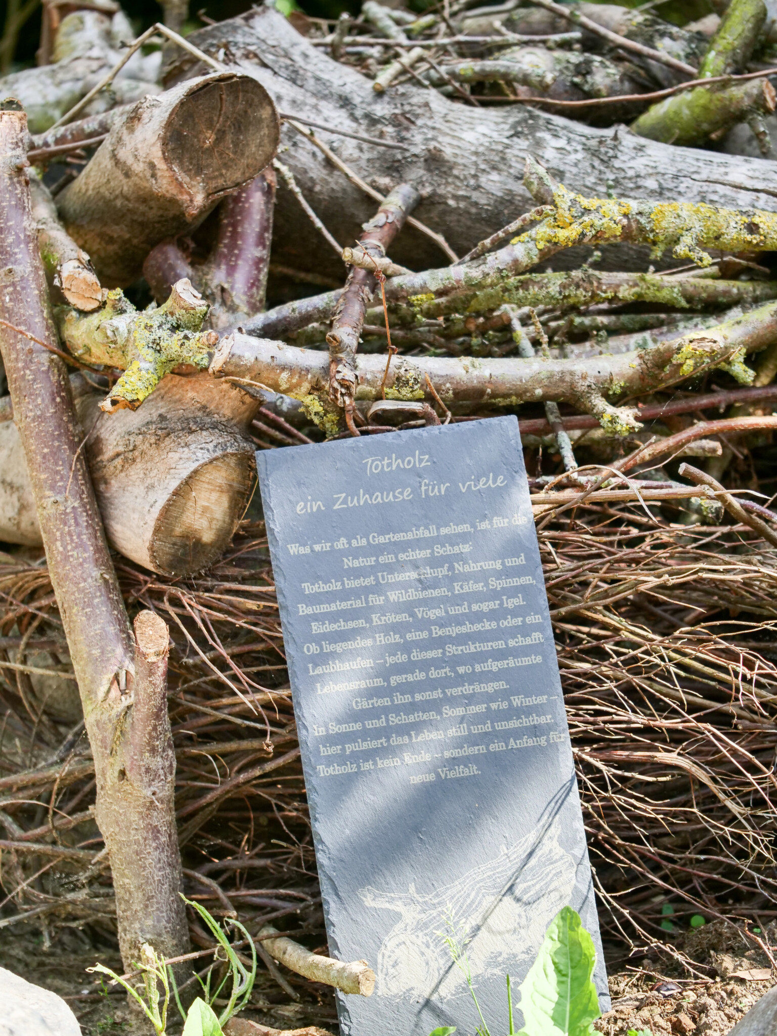 Den bereits angelegten Steinhaufen haben wir um zusätzliche Steine erweitert, um noch mehr Versteckmöglichkeiten für Insekten, Amphibien und Kleinsäuger zu schaffen. Außerdem haben wir weiteres Totholz ins Beet integriert – als Unterschlupf, Nistplatz und natürlicher Teil des Gartenbildes.
