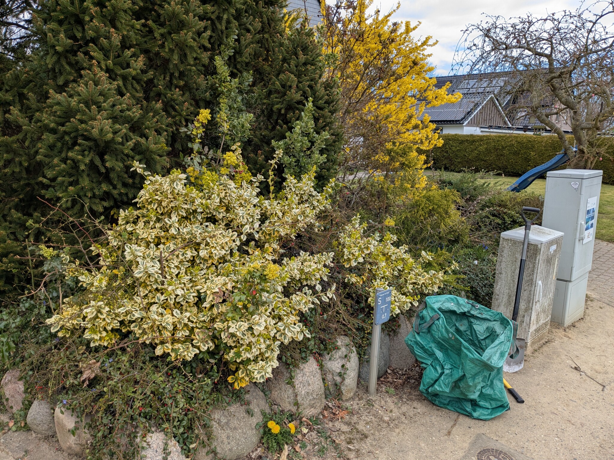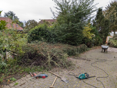 Im Herbst 2024 begannen wir, unser rund 60 m² großes Beet an der Einfahrt grundlegend umzugestalten – mit dem Ziel, daraus eine naturnahe, insektenfreundliche Fläche zu machen. Zunächst stand die Flächenvorbereitung im Mittelpunkt: Eine stark wuchernde, invasive Kriechmispel (ca. 12 m²) wurde vollständig entfernt. Zusätzlich beseitigten wir mehrere nicht-heimische und ökologisch wenig wertvolle Gehölze wie Kirschlorbeer, Forsythie und Koniferen, sodass wir insgesamt eine Fläche von ca. 16m² neu bepflanzen können.