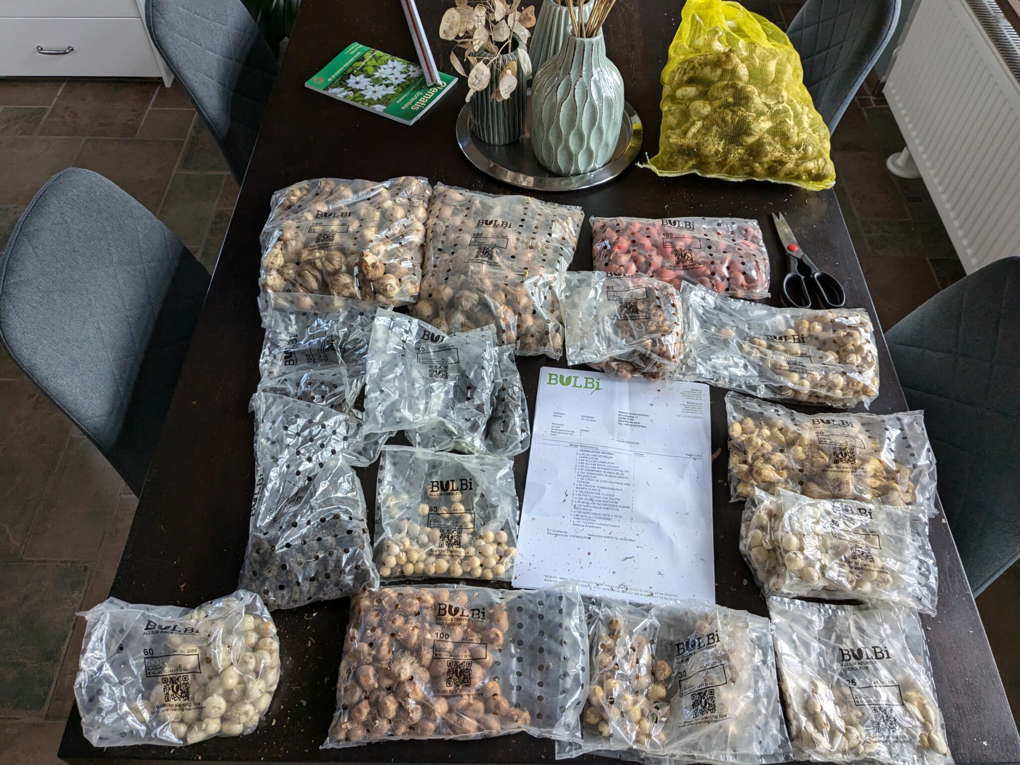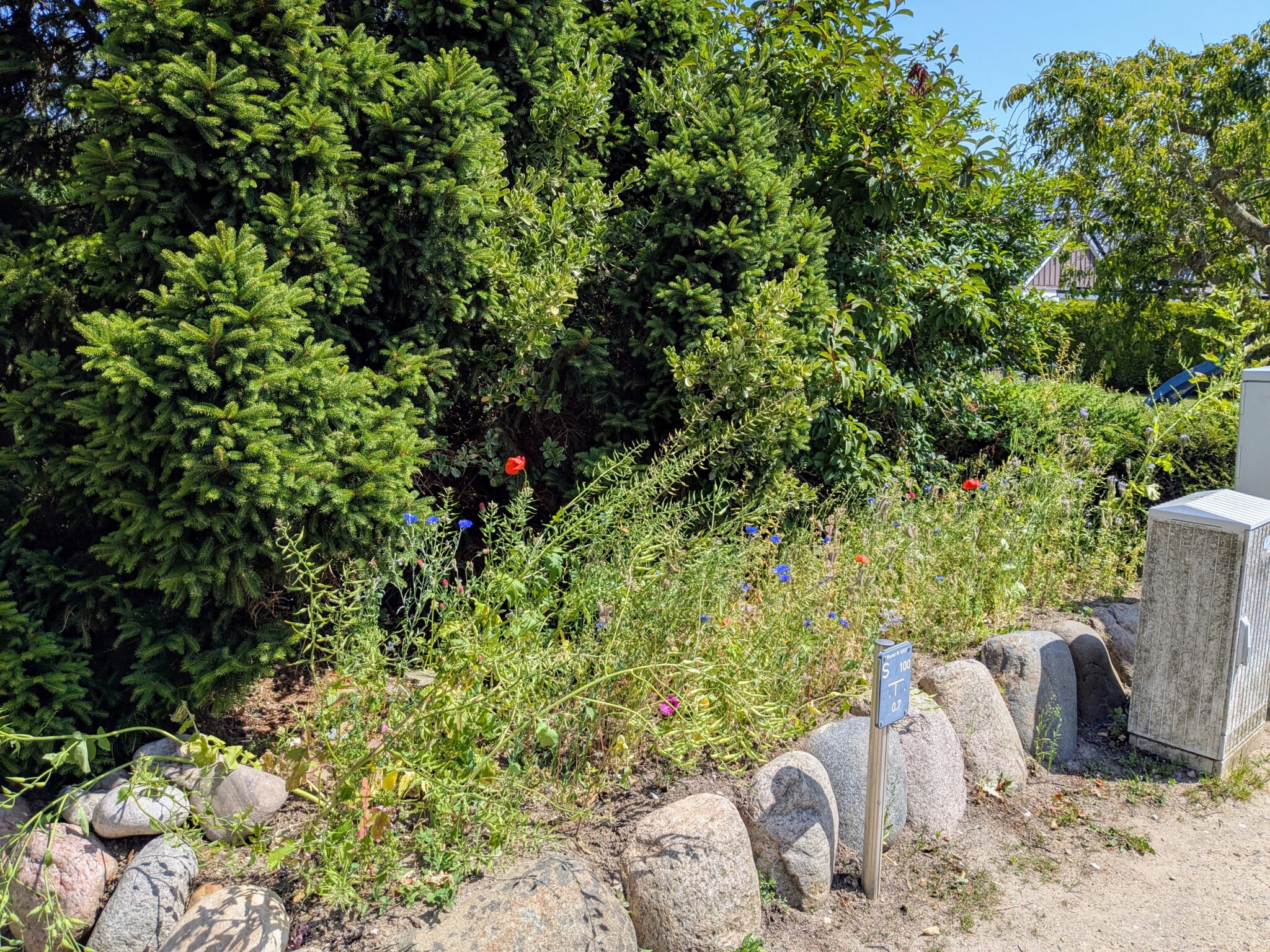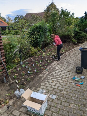 Anschließend machten wir uns mithilfe der App „NaturaDB“ auf die Suche nach geeigneten heimischen Pflanzen. Die Auswahl fiel auf rund 100 Wildstauden aus einer kleinen Gärtnerei in Kiel sowie auf etwa 700 Blumenzwiebeln, um ein ganzjähriges Blühangebot zu schaffen. Bei den Blumenzwiebeln haben wir vereinzelt auch nicht-heimische Arten wie Winterlinge und Wildtulpen verwendet – diese blühen sehr früh im Jahr und gelten laut NaturaDB als wertvolle Nahrungsquelle für Wildbienen.