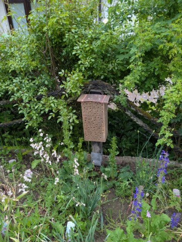 Ergänzend zu den Vogel- und Wildbienen-Nistplätzen haben wir zwei Fledermauskästen an unserem alten Schornstein installiert. Dort sind die Kästen windgeschützt und in ausreichender Höhe angebracht – ideale Voraussetzungen für Fledermäuse, die bei uns zunehmend Nahrung und Unterschlupf suchen. Mit dieser Maßnahme möchten wir auch nachtaktive Insektenjäger im Garten fördern und ein möglichst vielseitiges Netzwerk an Lebensräumen schaffen.