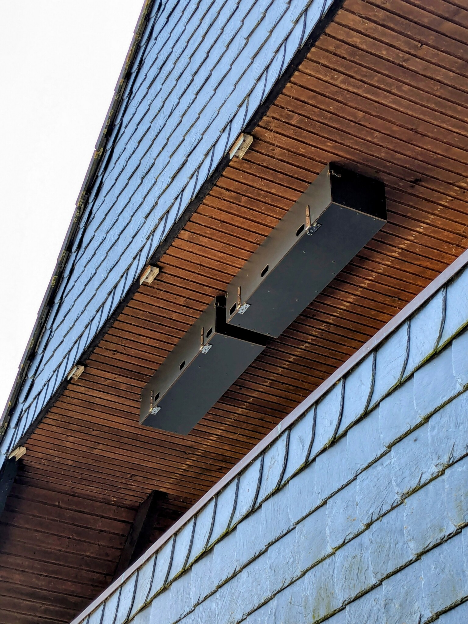 Alle Kästen wurden unter dem Dachvorsprung angebracht, wo sie gut vor Sonneneinstrahlung und Witterung geschützt sind.