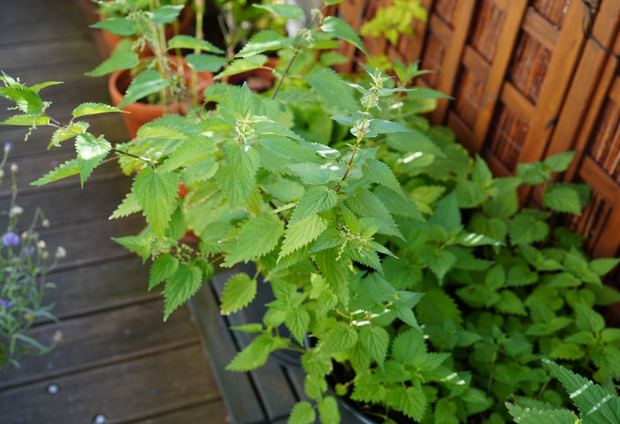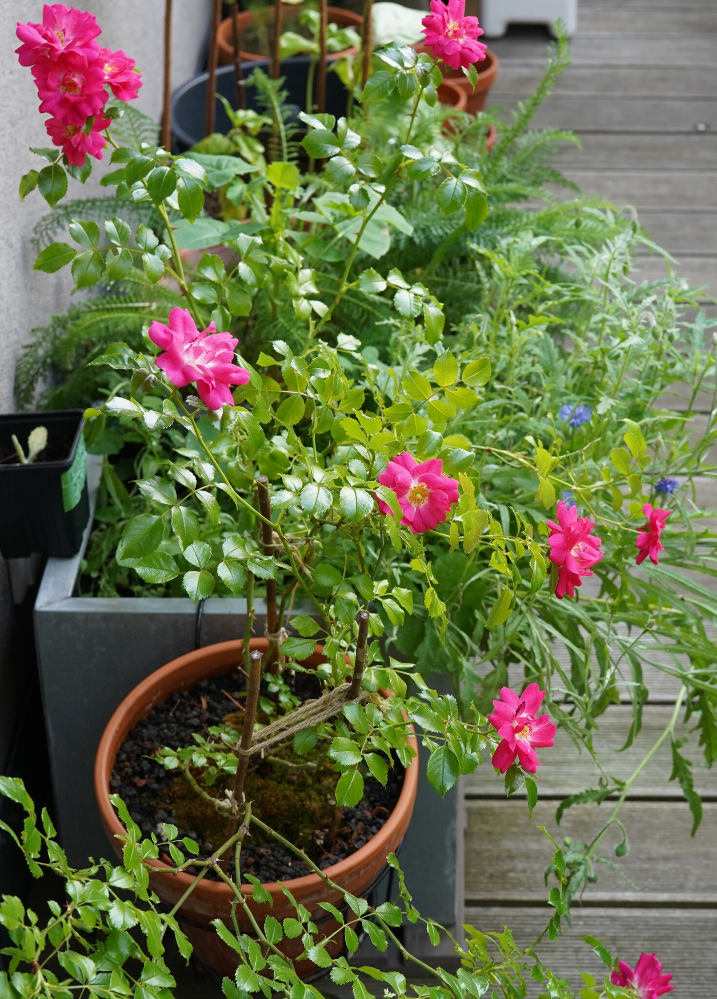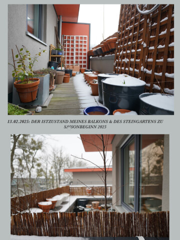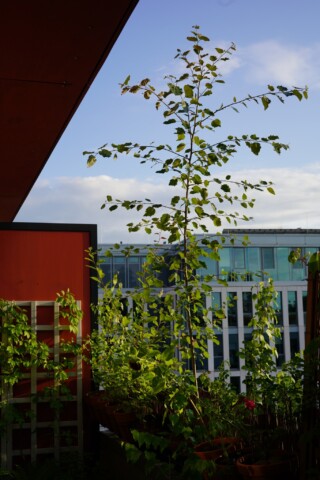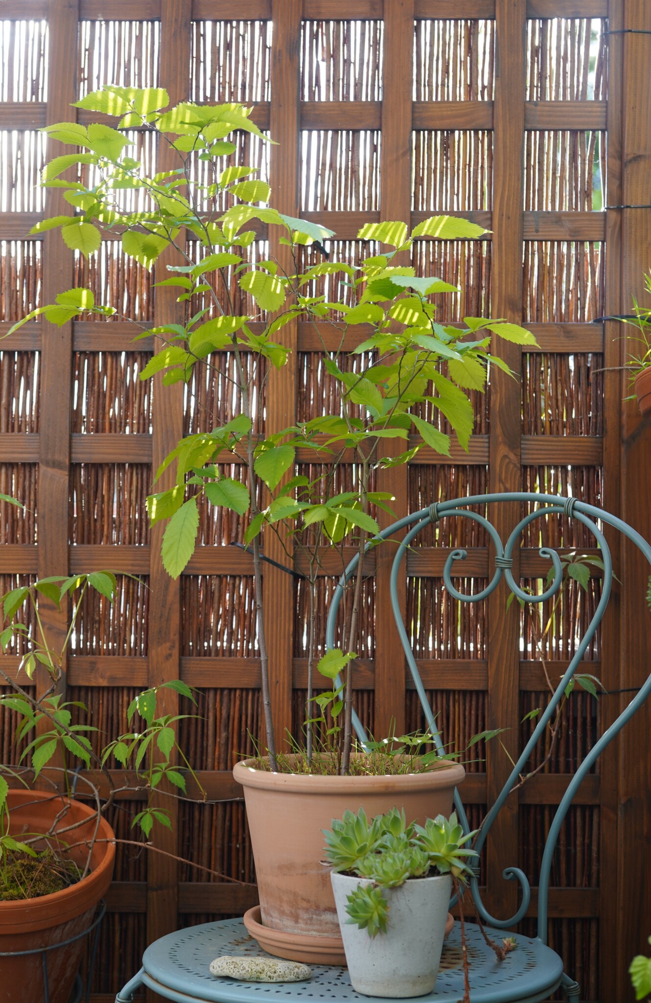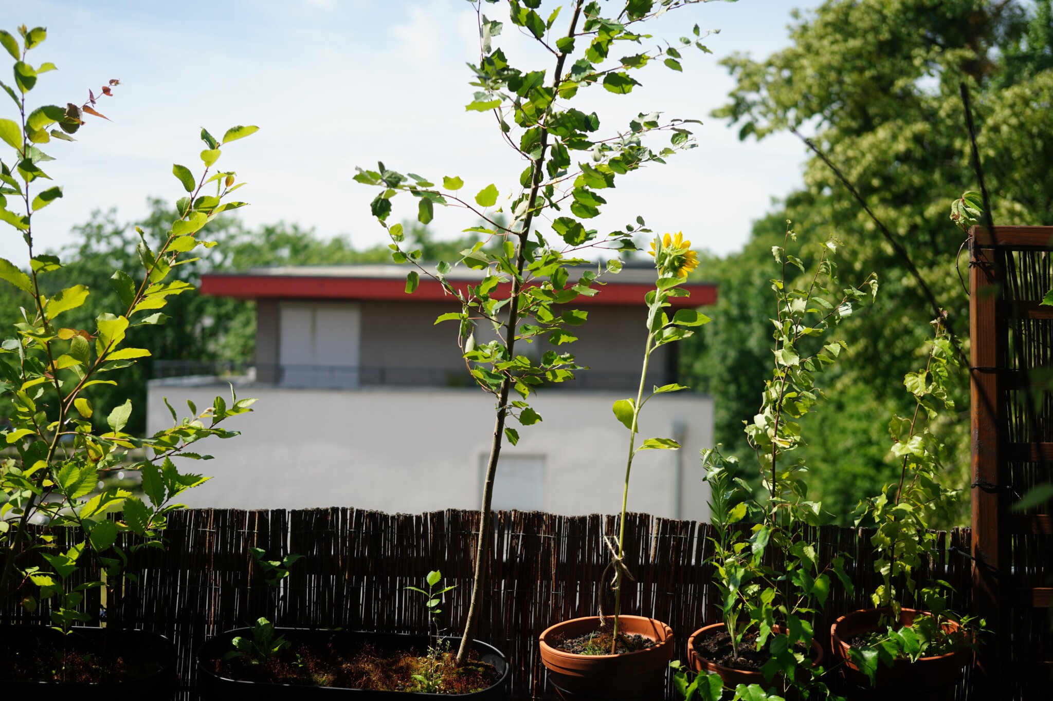 Eine andere Besonderheit meines Naturbalkons, sind die Gehölze: ich lasse alle die mir der Wind her weht in den Töpfen wachsen oder pflanze die Baumbabys, die ich hier irgendwo auf der Fläche finde, ein.