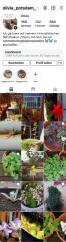 Mein Name ist Olivia. Ich balkongärtnere auf einem 10qm Balkon in Potsdam. Mein Naturbalkon befindet sich im 4.Stock, er hat Süd-West Ausrichtung.