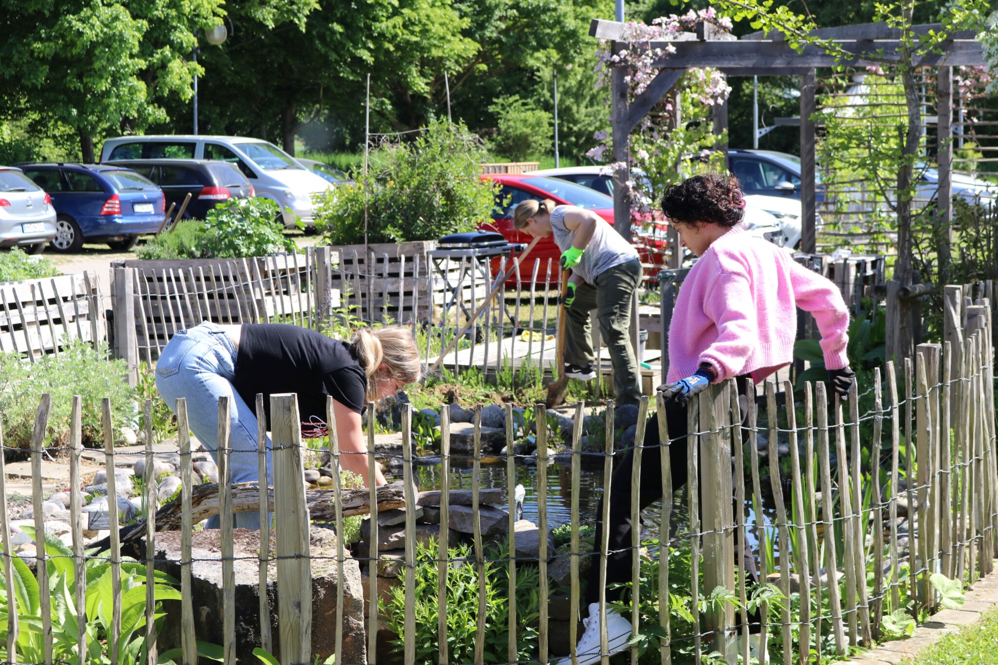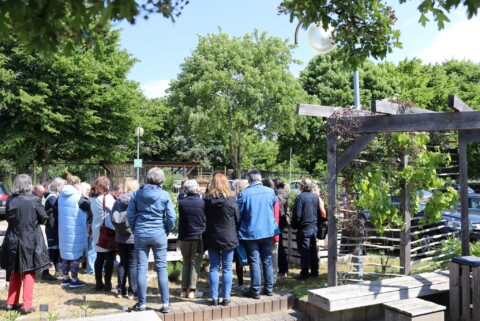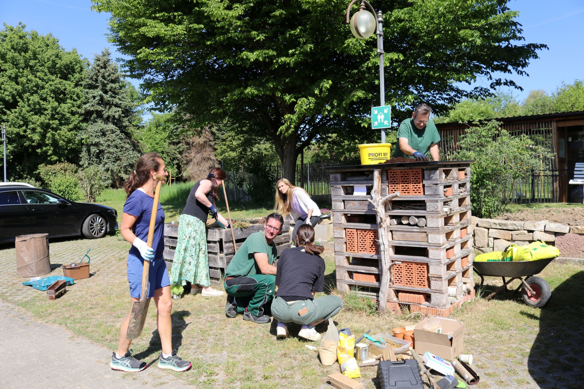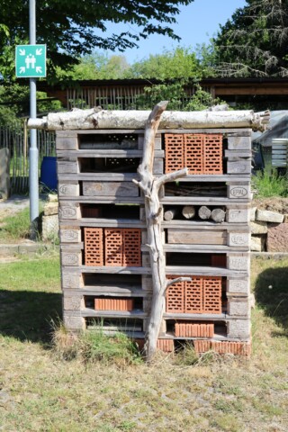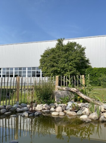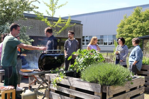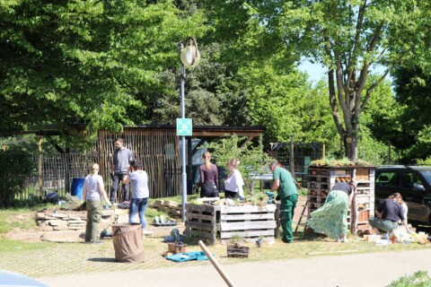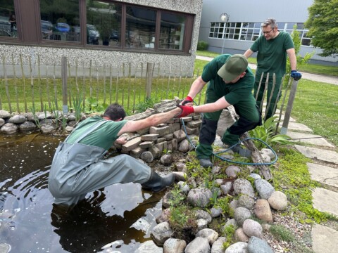Nachdem unser Haustechnik- und Garten-Team den Bachlauf angelegt hatte und die neu bestellten Pflanzen eingetroffen waren, stand eine Pflanzaktion mit einer Gruppe engagierter Mitarbeiter auf dem Programm. Gleichzeitig wurde das Sandarium umgestaltet und das Wildbienenhotel mit neuen Materialien befüllt. Spannend war dabei auch, mit ungewohnten Nauturmaterialien wie Lehm zu arbeiten. Nach der gelungenen Aktion fand ein fröhliches Grillfest für alle Mitarbeiter statt.