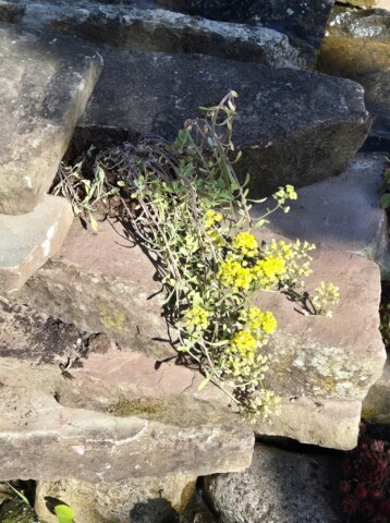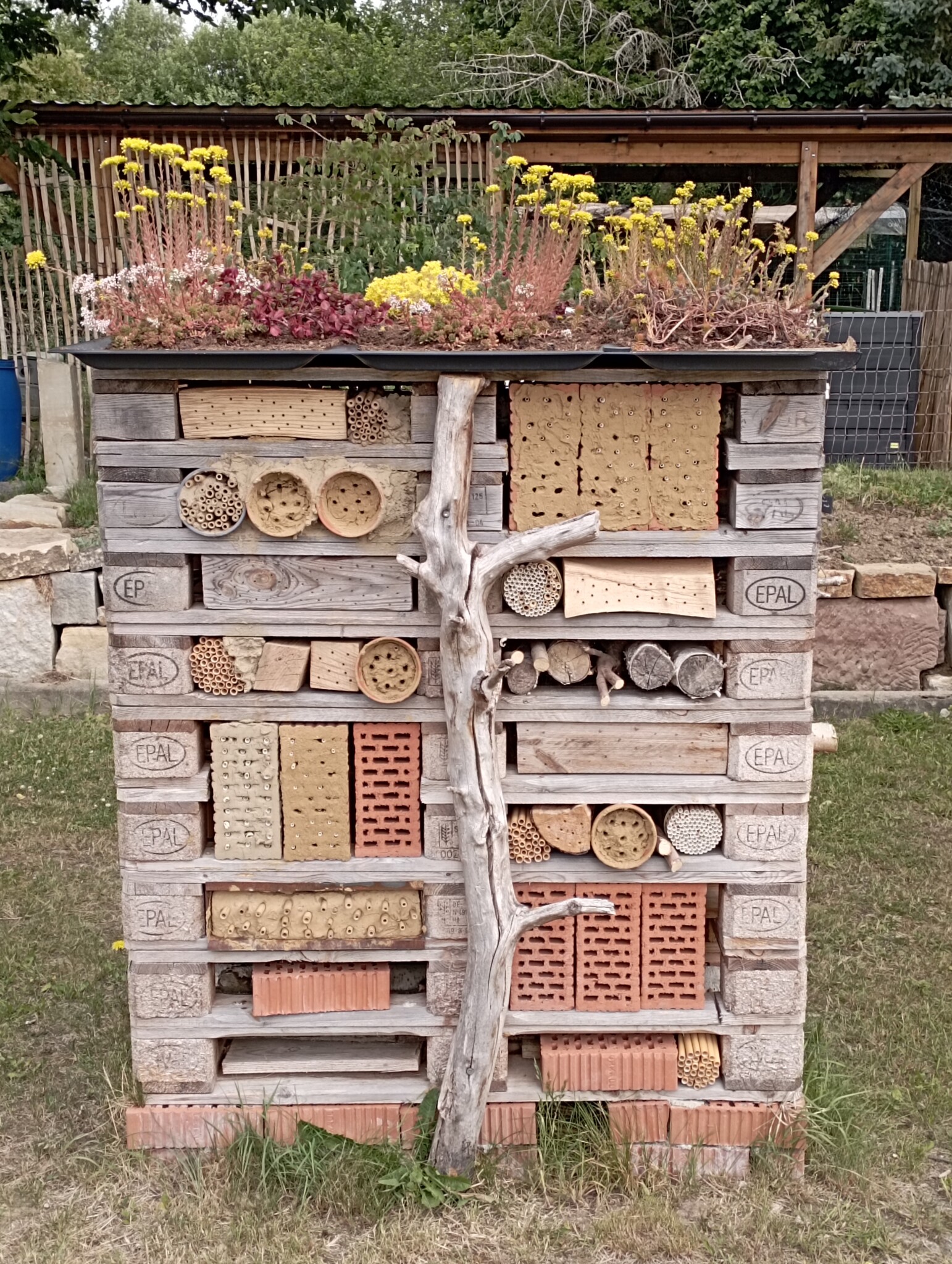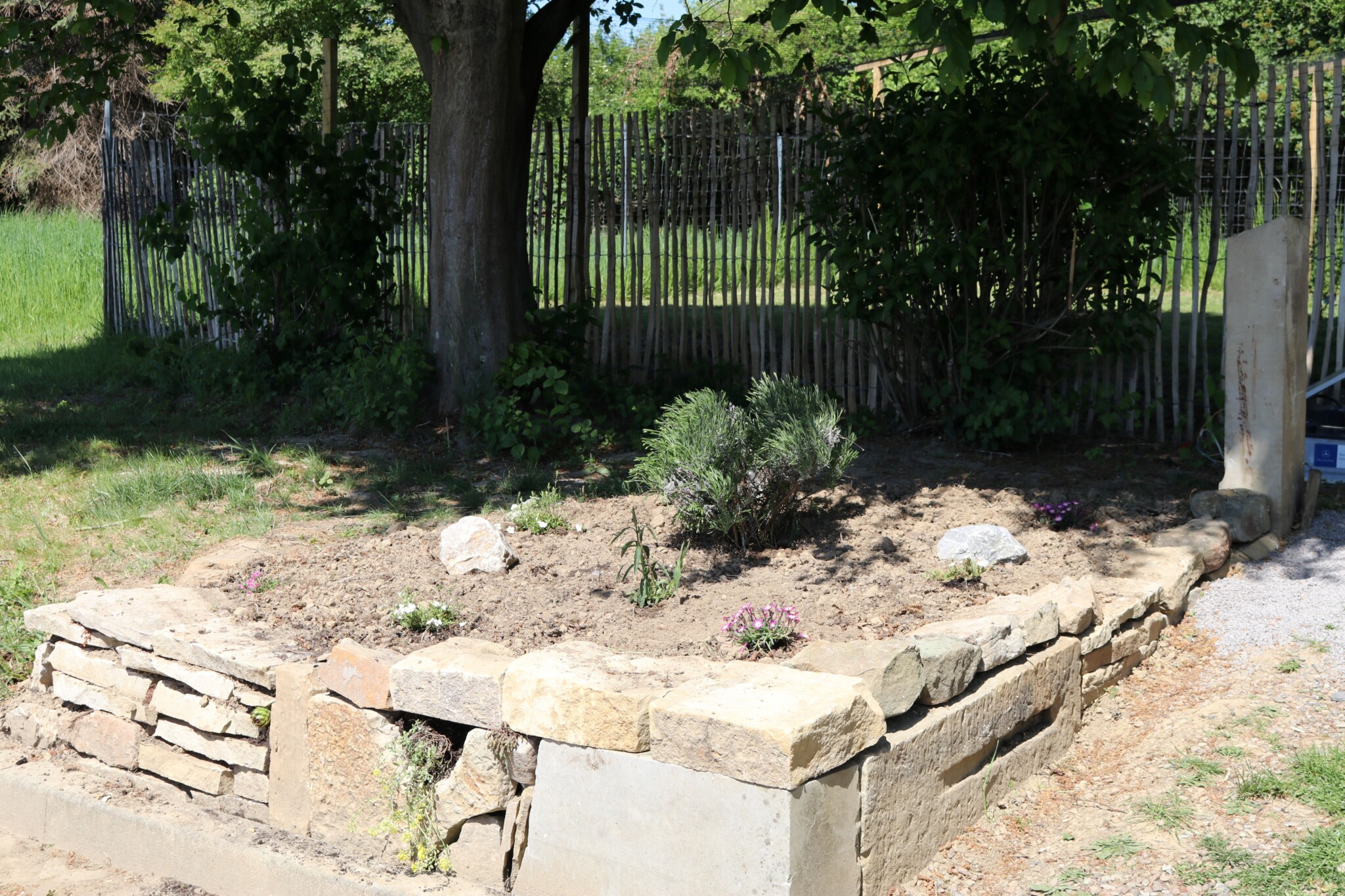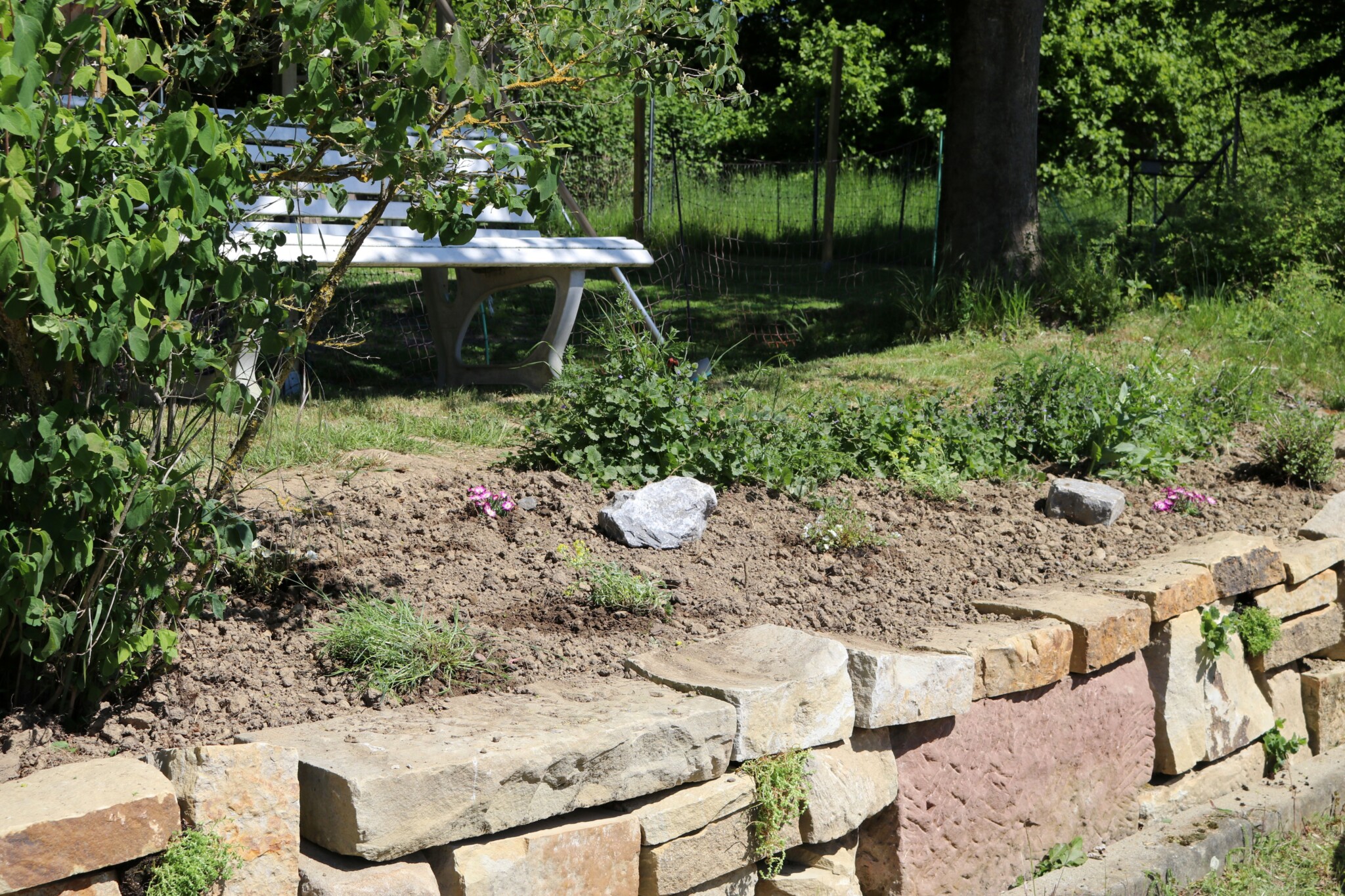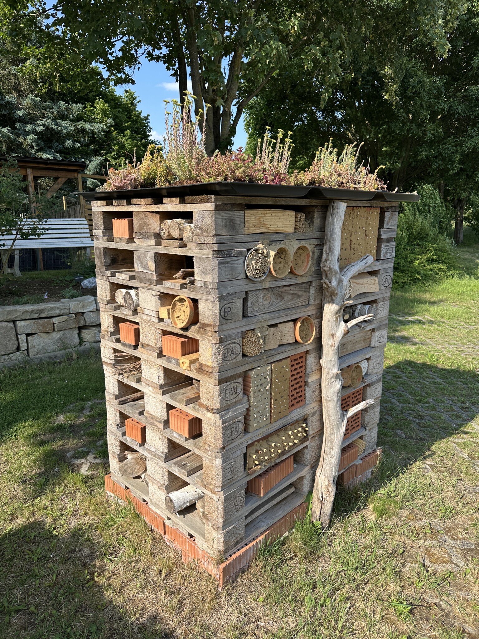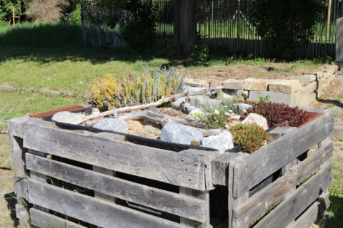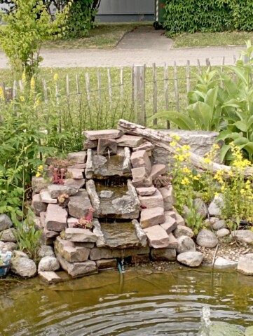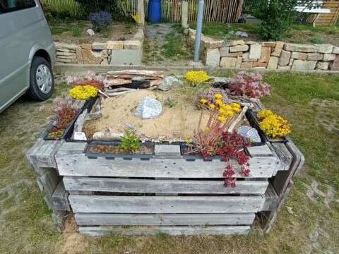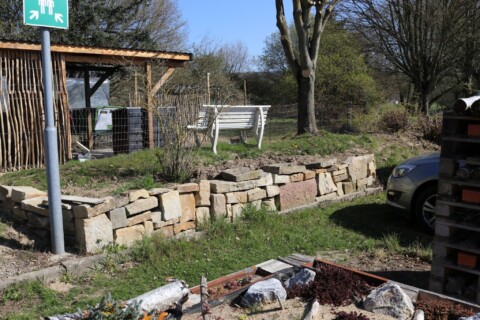 Seitdem versuchen wir mit dem aus Mitarbeitern bestehenden „Green-Team“ in jedem Jahr, den Entdeckerpfad zu erweitern und zu verbessern. Auf einer Fläche von insgesamt ca. 75 Quadratmetern haben wir in diesem Jahr mehrere kleine Projekte geplant und durchgeführt. Es wurde eine Trockenmauer angelegt, um zusätzliche tierfreundliche Strukturen und eine Pflanzfläche für trockenheitsliebende Pflanzen zu schaffen. Zur Verbesserung des Sauerstoffgehalts in unserem kleinen Teich wurde ein Bachlauf gebaut, der an die Solaranlage des neuen Fahrrad-Carports angeschlossen und bepflanzt werden sollte. Das bestehende Sandarium und das Insektenhotel aus Paletten wurden bisher kaum angenommen und sollten neu gestaltet werden. Die große Station des Entdeckerpfades „heimische Pflanzen“ rund um die Pergola, welche als Pausenbereich genutzt wird, war ebenso verbesserungswürdig, da diese bisher wenig Vielfalt bot und beispielsweise mit dem Sommerflieder ungeeignete Pflanzen enthielt.