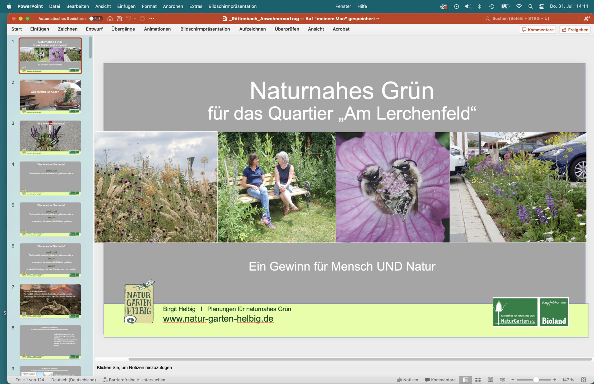 Im Vorfeld der naturnahen Gestaltung gab es einen Vortrag im Rathaussaal für alle Anlieger mit dem Ziel Akzeptanz zu fördern und zum Nachahmen anzuregen