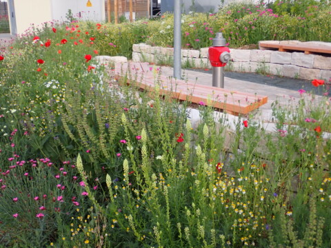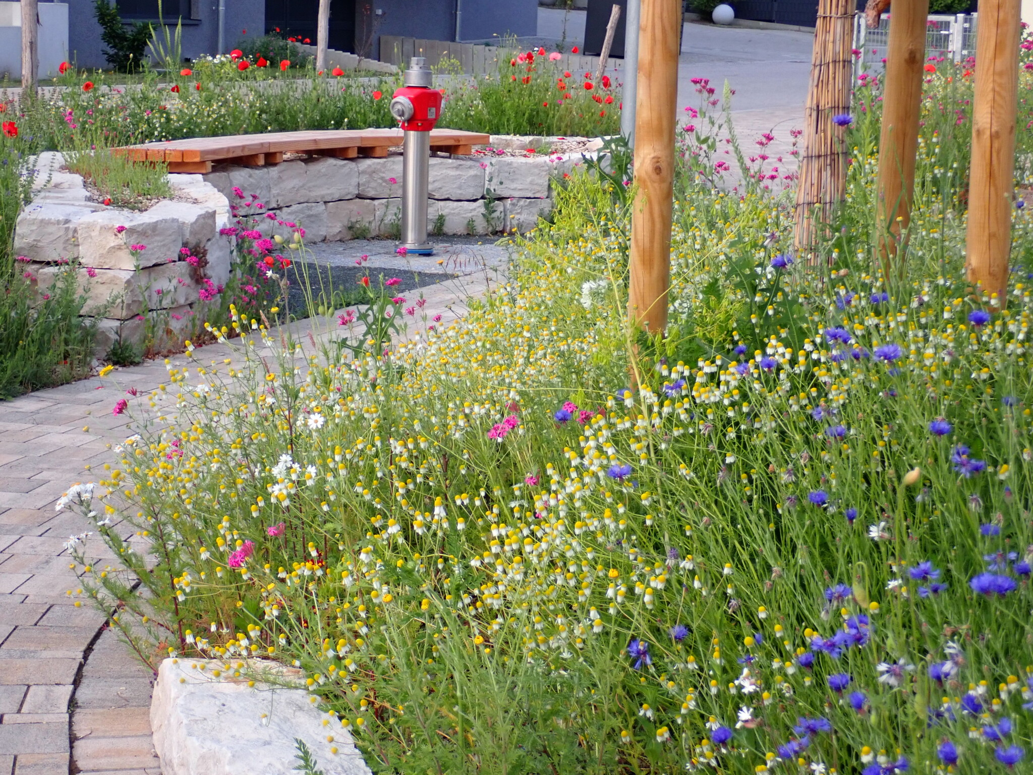 Die gepflanzten Stauden wie Wiesensalbei und Lichtnelke beginnen auch zu blühen
