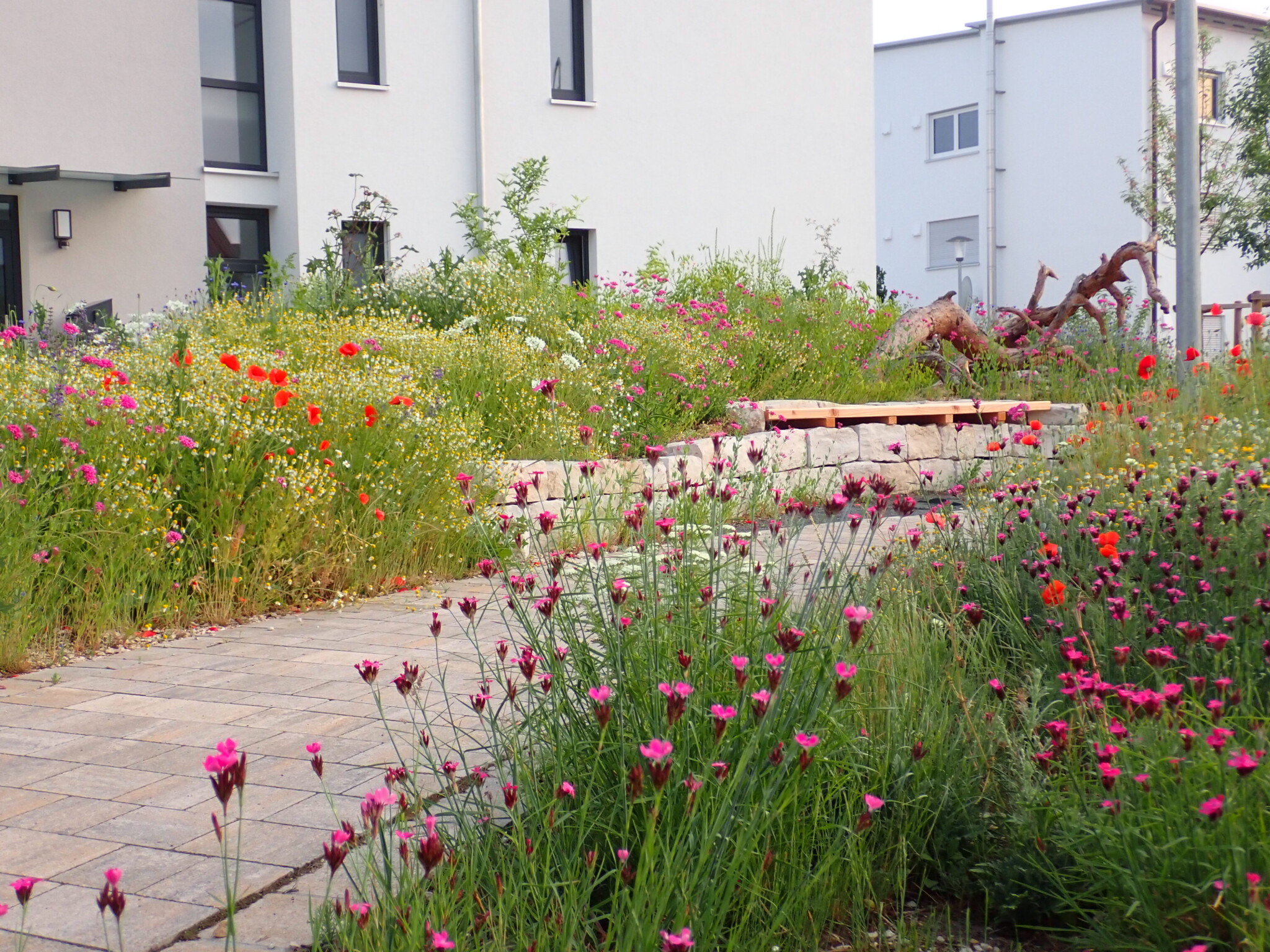 ein Blumenhügel erhebt sich im Neubaugebiet