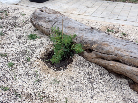 Eine Sanddüne wird vom „Totholzdrachen“ und Lesesteinen gekrönt. Davor Trockenmauern aus regionalen Juraquadern