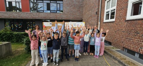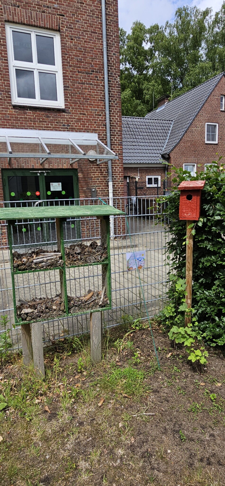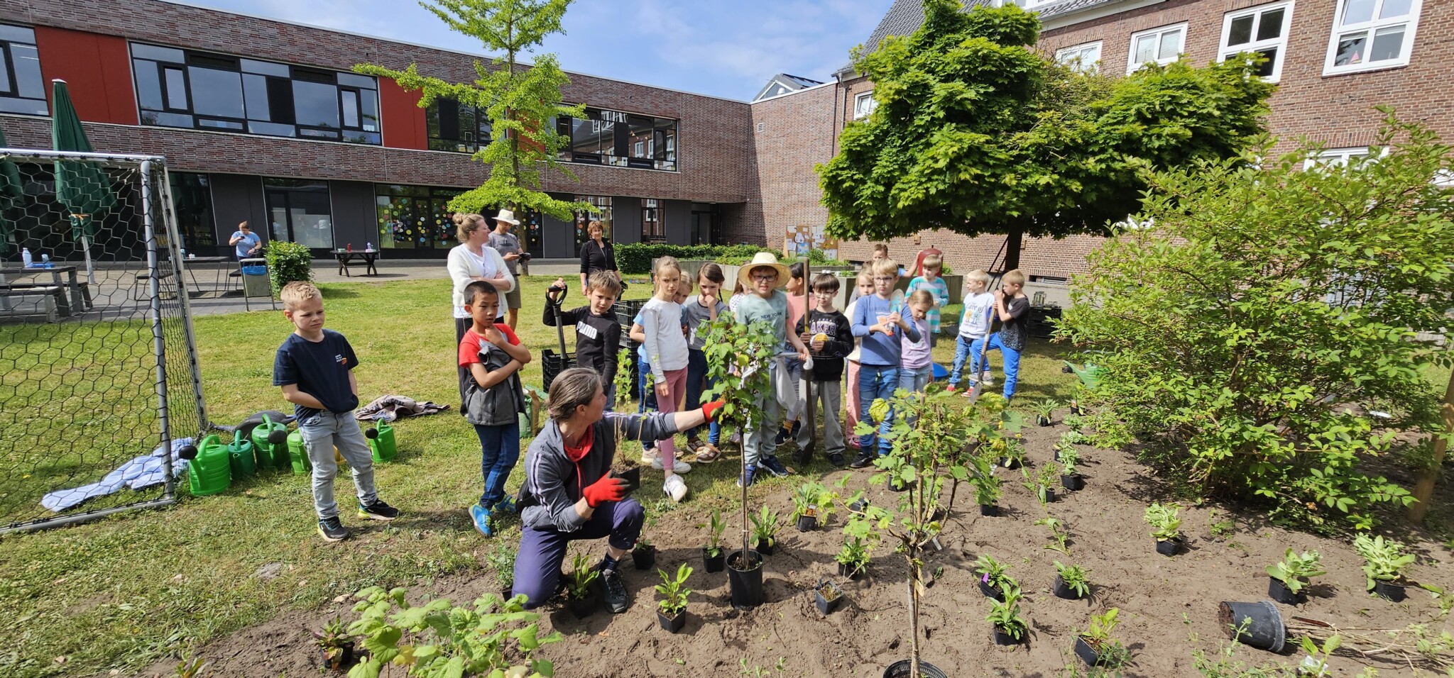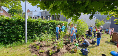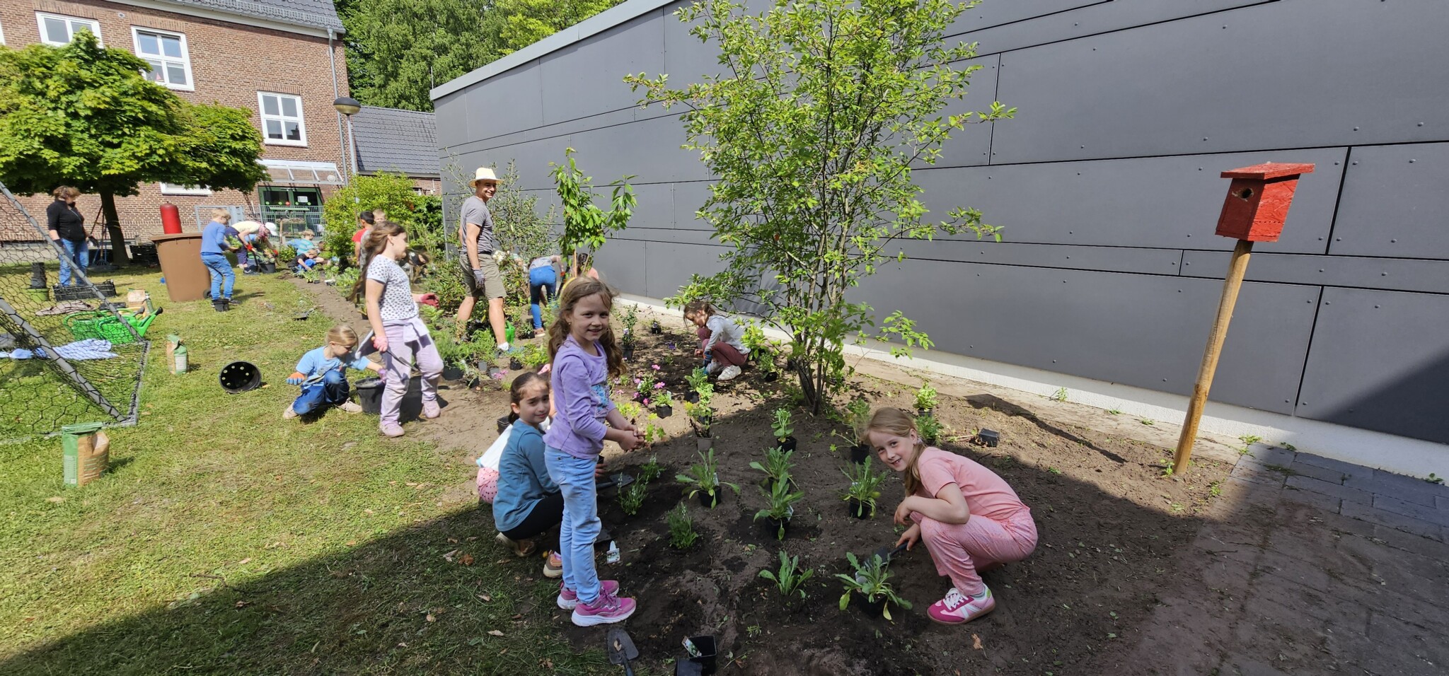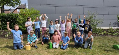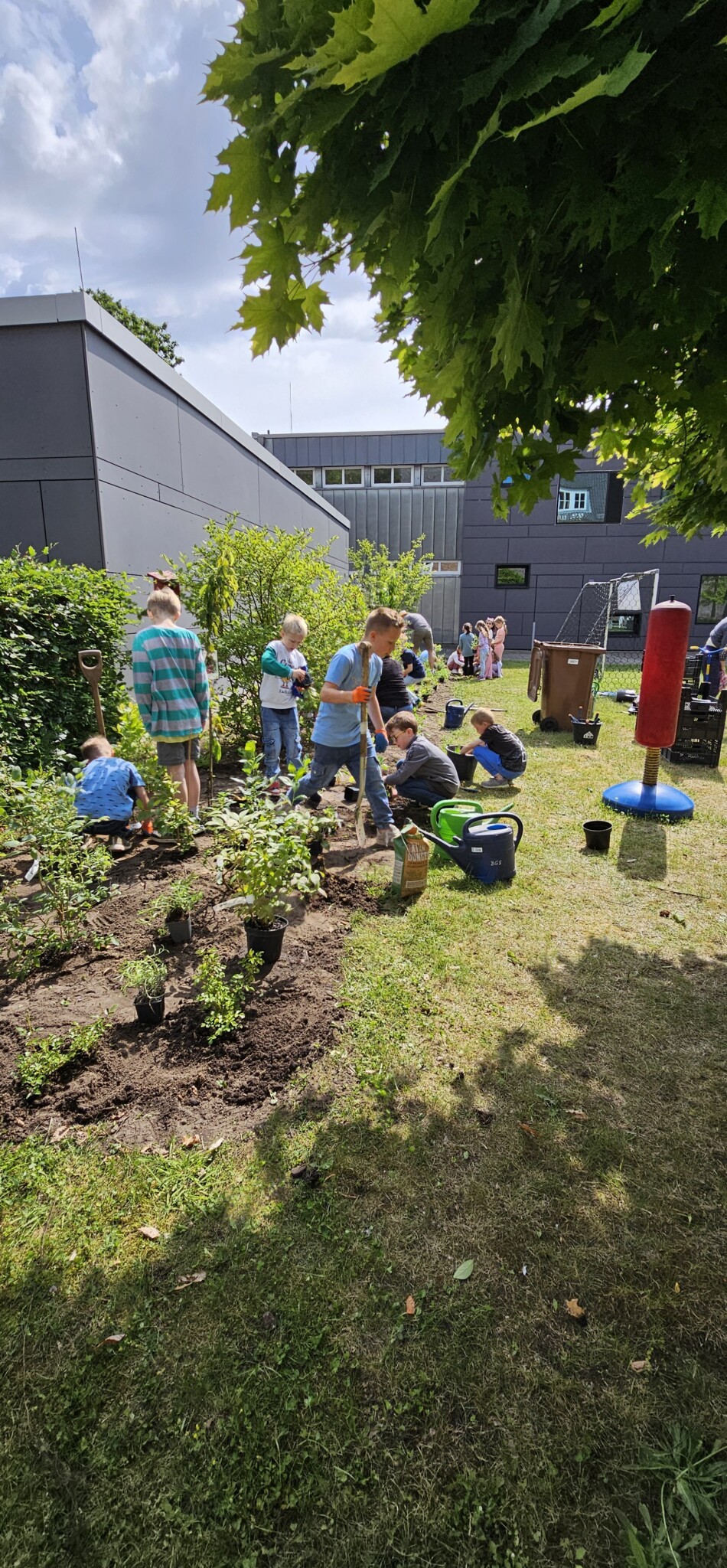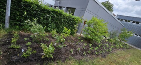 Bei der Pflanzaktion haben die Kinder erst das Unkraut aus allen Pflanzbereichen entfernt und danach fleißig gepflanzt. Vorher haben sie bereits ein Insektenhotel gebastelt sodass der Unterricht zum Thema Biologie nun hervorragend im “Grünen Klassenzimmer“ stattfinden kann 🙂
