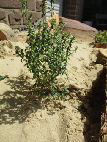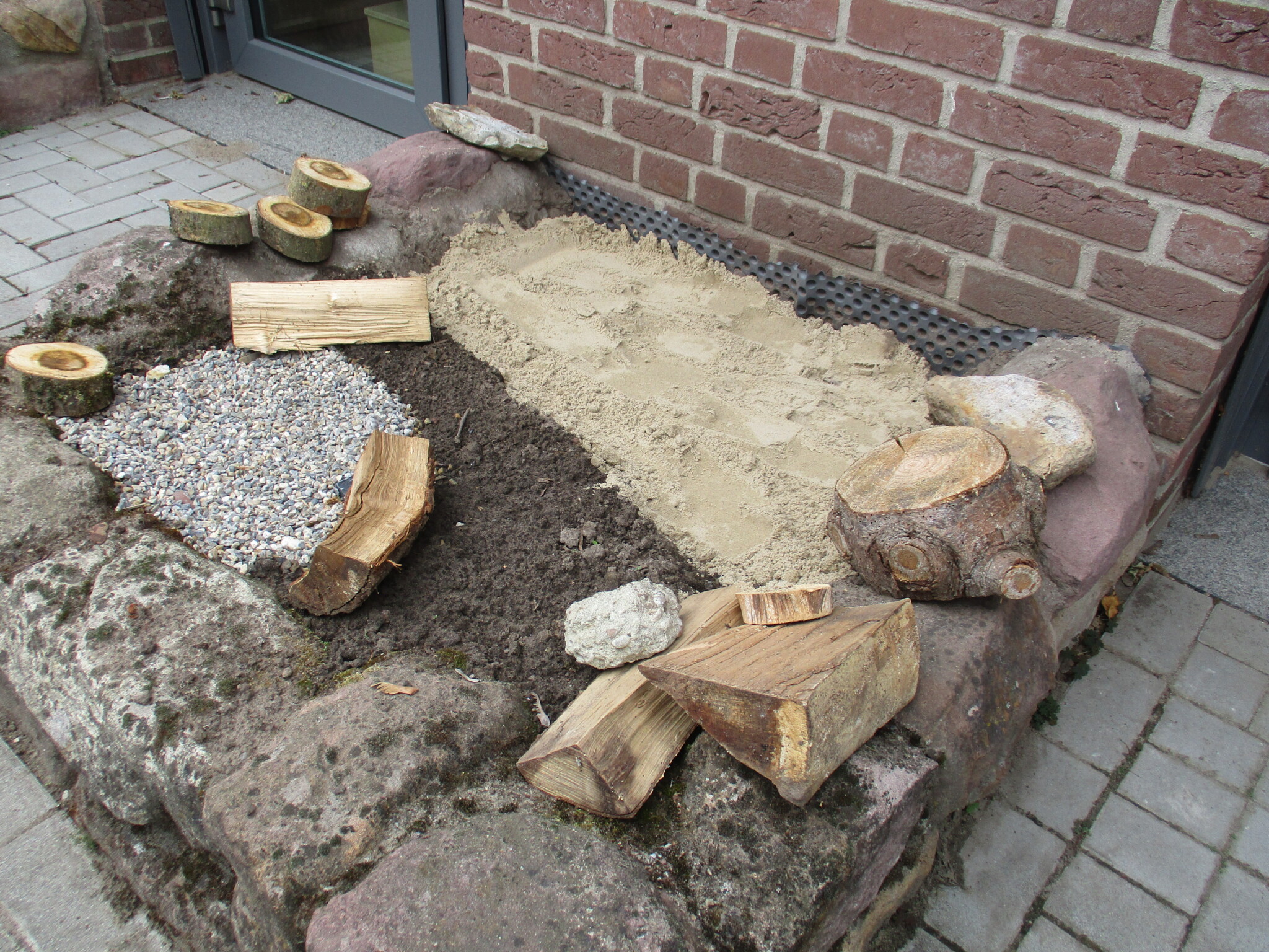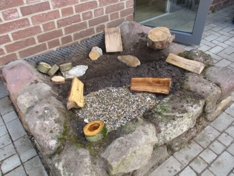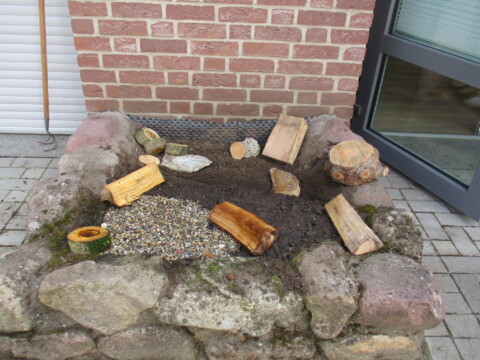 Die Örtlichkeit des Sandarium liegt in einem ruhigen, sonnigen Bereich. Unser Vorhaben ist es, das vorhandene Hochbeet etwas auszukoffern und eine neue Schicht mit Sand anzulegen. Gepflanzt werden sollen Kräuter und Wildblumen für Wildbienen. In einer kleinen Ecke des Sandarium, wird es eine kleine “Bade Oase“ für die Wildbienen geben, die aus Kieselsteinen bestehen wird. Abgerundet wird das Sandarium mit Totholz – in das bohren unsere Kinder kleine Löcher, die als Rückzugsort dienen.
