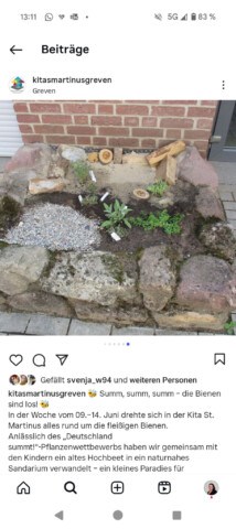 Gemeinsam mit unseren Kita-Kindern möchten wir unseren Innenhof etwas schöner gestalten. – Bedeutet, dass wir neben unserem Apfelbaum und Erdbeerpflanzen ein Hochbeet als Sandarium umfunktionieren, um unter anderem den Bienen einen neuen geschützten Ort bieten zu können.