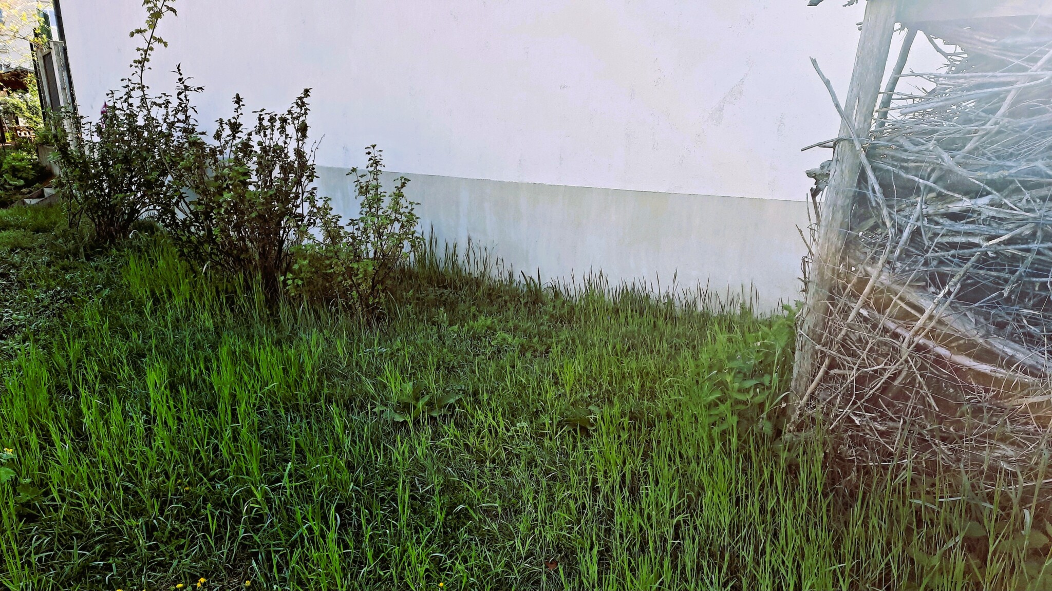 Eine Fläche zwischen Totholzhecke, Beerensträuchern und dem benachbarten Gebäude soll mit insektenfreundlichen einheimischen Pflanzen gestaltet werden.