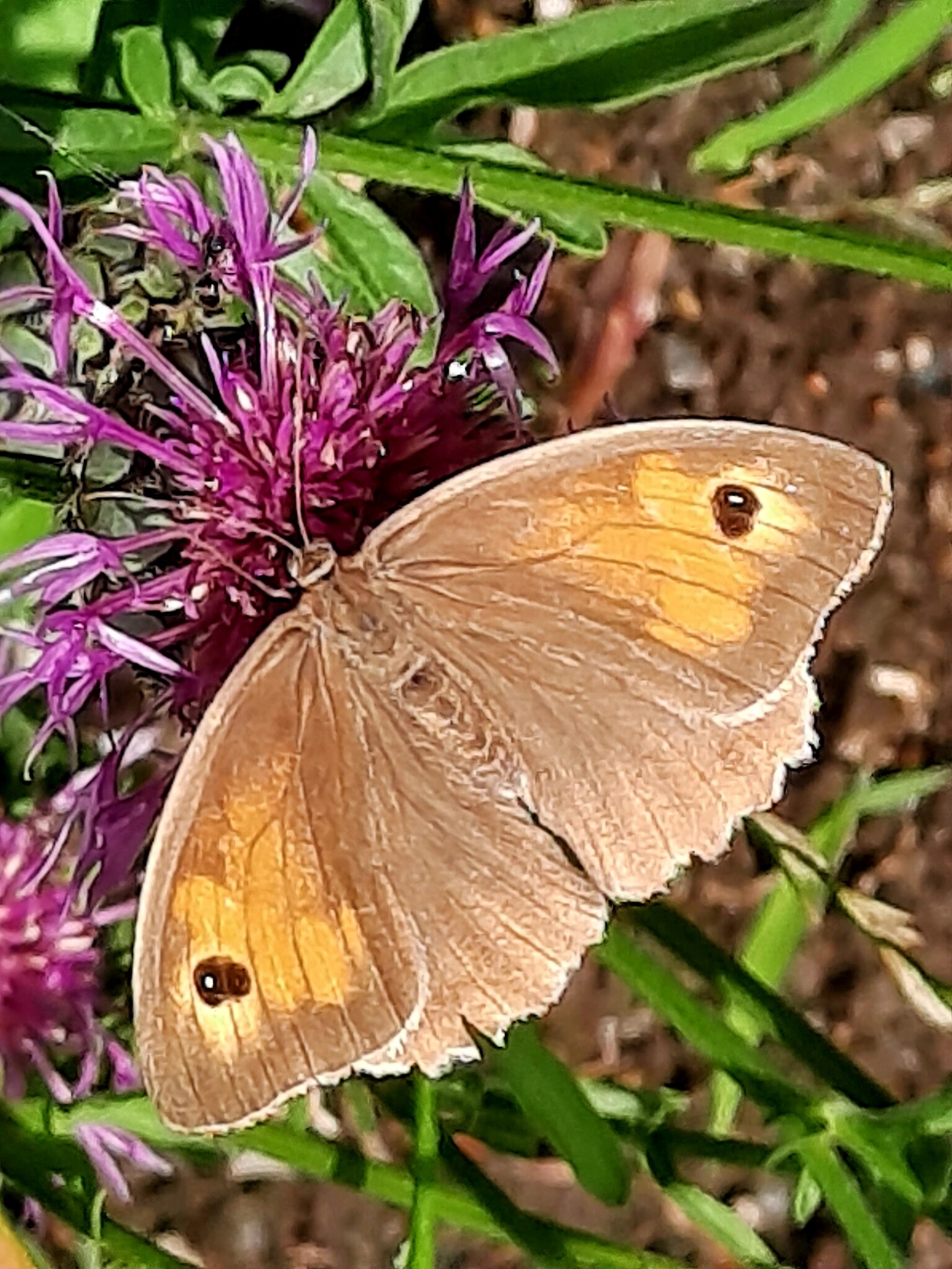 Zwischen unserem neuen Kräuterbeet und der Totholzhecke haben wir Brennnesseln, und Ackerkratzdisteln stehen lassen. Die Insekten finden das gut.