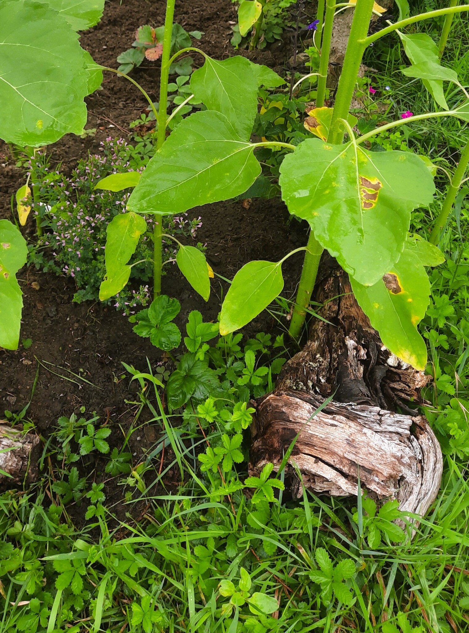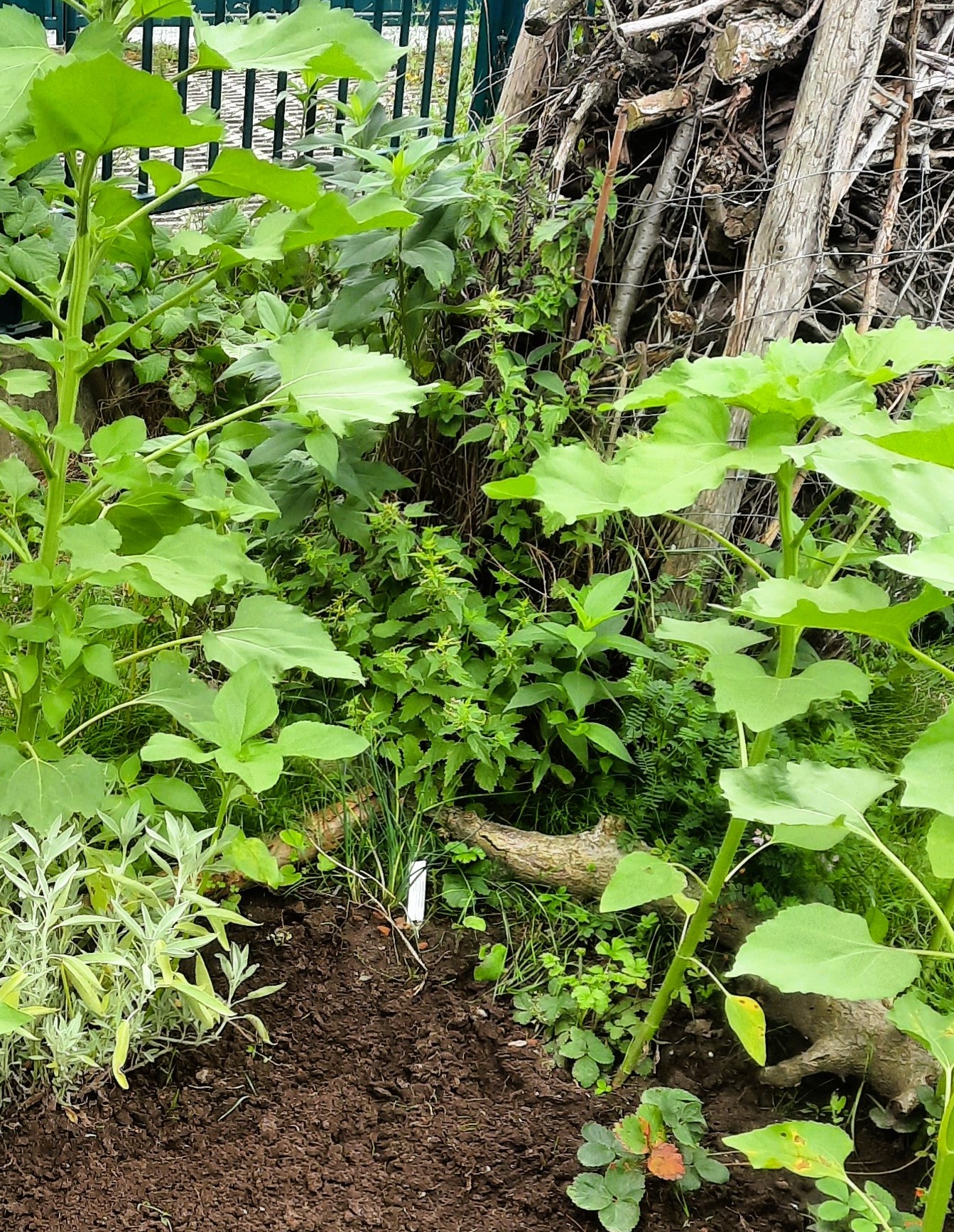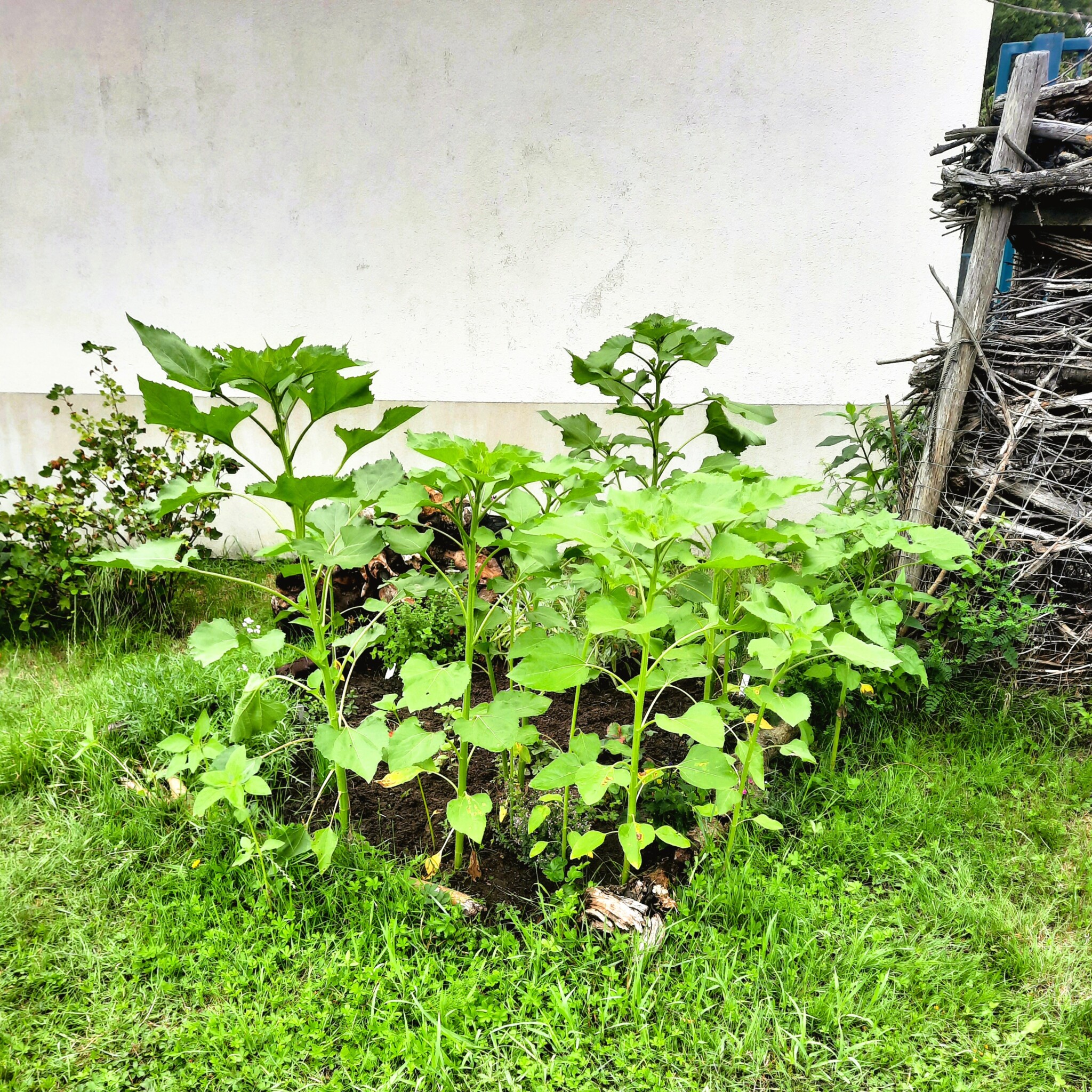 Neben den gepflanzten Kräutern im Beet haben wir vor den Randhölzern Sonnenblumen gesät.