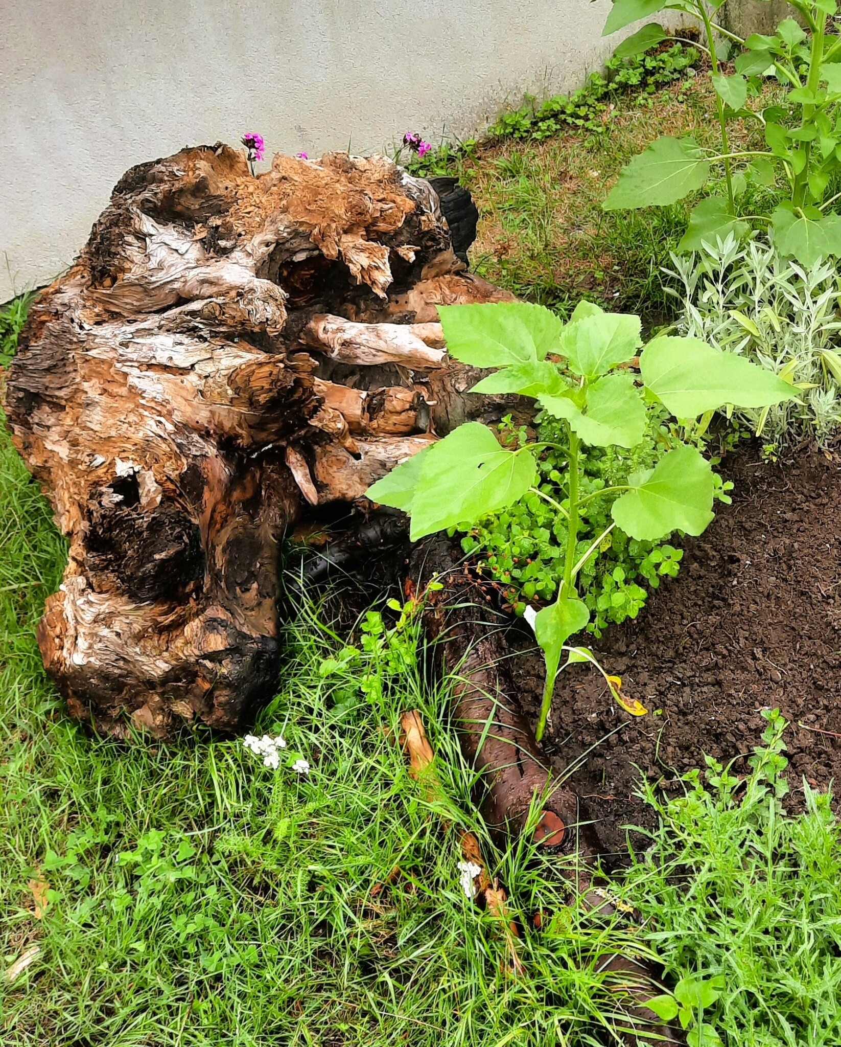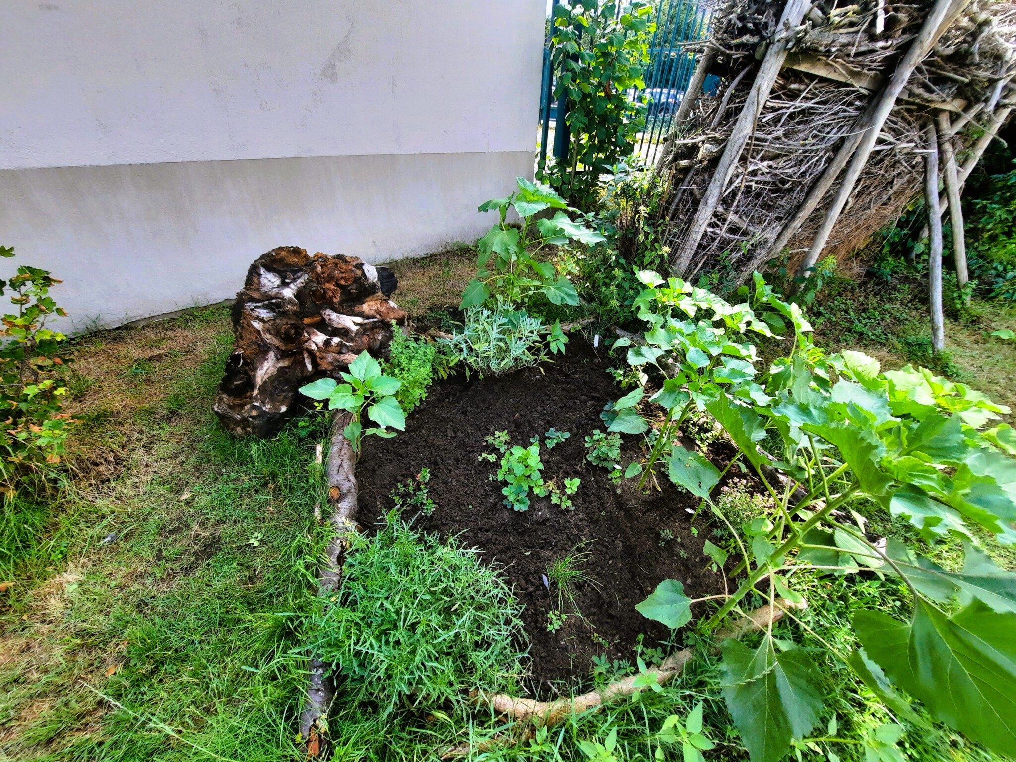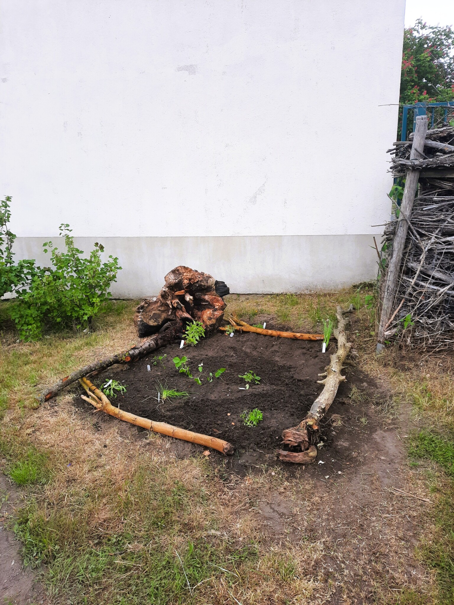 Die Kräuter sind ins frisch angelegten Beet gepflanzt und als Rahmen haben wir alte Obstbaumäste und eine große Wurzel genommen.