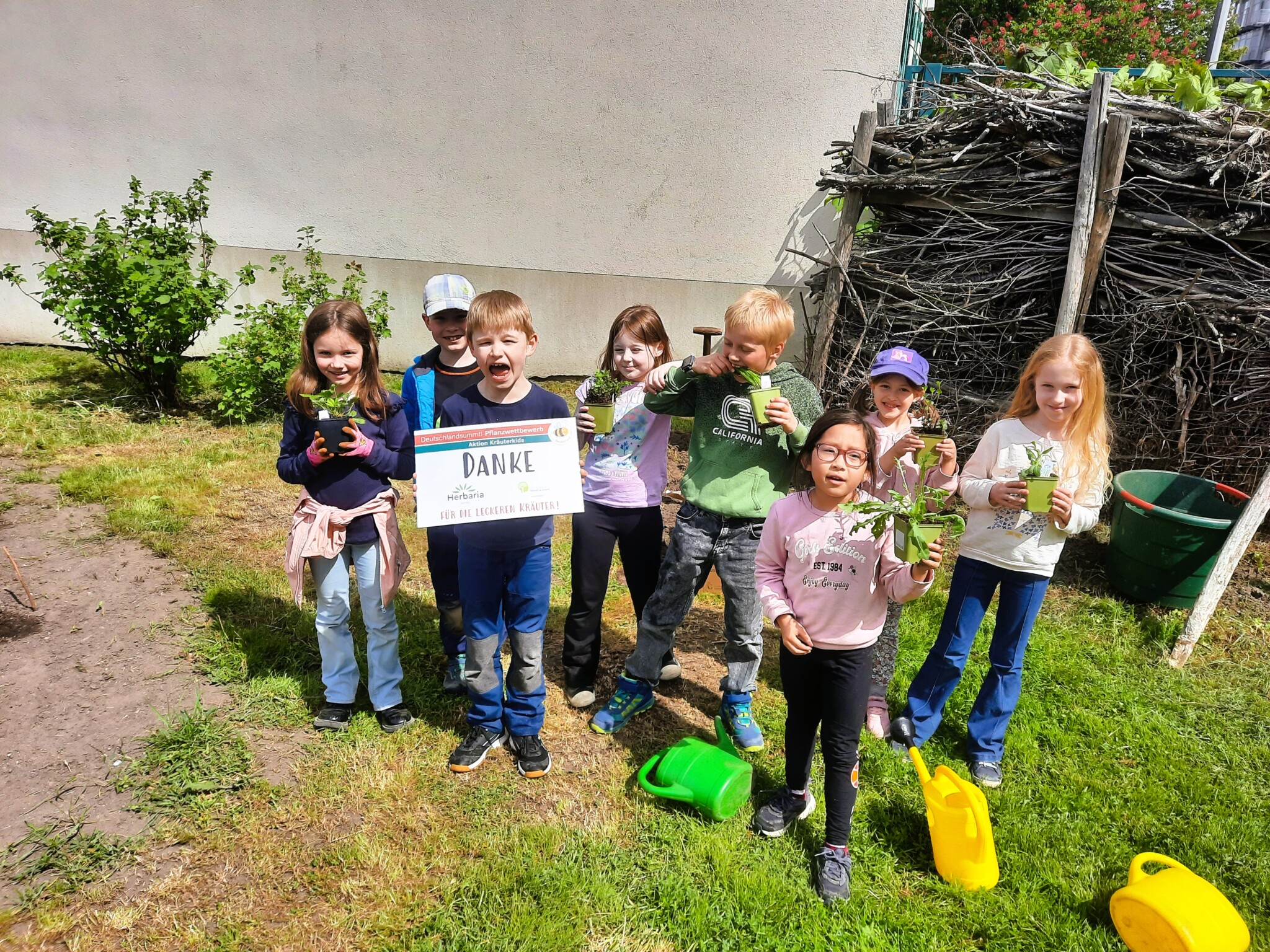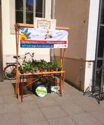 Die Kleingärtner:innen stellten das Werbe-Banner für den Pflanzwettbewerb „Deutschland summt!“ und Pflanzen für unseren Verkaufsstand beim Schulfest zur Verfügung. Der Erlös ging an den Förderverein der Schule.