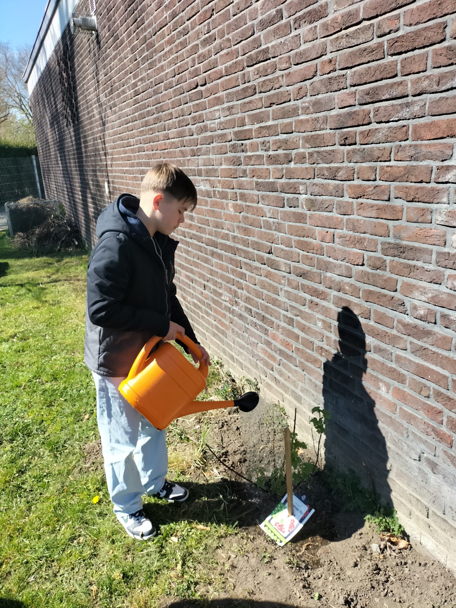 Piet gießt die neu gepflanzte JohannisbeereDas neue Staudenbeet