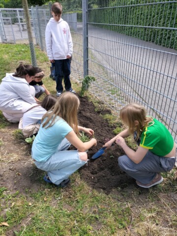 Die Schulgarten-AG mit 16 Kindern und Jugendlichen verschiedener Nationalitäten gestaltet den kleinen Schulgarten bienen- und insektenfreundlicher um.