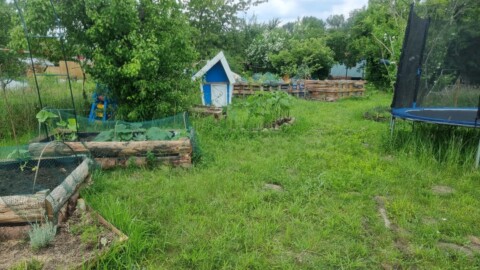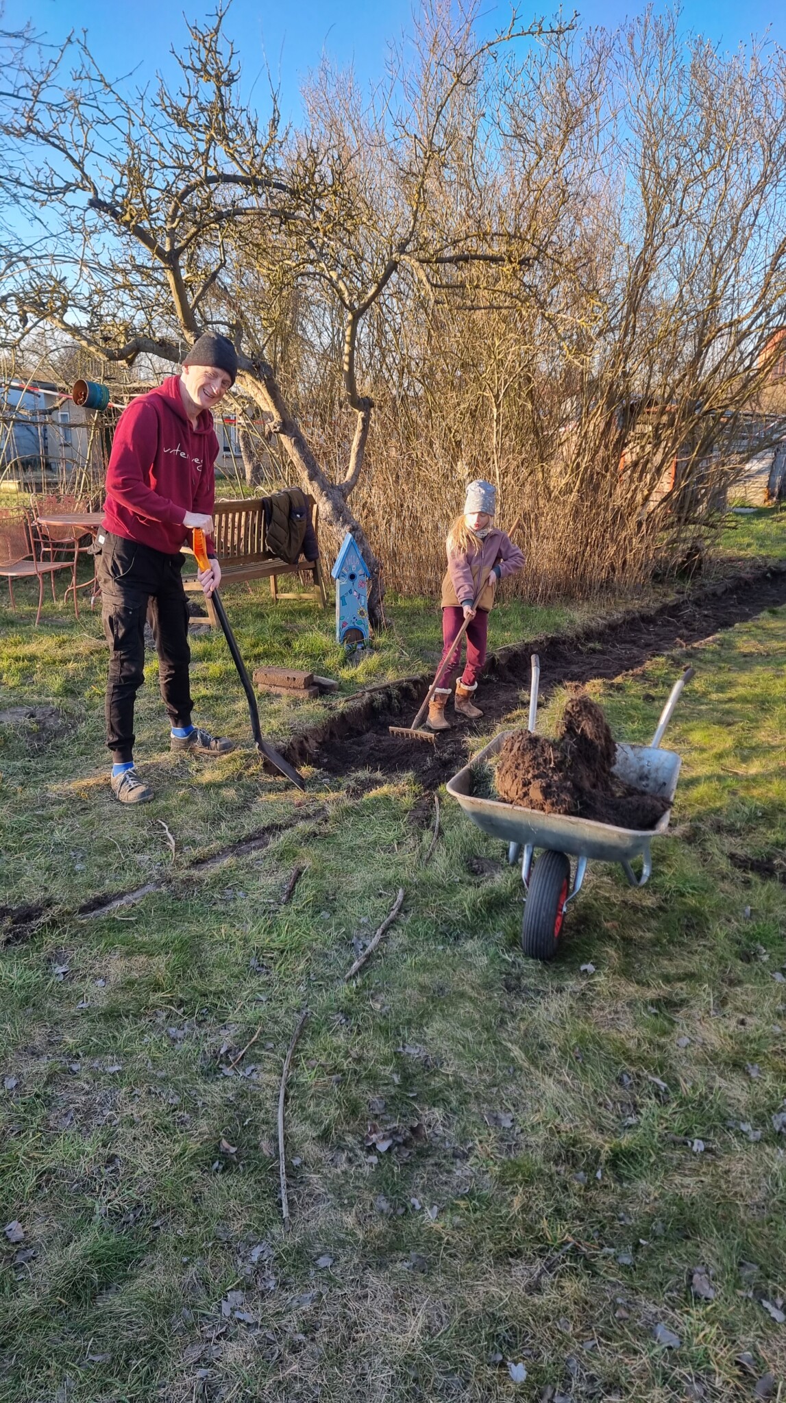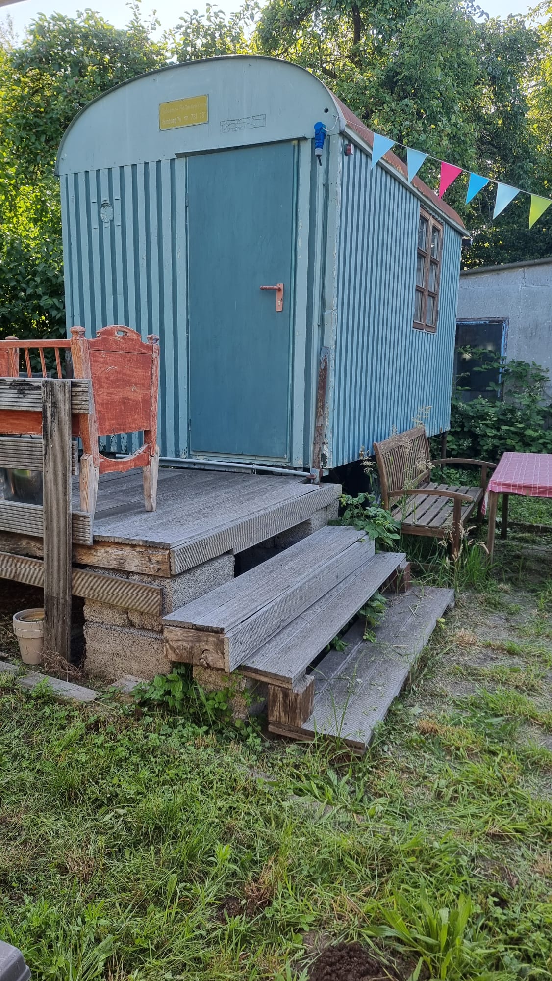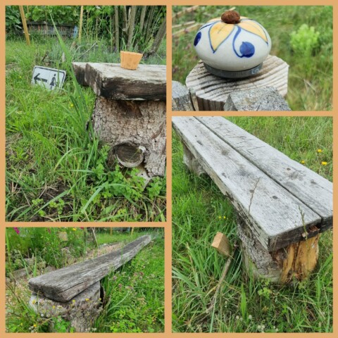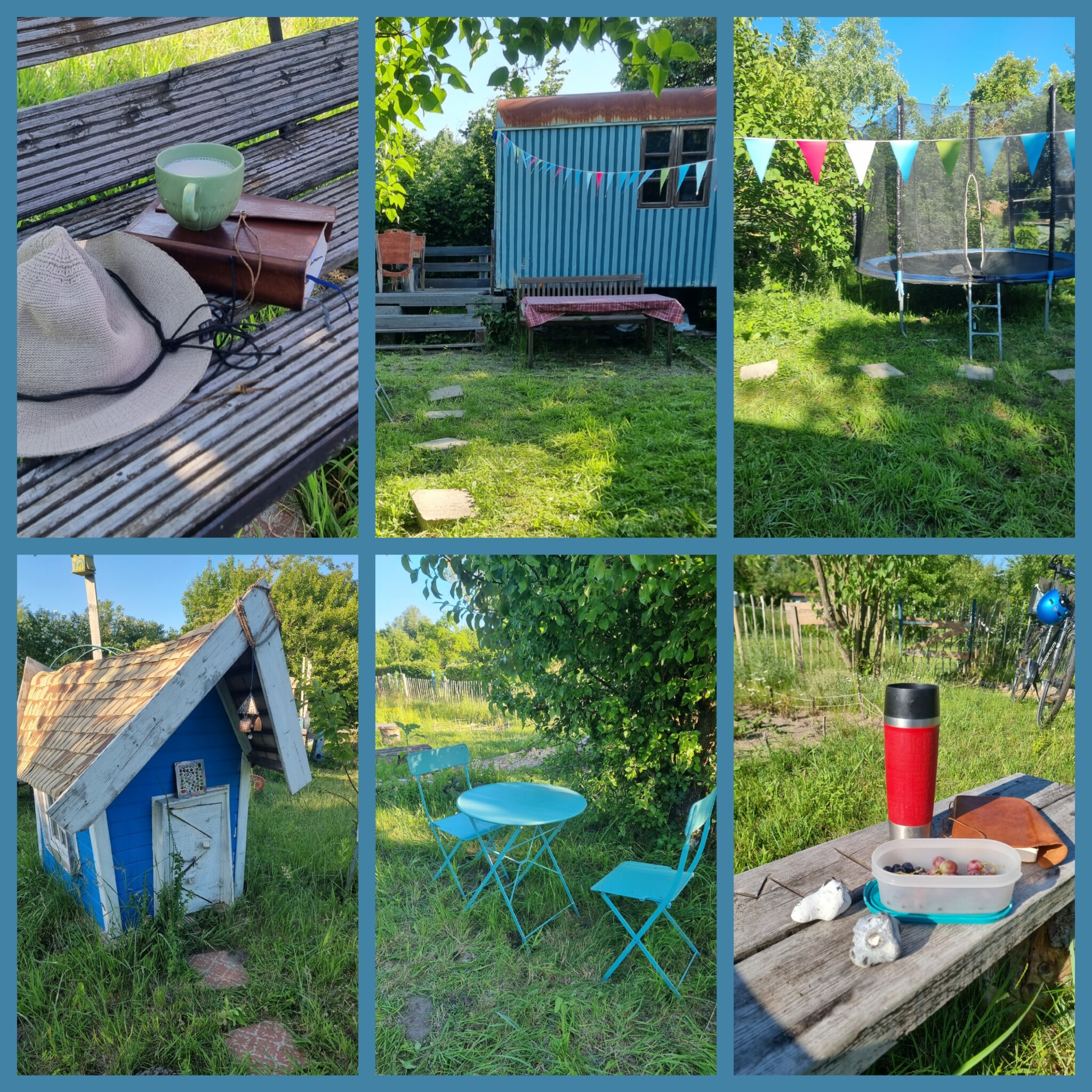 Statt eines Pavillons haben wir Ende Februar ein Weiden-Pavillon angelegt über einer Sitzgruppe mit 6-8 Sitzplätzen. Es hat gut ausgetrieben und bald wird es uns Schatten spenden beim Essen. Eine alte robuste DDR-Hollywoodschaukel steht unter dem Birnbaum. Das ist der Lieblingsplatz: Wenn Carlotta von der Schule kommt, wird erst einmal dort geschaukelt und angekommen und auch sonst treffen wir uns alle immer wieder dort. Ein paar “Holzbänke“ wurden uns geschenkt, mit der wir nun schon öfters mit bis zu 20 Leuten saßen. Und hinter den Sträuchern steht unser selbst ausgebauter Bauwagen, ein altes Viehtransporthäuschen für Werkzeuge und Klo und ein Trampolin – das darf nicht fehlen 😉