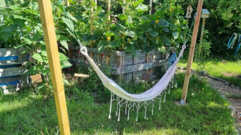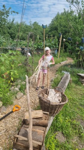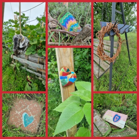Uns war von vornherein wichtig, Naturmaterialien zu nutzen und kein Plastik, Chemniedüngung oder Anderes. Die Hochbeete zum Gärtnern haben wir deshalb aus Holz und Paletten gebaut, die Beetbegrenzungen aus Steinen, Holz oder geflochtener Hasel. Vorne zwei mittelgroße Beete mit drei kleineren Beeten, dann weiter durch drei hohe Paletten-Hochbeete mit auch drei kleineren, niedrigeren Beeten. Fünf weitere Beete ergänzen unsere Beetsammlung.