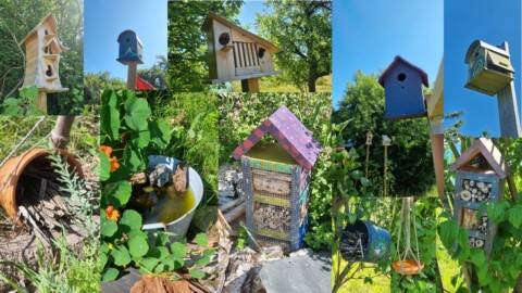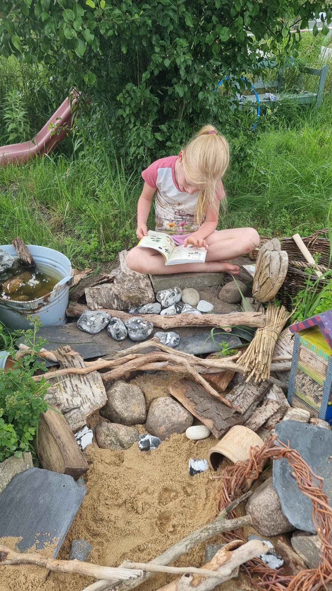 Unserer Tochter war wichtig, einen eigenen Garten zu bewirtschaften. Dort steht nun ihr kleines, blaues Hexenhäuschen und einige Obststräucher und ein buntes Blumenbeet. Direkt daneben hat Carlotta ein Sandarium gebaut: Sie hat es selbst geplant (welche Materialien brauche ich dafür?), und bis auf die Entfernung der Grasnarbe alles alleine umgesetzt und dekoriert. Ganz besonders originell ist der “Guckplatz“ direkt dabei: Ein erhöhter Stein, auf dem sie seitdem regelmäßig sitzt und den vielen Hummeln und Schmetterlingen zuschaut. Ideal ist der Standort des Sandariums direkt zwischen den Beeten und inmitten des Dosts. Natürlich durfte das kleine Insektenbuch nicht fehlen, mit dem sie und die anderen Kinder dann versuchen, die gesichteten Exemplare zu bestimmen.