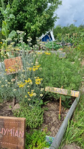 Die elf kleinen Beete haben wir deshalb so angelegt, damit wir durch verschiedene Bodenbeschaffenheit, Sonneneinstrahlung und Feuchtigkeit für die verschiedenen Pflanzen unterschiedliche Lebensbedingungen schaffen konnten. So gibt es z.B. das trockene, sandige Beet in der prallen Sonne für mediterrane Kräuter, ein Beet direkt um den Wasserhahn herum im Halbschatten für feuchtigkeitsliebende Pflanzen wie Baldrian und Pfefferminz, usw.