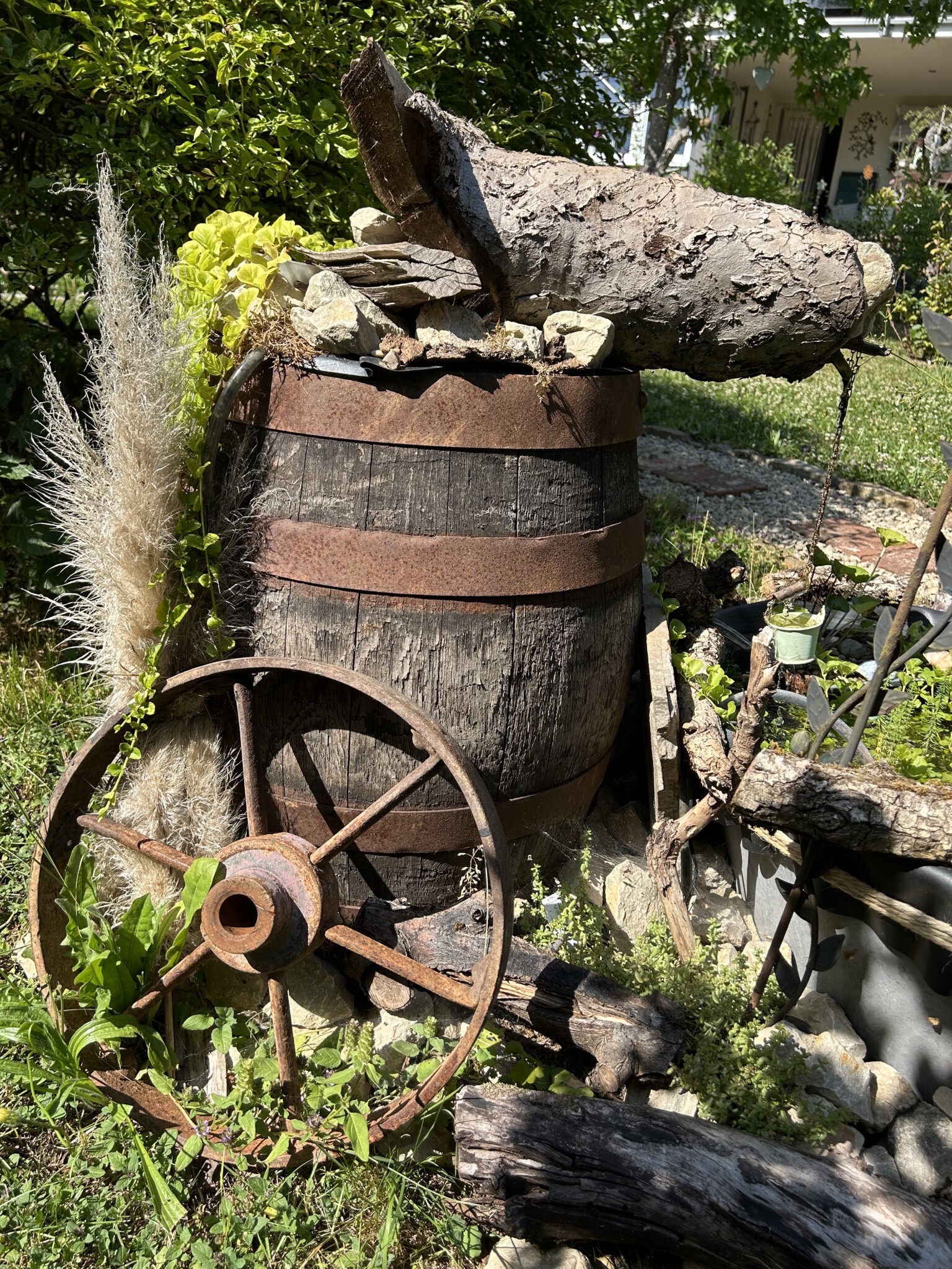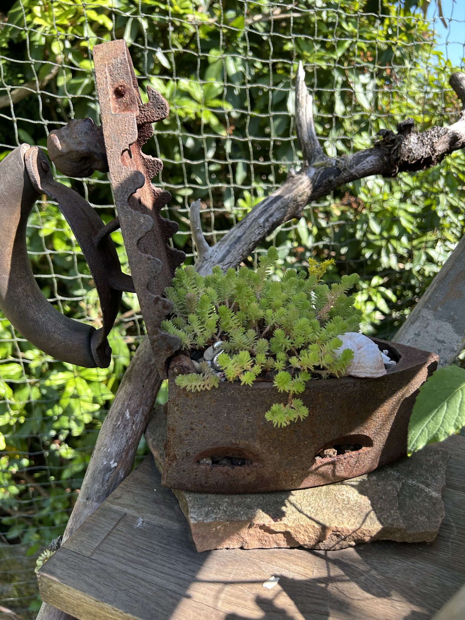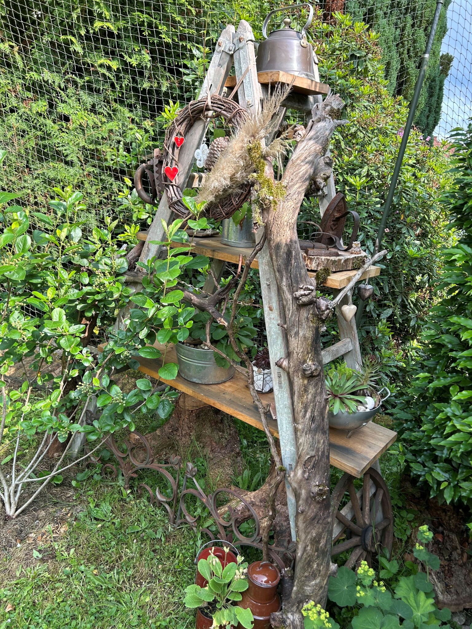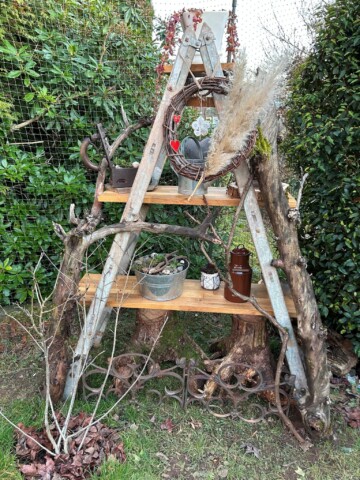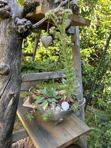 Ich habe die Liebe zu altem Trödel als Deko bei mir entdeckt und wo es geht mit Pflanzen bepflanzt. Zum Beispiel eine alten Kuchenform, Bügeleisen oder Seihschüssel. Das meiste steht auf einer ausgestellten alten Holzleiter wo zusätzlich wieder Totholzäste drangelehnt wurde und darunter zwei Wurzelstöcke stehen.