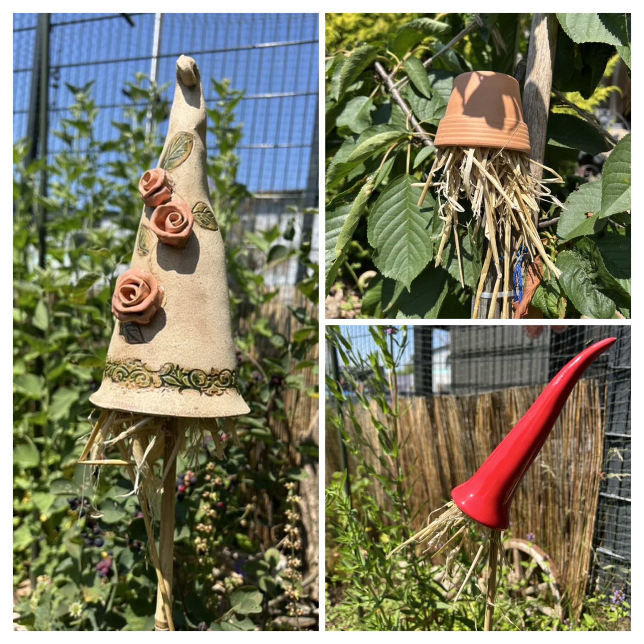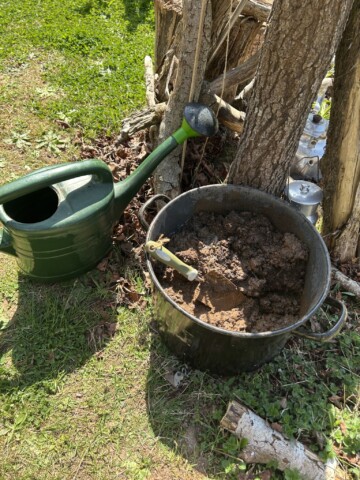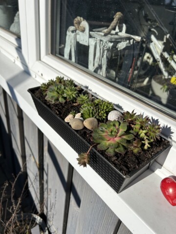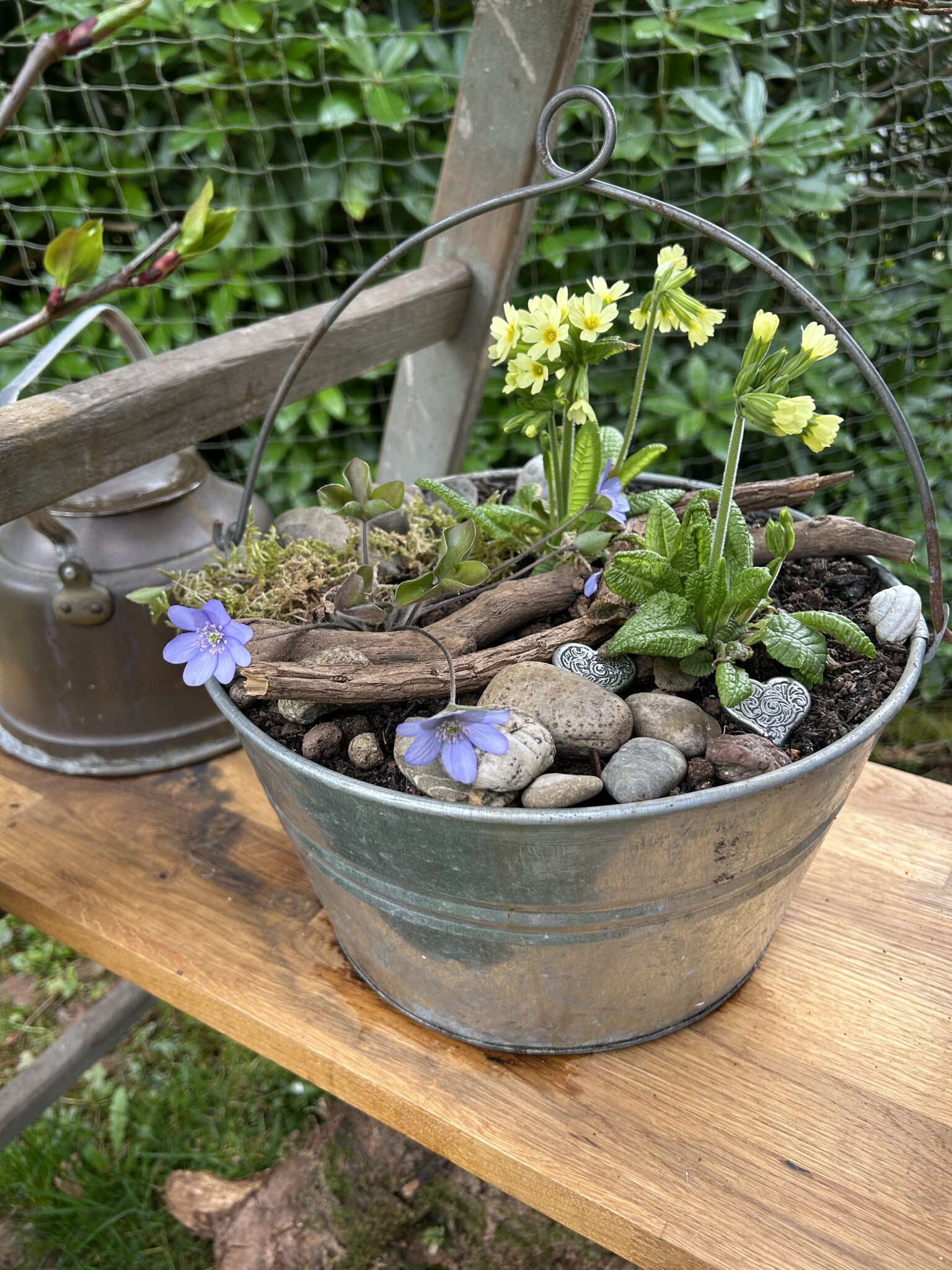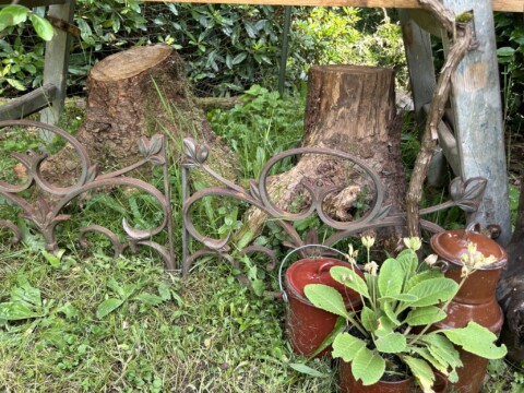Ich habe die Liebe zu altem Trödel als Deko bei mir entdeckt und wo es geht mit Pflanzen bepflanzt. Zum Beispiel eine alten Kuchenform, Bügeleisen oder Seihschüssel. Das meiste steht auf einer ausgestellten alten Holzleiter wo zusätzlich wieder Totholzäste drangelehnt wurde und darunter zwei Wurzelstöcke stehen.