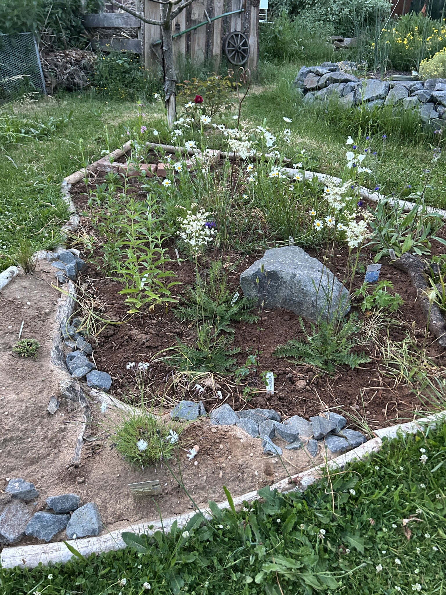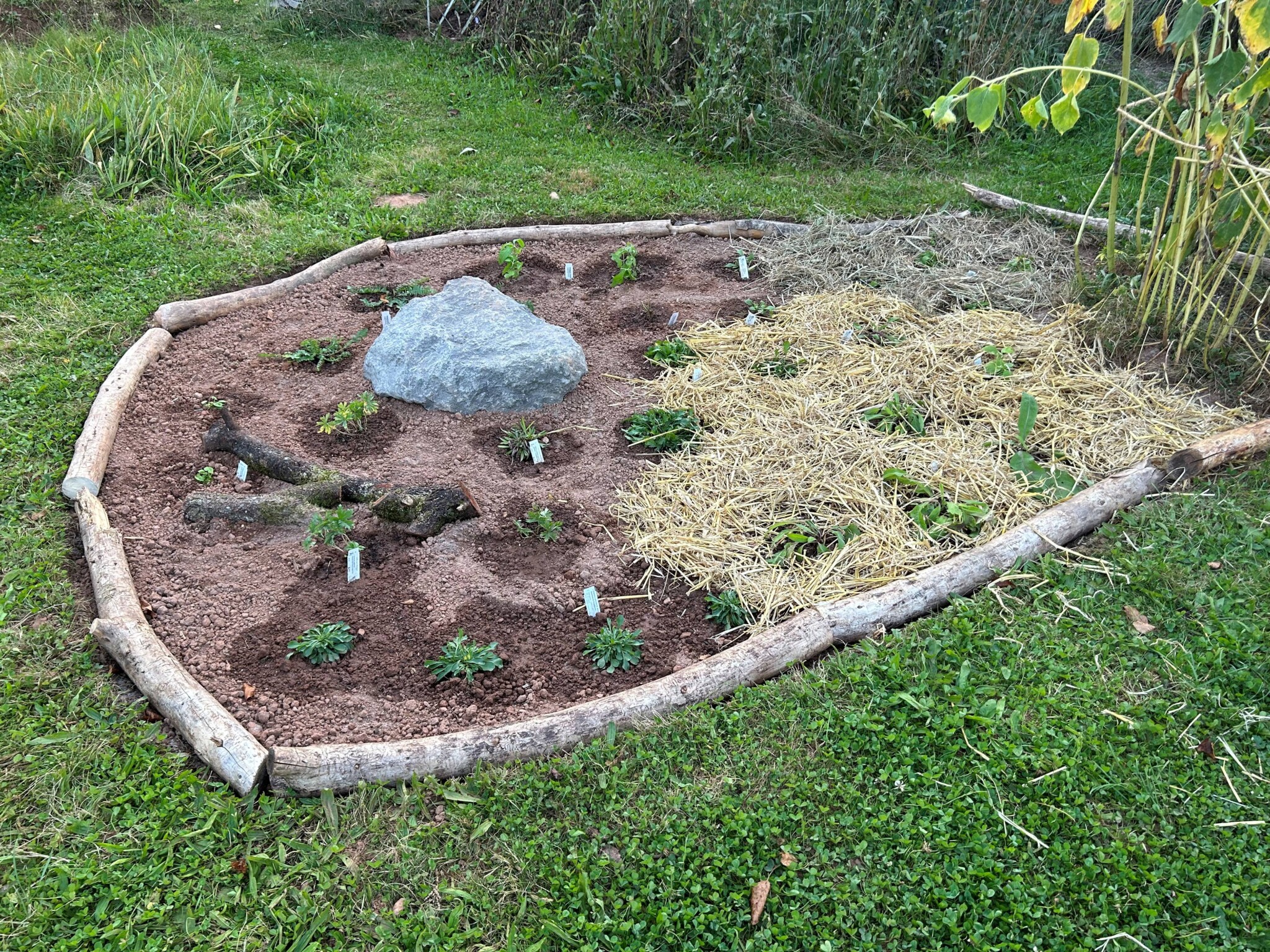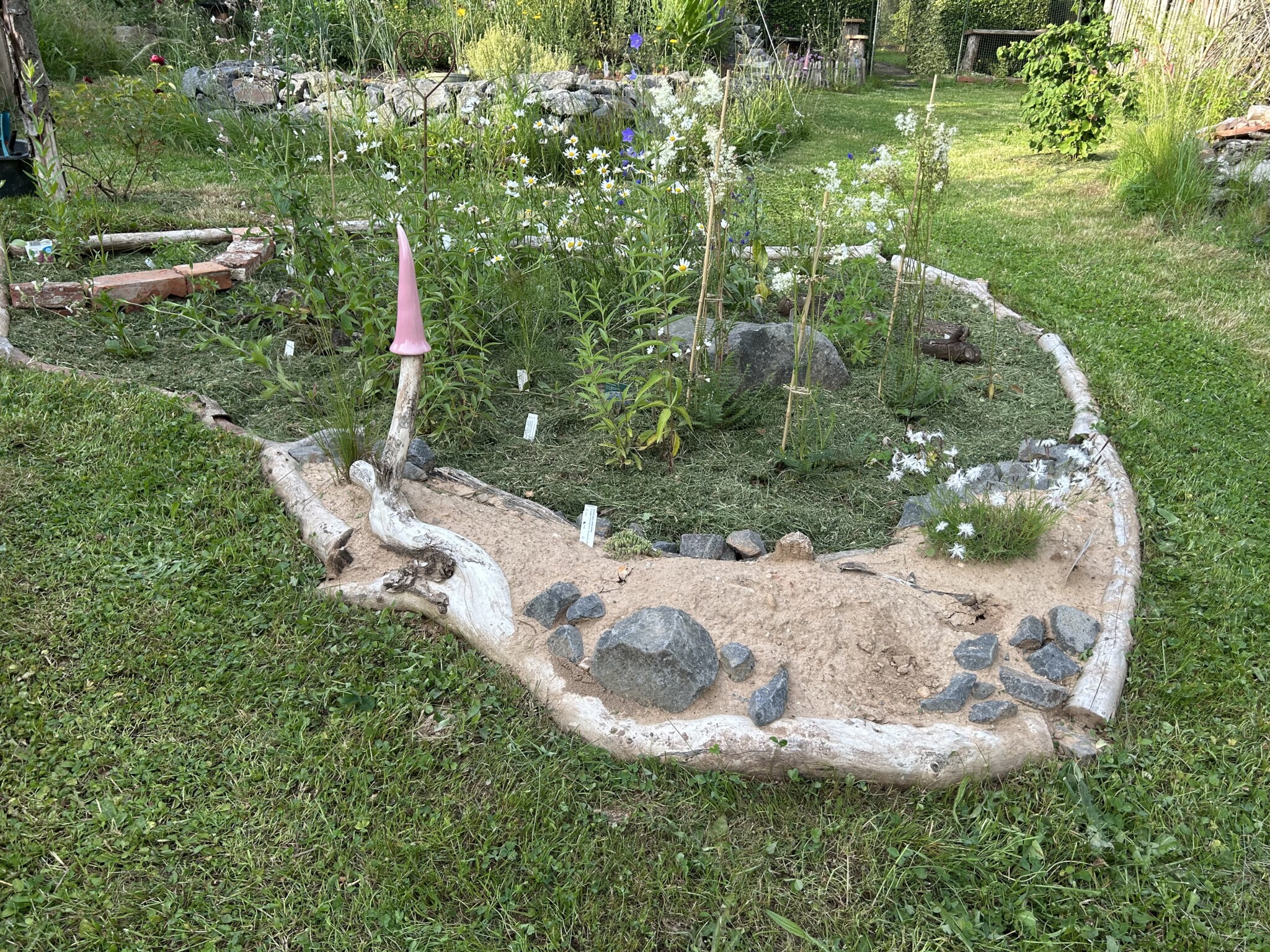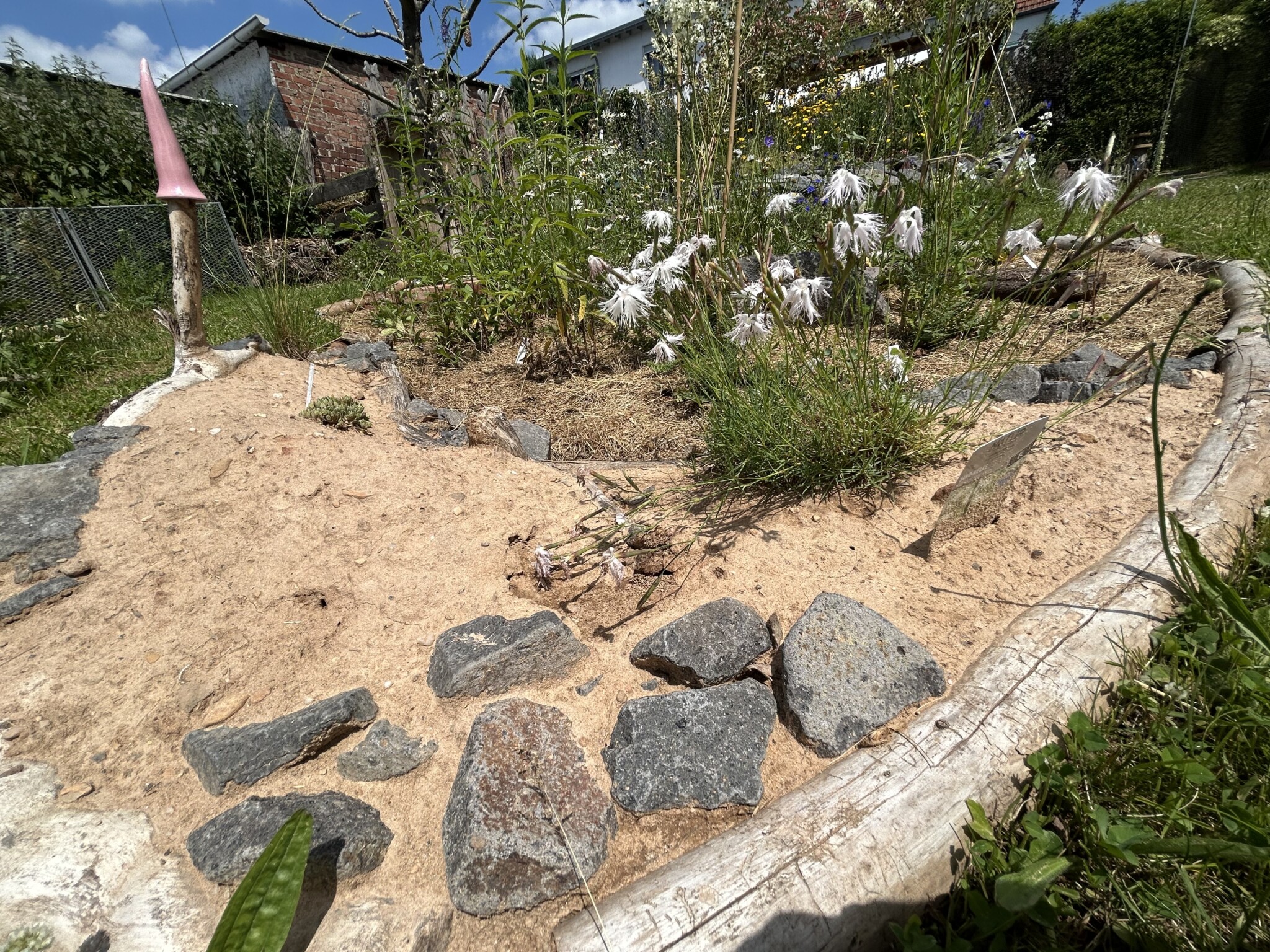 Ein neues Staudenbeet wurde angelegt und ein Vorhandenes vergrößert. Dafür wurde die Grasnarbe abgetragen und an anderer Stelle aufgesetzt zu einen kleinen Hügel. Etwas Sand untergegraben, Holzstämme als Abgrenzung zur Wiese verlegt, ein paar Steine und Totholz hinzugefügt und mit einheimischen Pflanzen wie z.B. kleines Mädesüß, Kugelblume, Wiesenstorchschnabel, Heilziest, weiße Lichtnelke, Teufelskralle, pfirsischbl. Glockenblume oder die Perückenflockenblume gepflanzt. Ca. 280 Blumenzwiebeln wie Krokusse, Narzissen und Wildtulpen gesetzt und im Frühjahr noch Mohn eingesäht. Bei einem Beet hab ich im Frühjahr noch ein Sandarium mit Sand aus einer Baugrube von einem Hausbau ergänzt. Und in einer Ecke wurde mit alten Ziegelsteinen ein Bereich abgetrennt damit bei Regen sich etwas das Wasser sammelt und feuchter bleibt. Für den Blutweiderich, großer Wiesenknopf und Kuckuckslichtnelke.