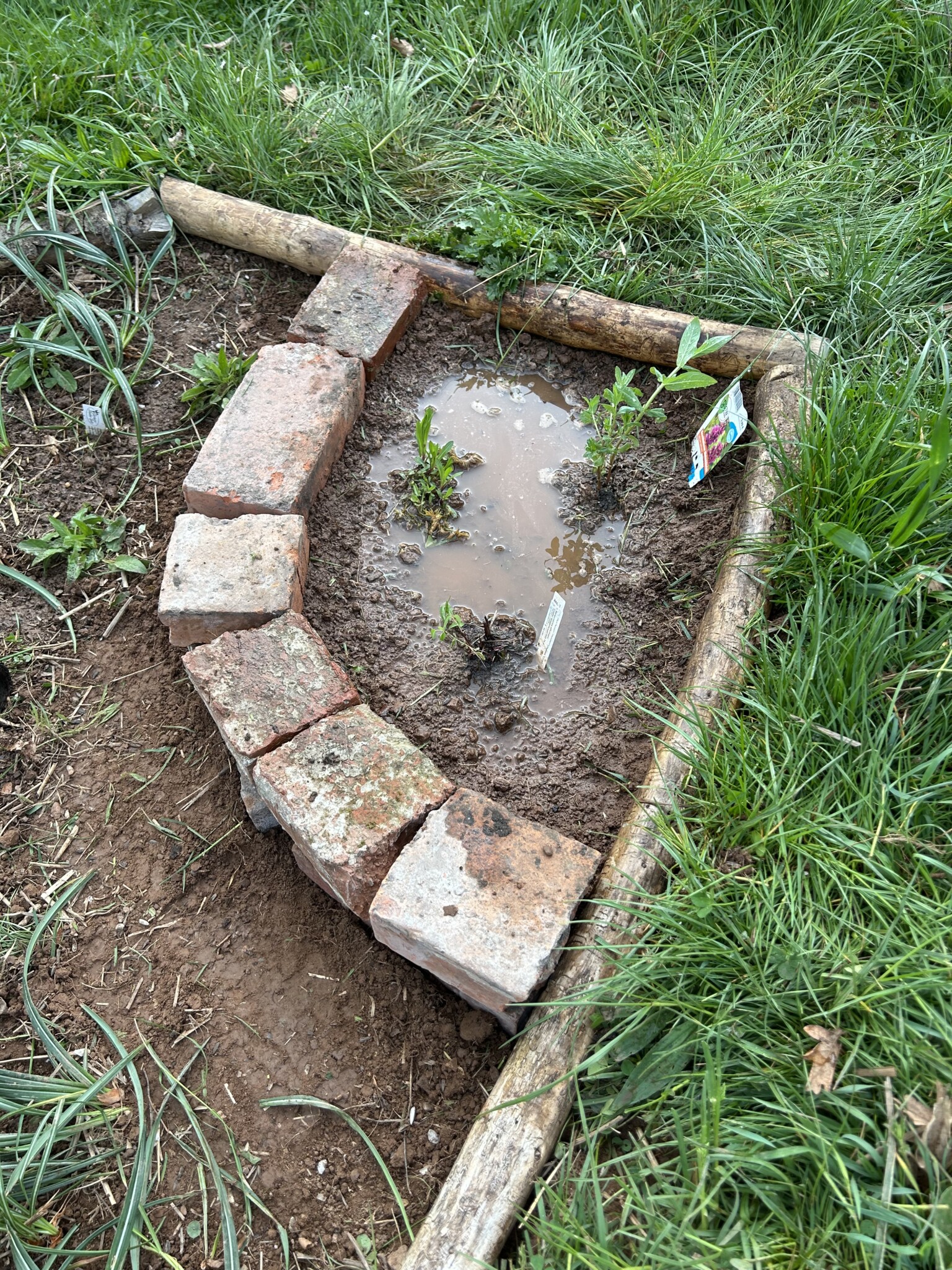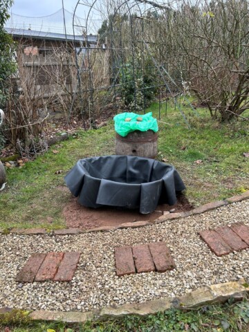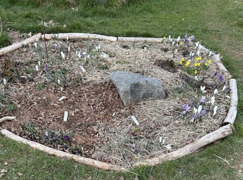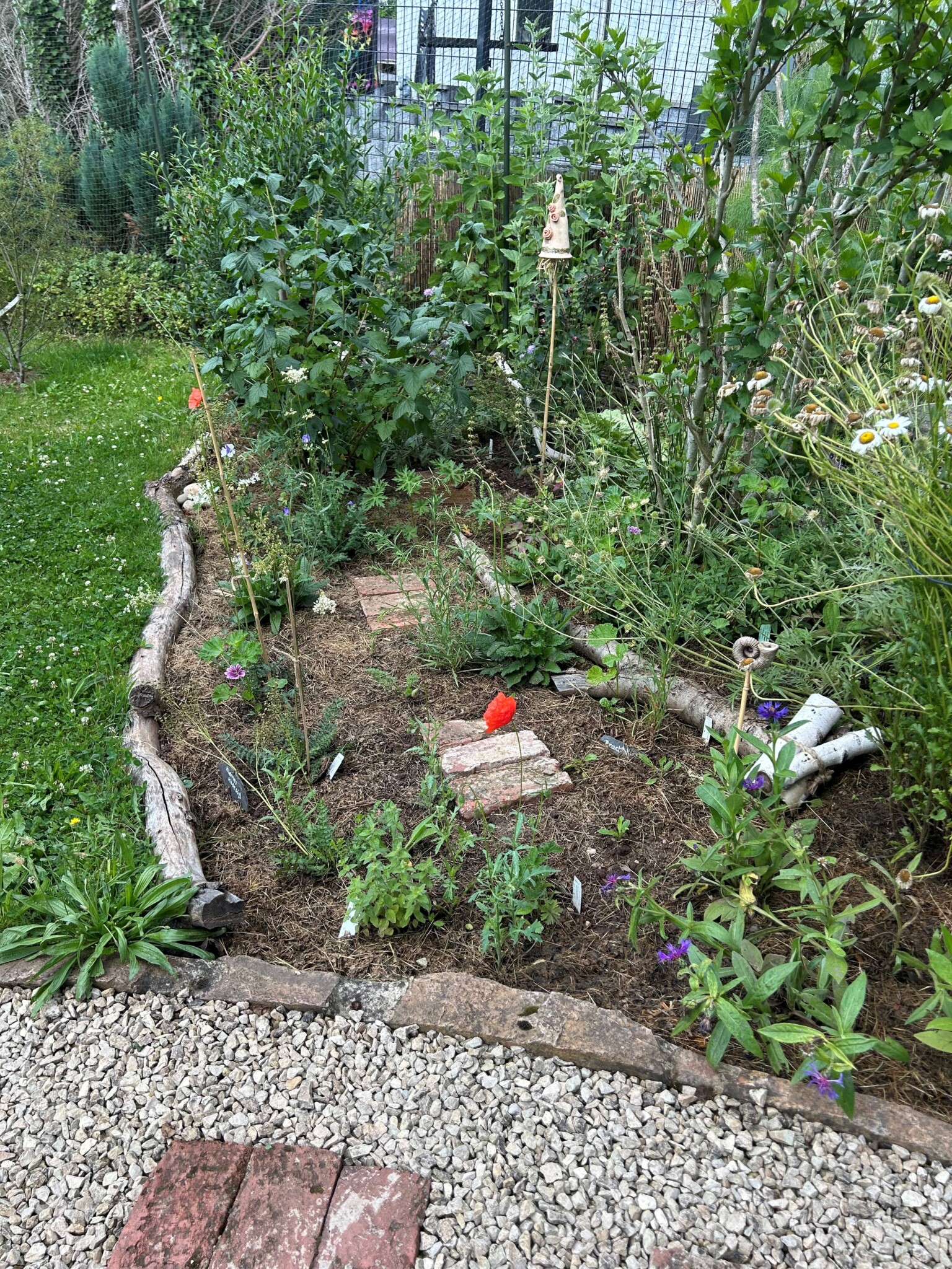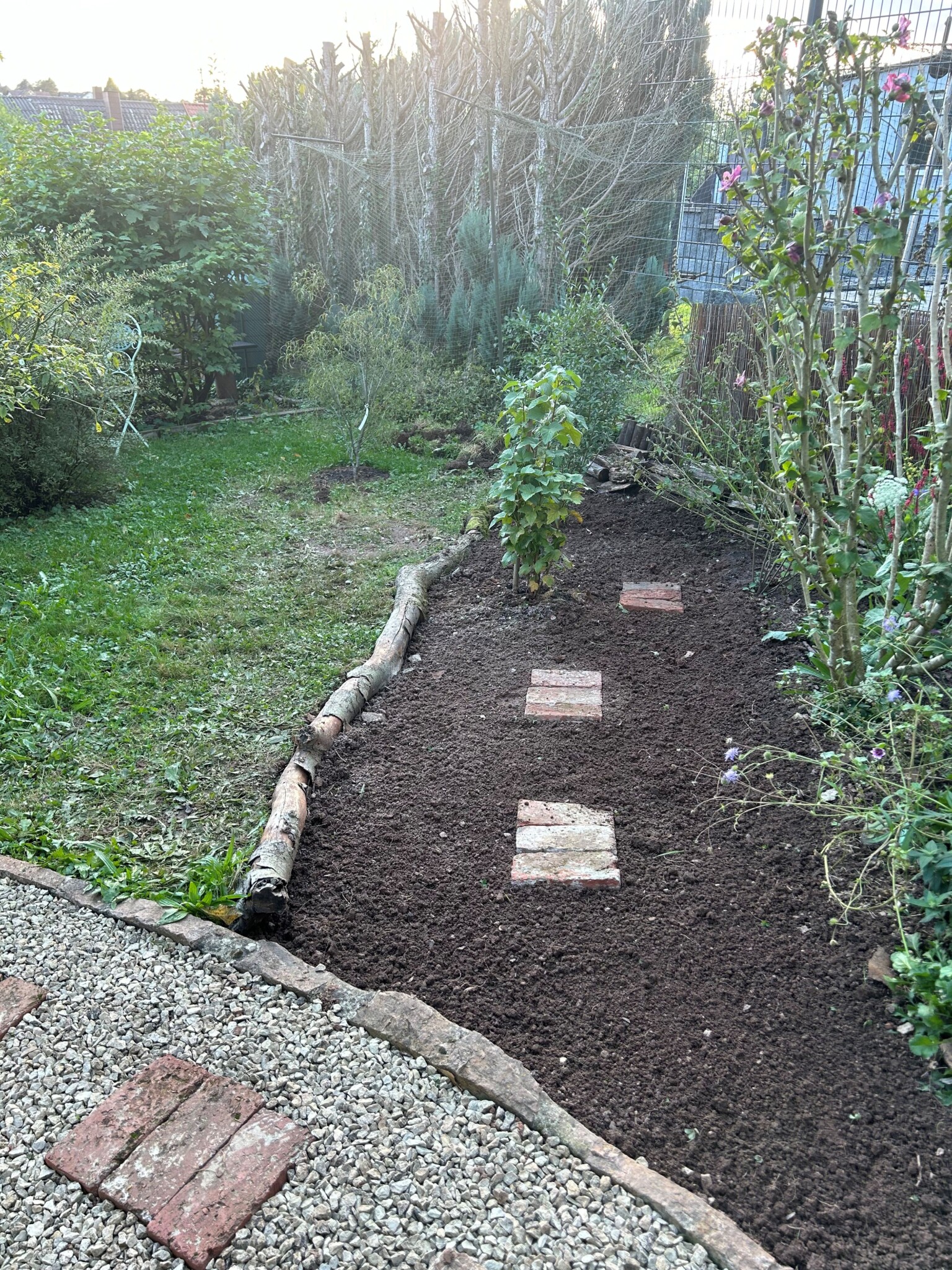 Ein neues Staudenbeet wurde angelegt und ein Vorhandenes vergrößert. Dafür wurde die Grasnarbe abgetragen und an anderer Stelle aufgesetzt zu einen kleinen Hügel. Etwas Sand untergegraben, Holzstämme als Abgrenzung zur Wiese verlegt, ein paar Steine und Totholz hinzugefügt und mit einheimischen Pflanzen wie z.B. kleines Mädesüß, Kugelblume, Wiesenstorchschnabel, Heilziest, weiße Lichtnelke, Teufelskralle, pfirsischbl. Glockenblume oder die Perückenflockenblume gepflanzt. Ca. 280 Blumenzwiebeln wie Krokusse, Narzissen und Wildtulpen gesetzt und im Frühjahr noch Mohn eingesäht. Bei einem Beet hab ich im Frühjahr noch ein Sandarium mit Sand aus einer Baugrube von einem Hausbau ergänzt. Und in einer Ecke wurde mit alten Ziegelsteinen ein Bereich abgetrennt damit bei Regen sich etwas das Wasser sammelt und feuchter bleibt. Für den Blutweiderich, großer Wiesenknopf und Kuckuckslichtnelke.