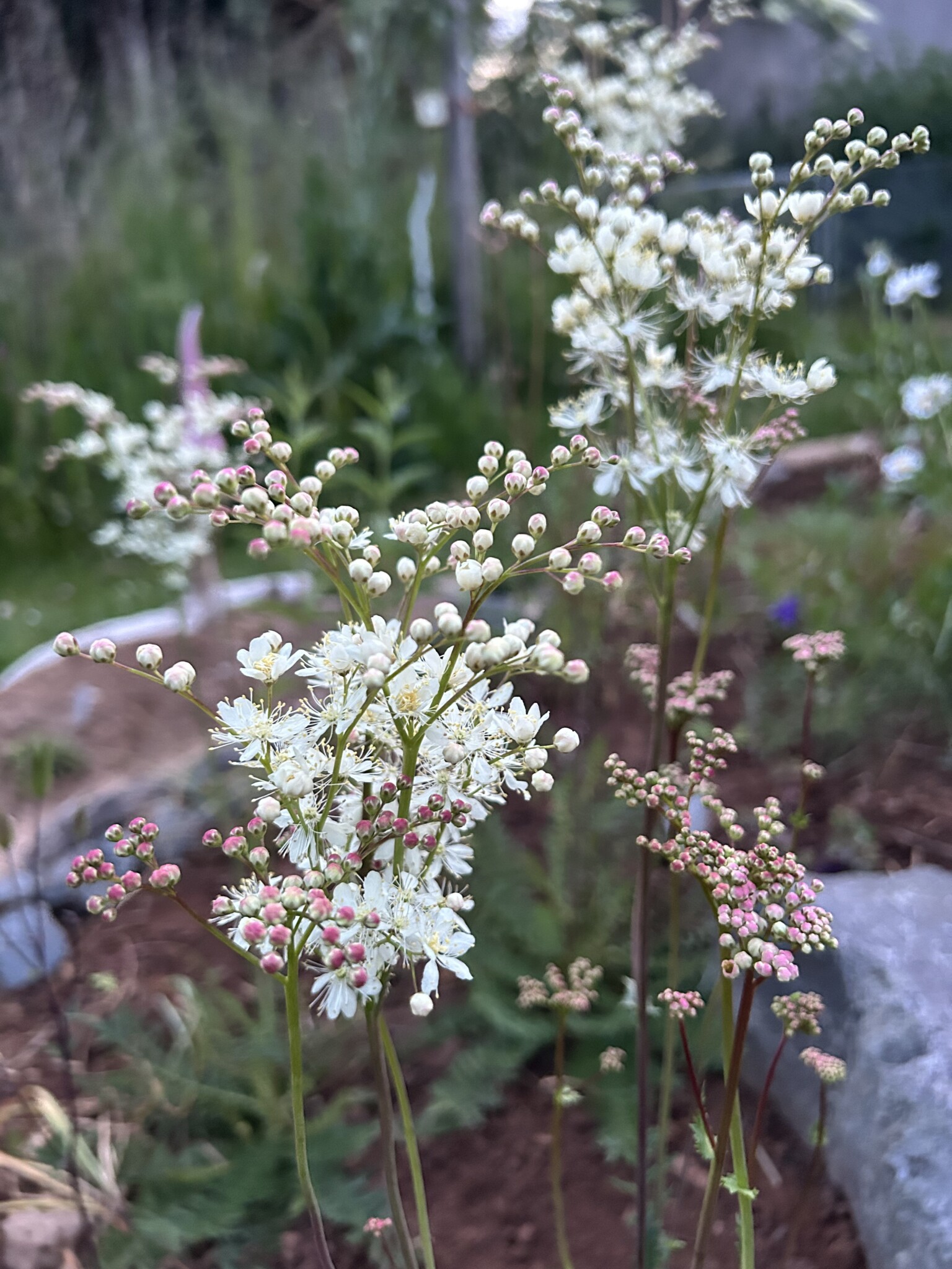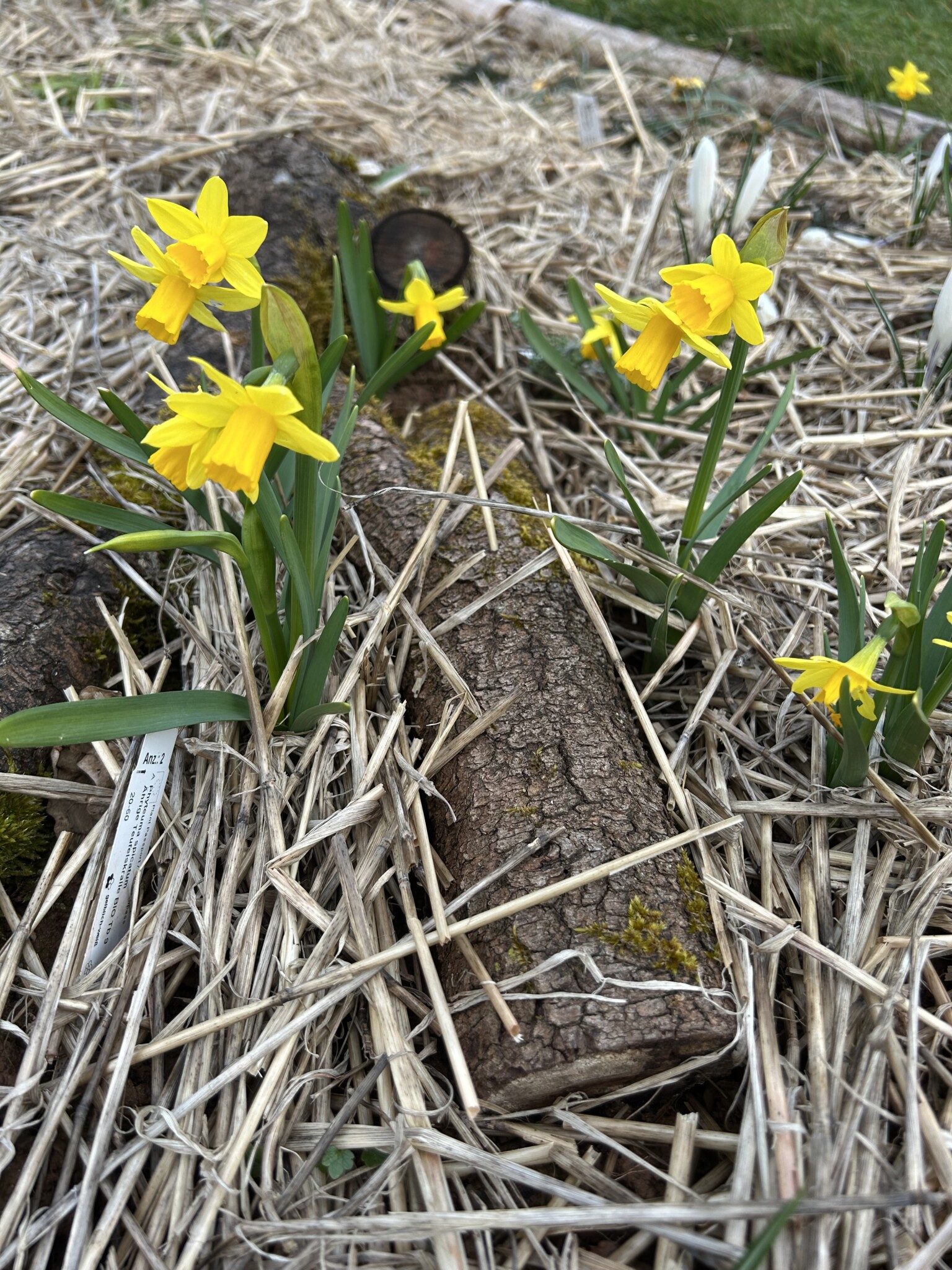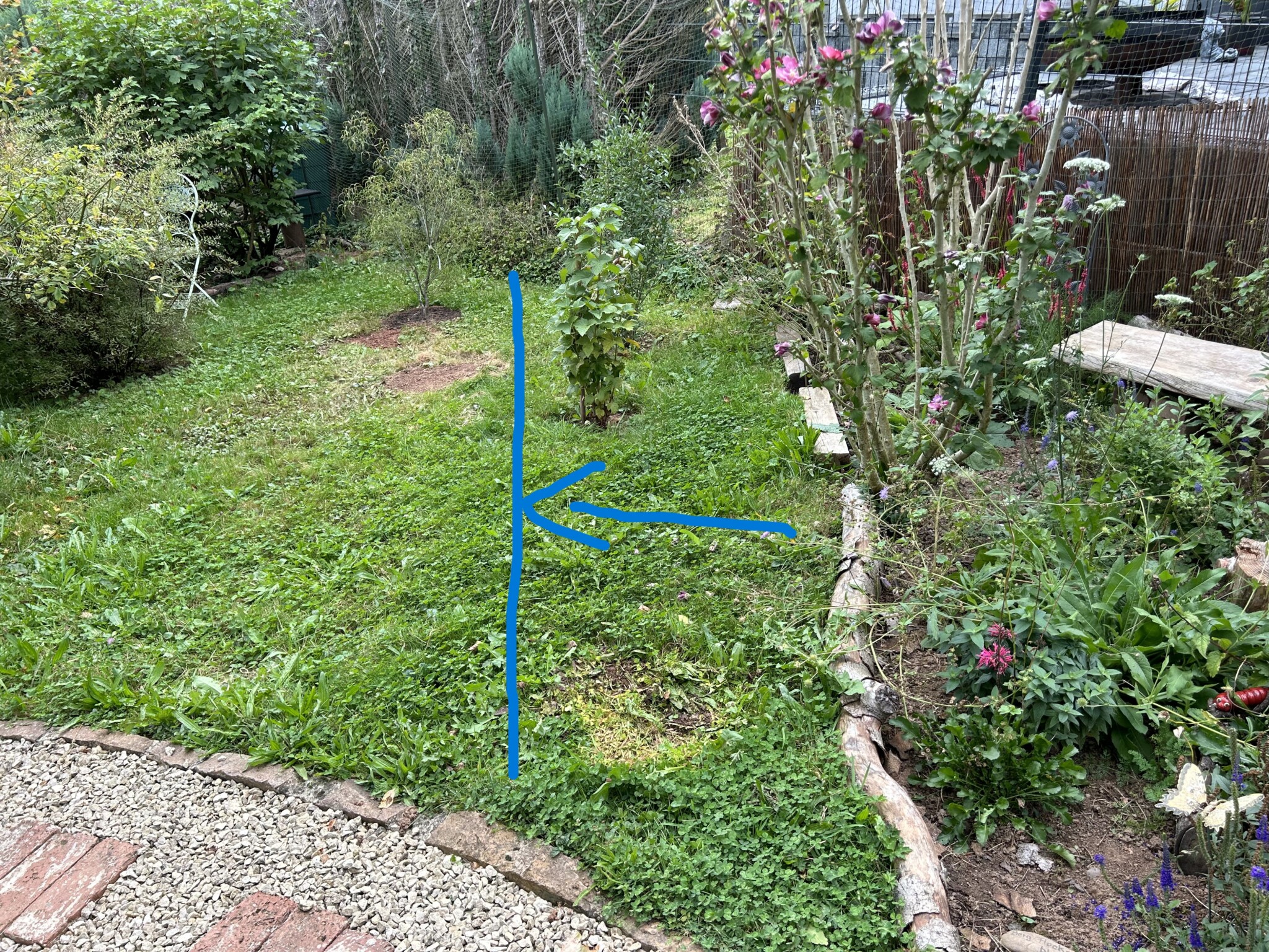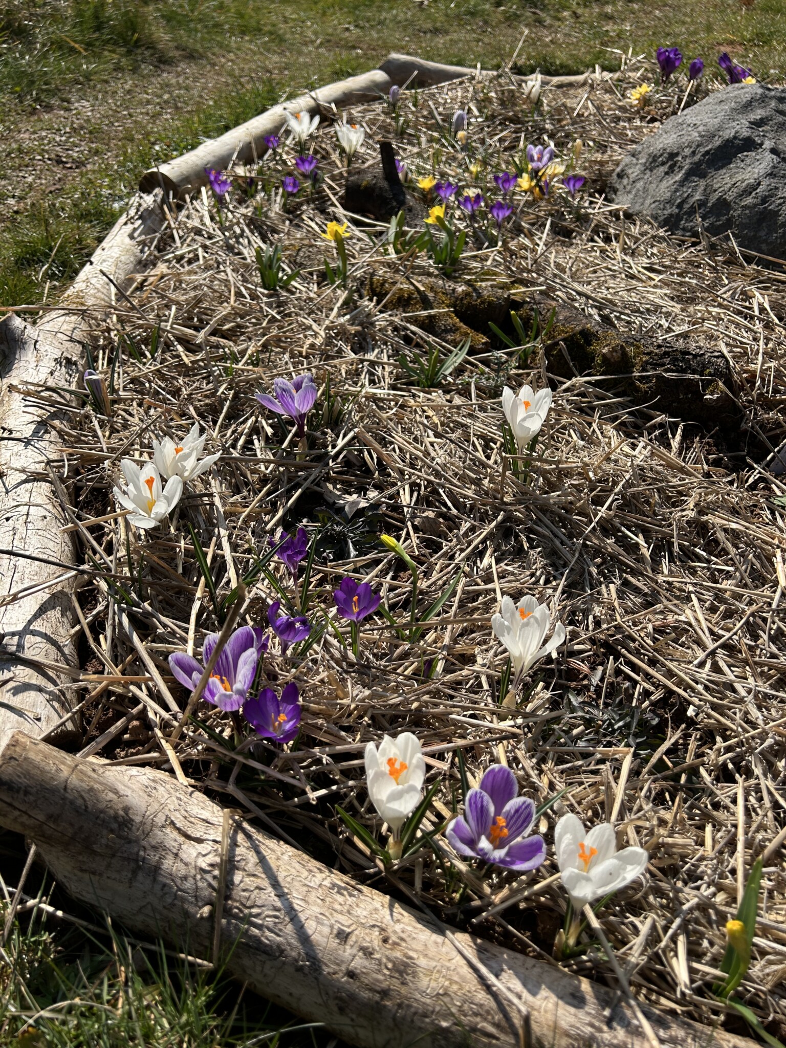 Ein neues Staudenbeet wurde angelegt und ein Vorhandenes vergrößert. Dafür wurde die Grasnarbe abgetragen und an anderer Stelle aufgesetzt zu einen kleinen Hügel. Etwas Sand untergegraben, Holzstämme als Abgrenzung zur Wiese verlegt, ein paar Steine und Totholz hinzugefügt und mit einheimischen Pflanzen wie z.B. kleines Mädesüß, Kugelblume, Wiesenstorchschnabel, Heilziest, weiße Lichtnelke, Teufelskralle, pfirsischbl. Glockenblume oder die Perückenflockenblume gepflanzt. Ca. 280 Blumenzwiebeln wie Krokusse, Narzissen und Wildtulpen gesetzt und im Frühjahr noch Mohn eingesäht. Bei einem Beet hab ich im Frühjahr noch ein Sandarium mit Sand aus einer Baugrube von einem Hausbau ergänzt. Und in einer Ecke wurde mit alten Ziegelsteinen ein Bereich abgetrennt damit bei Regen sich etwas das Wasser sammelt und feuchter bleibt. Für den Blutweiderich, großer Wiesenknopf und Kuckuckslichtnelke.