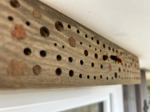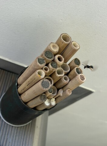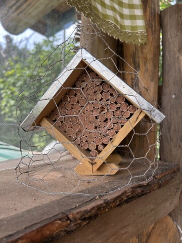 An geschützten Stellen hab ich Wildbienennisthilfen hingestellt oder gehängt. In einem Workshop vom BUND hab ich gelernt wie man aus Bambusstangen selber welche basteln kann. Hab aber auch welche gekauft. Sie wurde gerne angenommen.
