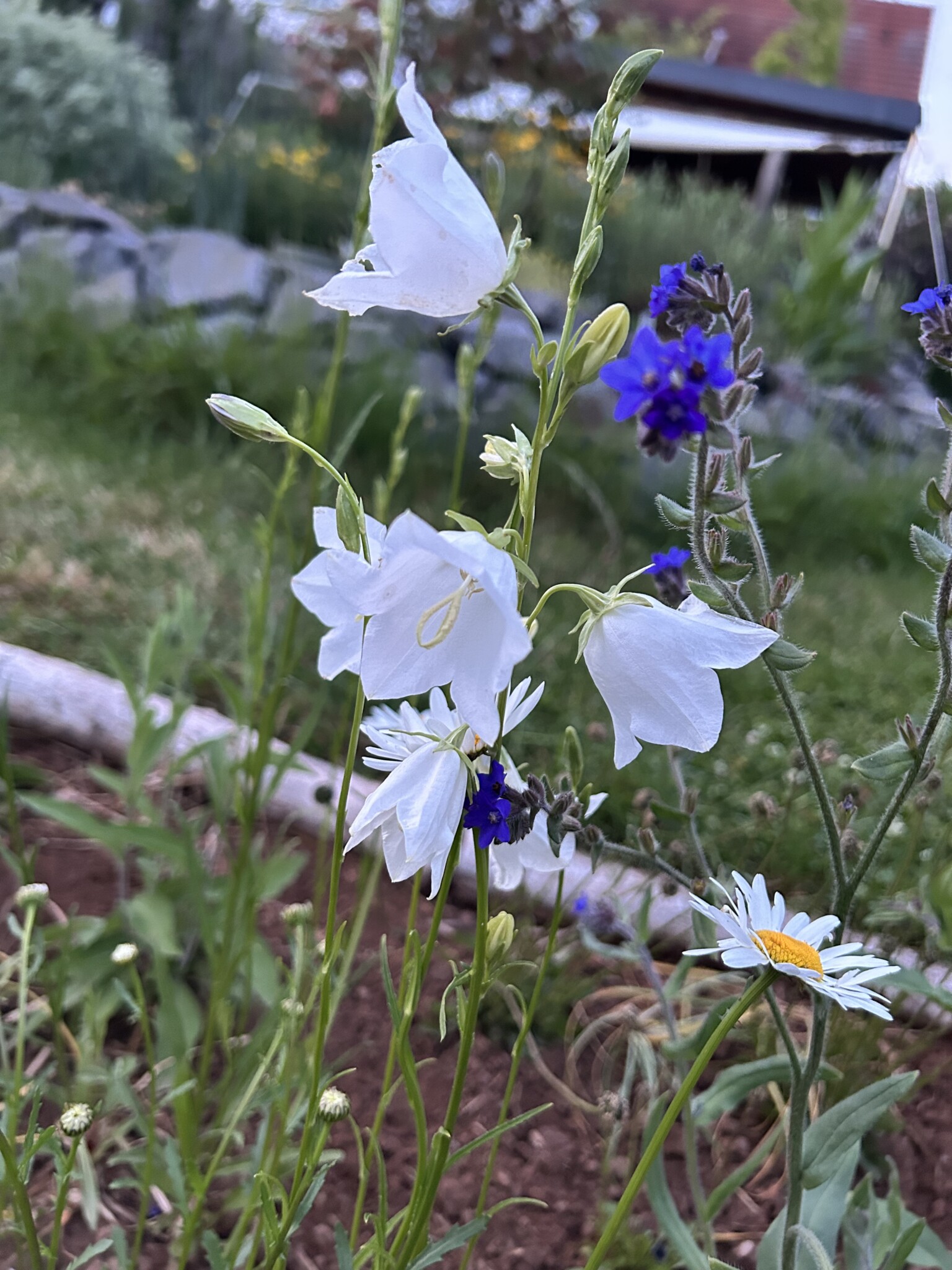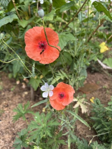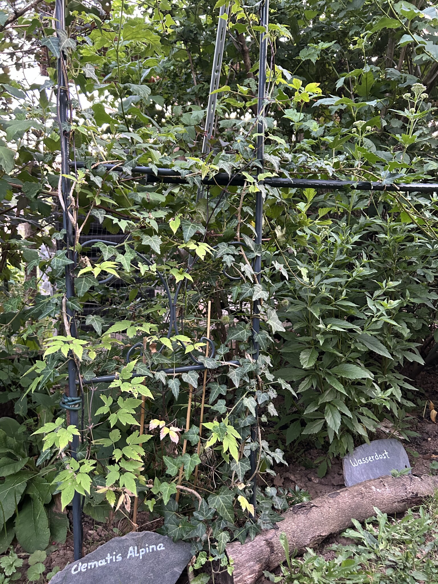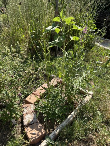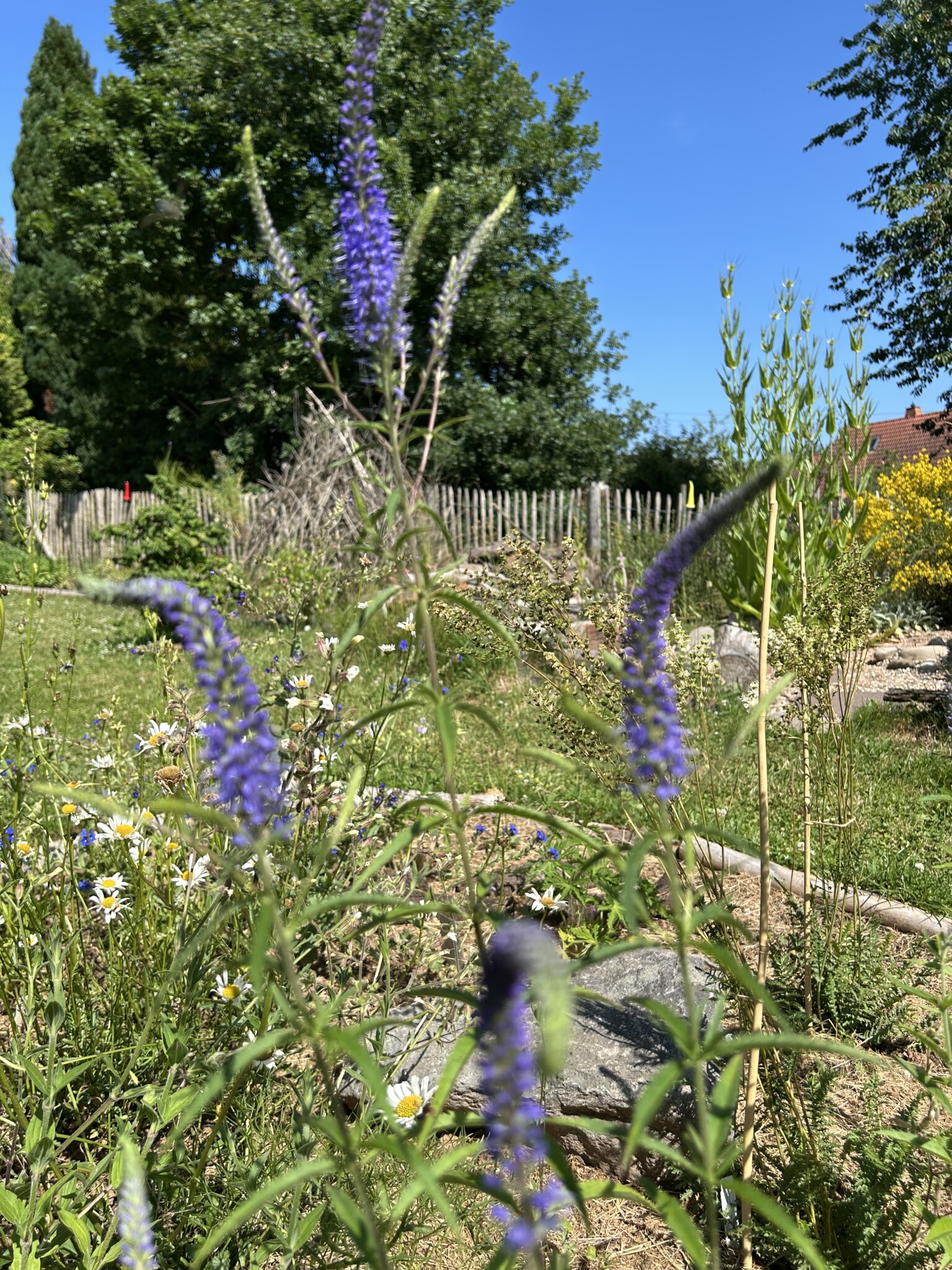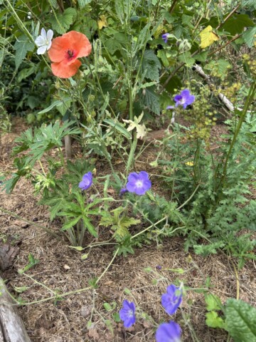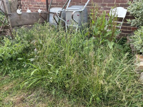 Der Komposthaufen wurde verkleinert und die übrige Fläche sich selbst überlassen. Ich nenne es Chansenbeet. Die Chanse genutzt haben Sauerampfer, Hahnenfuß, Scabiose, Mutterkraut, Vergissmeinnicht, Brennnessel, Ehrenpreis, Löwenzahn, Gundermann und diverse Gräser. Die Fläche war relativ schnell bewachsen.