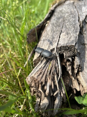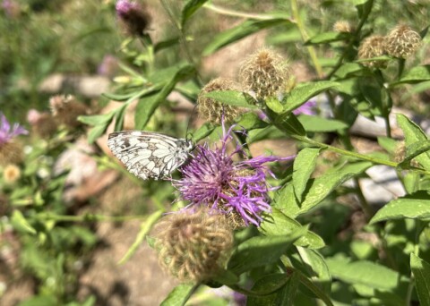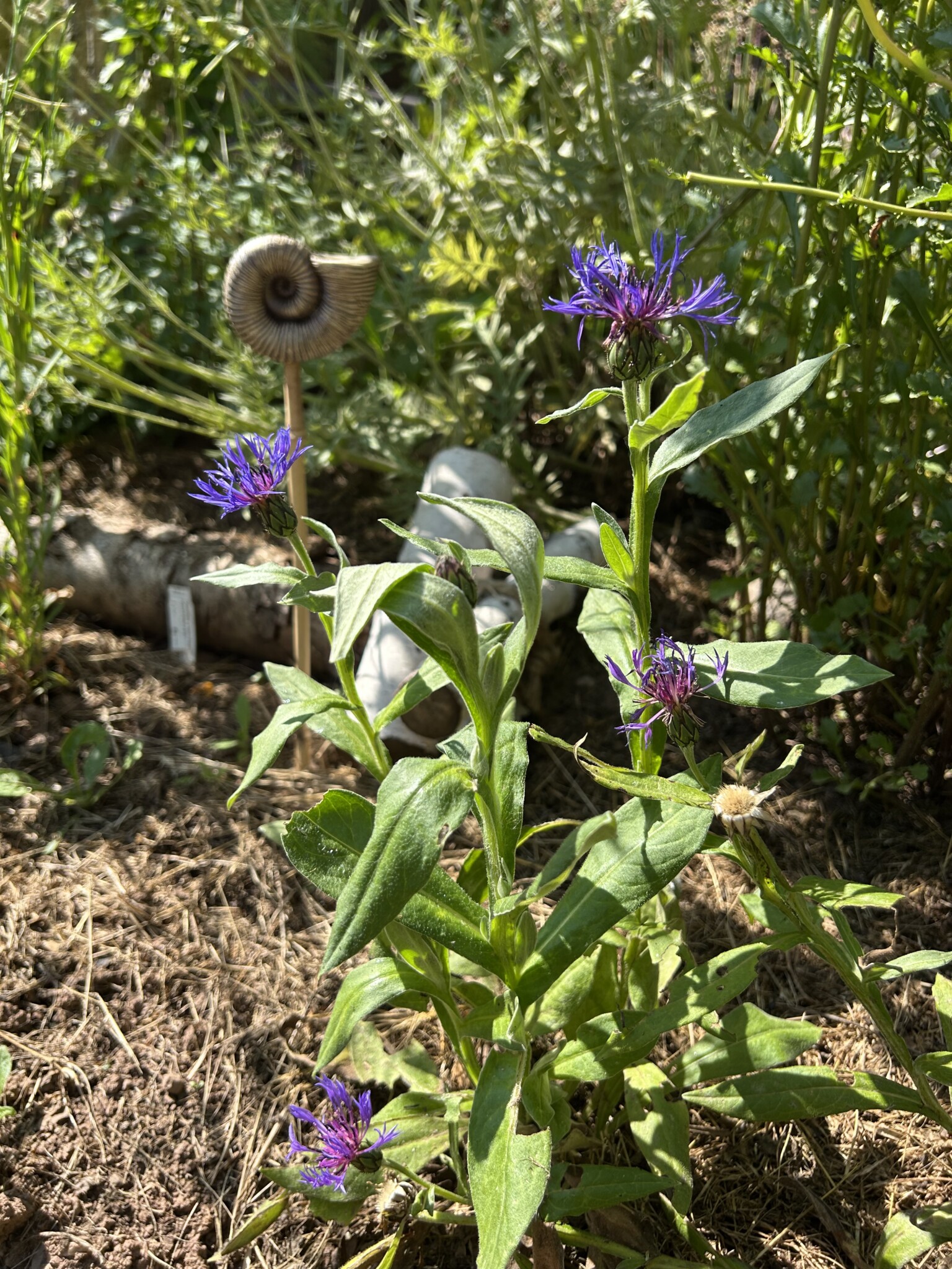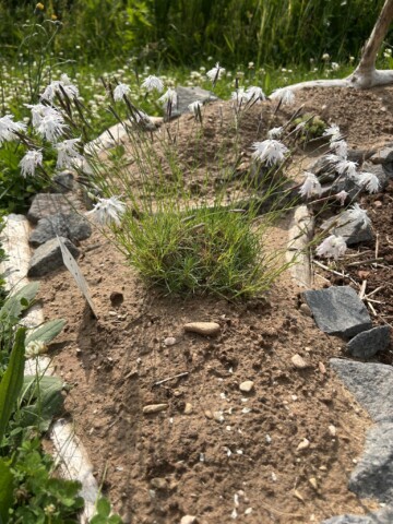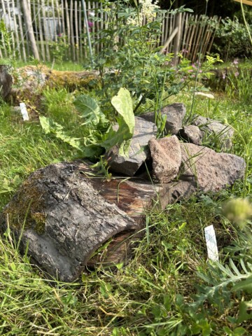 Auf den Hügel aus der Grasnarbe wurden Totholz und Steine hingelegt und ein paar Pflanzen gepflanzt… eine Filzrose, Bergflockenblume, Scabiose, Wiesenraute und das Kleine Mädesüß. Durch den Hügel entsteht auch ein anderes Mikroklima an der Stelle… davor eher sonnig, dahinter eher schattig.