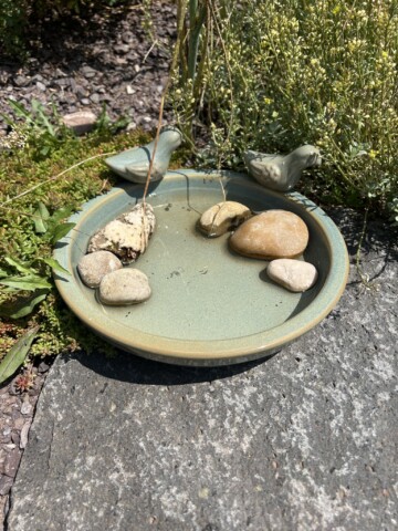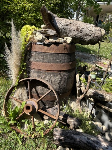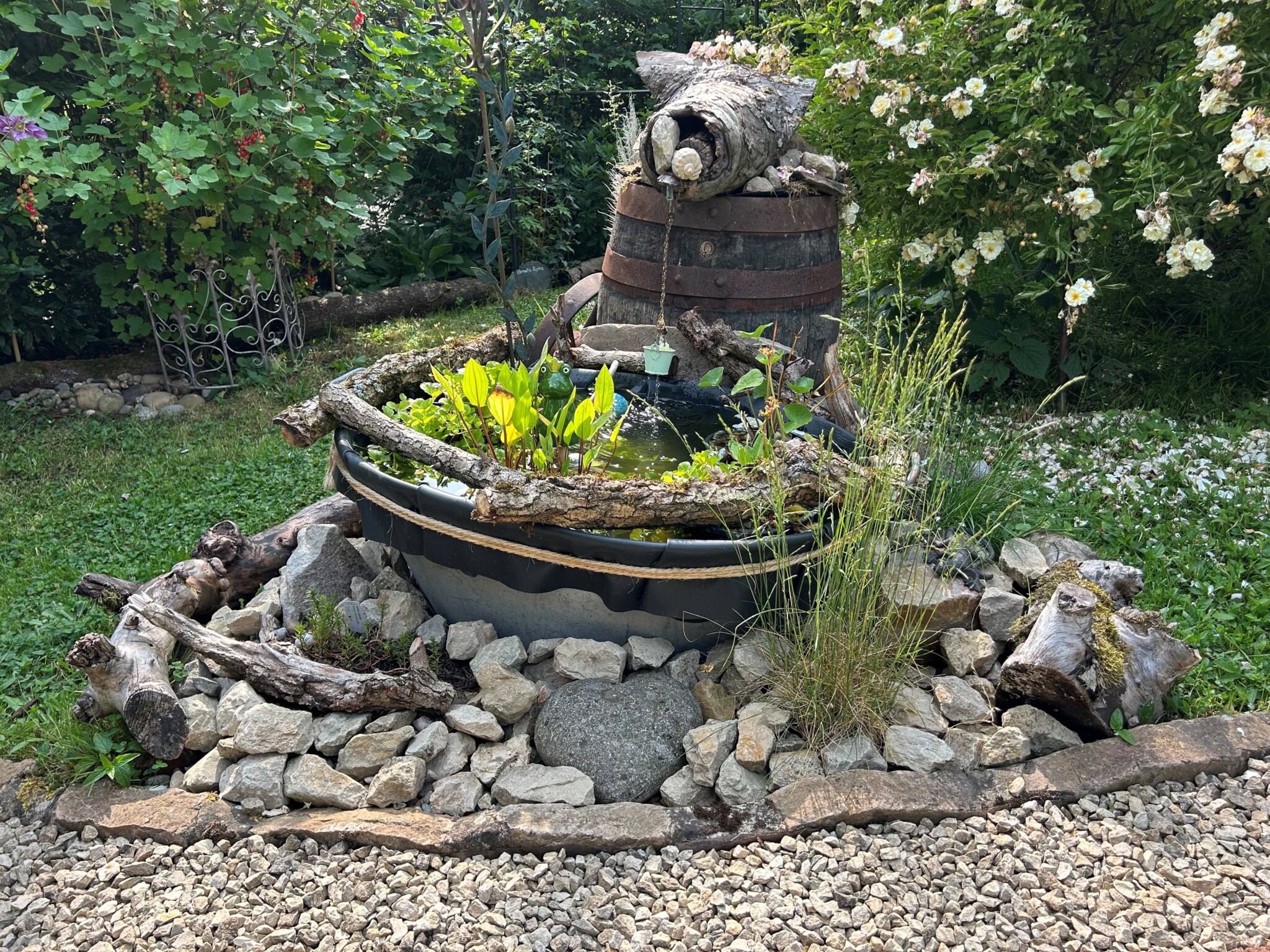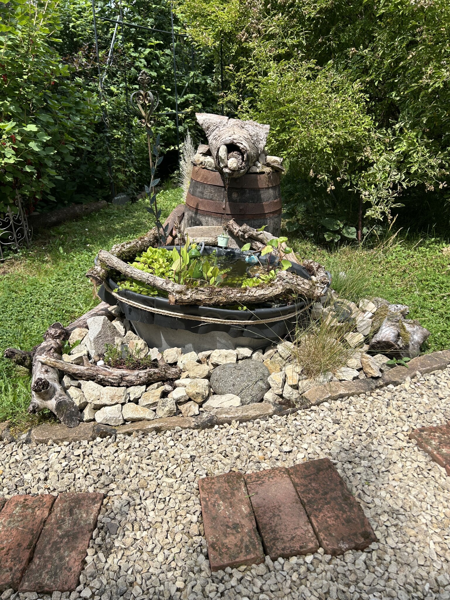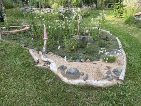 Aus einer alten Zinkwanne hab ich einen Miniteich gemacht mit extra EPDM-Folie drin. Drinnen wachsen nun Tannenwedel, Pfennigkraut, Sumpfdotterblume und Froschlöffel. Kleine Äste für den Rand zu kaschieren. Ein altes Weinfass mit einem ausgehöhlten Ast steht daneben, aus dem Wasser in den Miniteich mit Hilfe einer Solarpumnpe fließt. Um den Teich und das Weinfass liegen Steine und Totholz und dazwischen verschiedene Gräser und Sedumpfanzen.