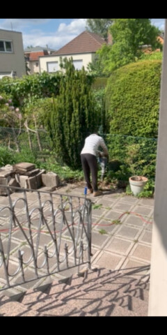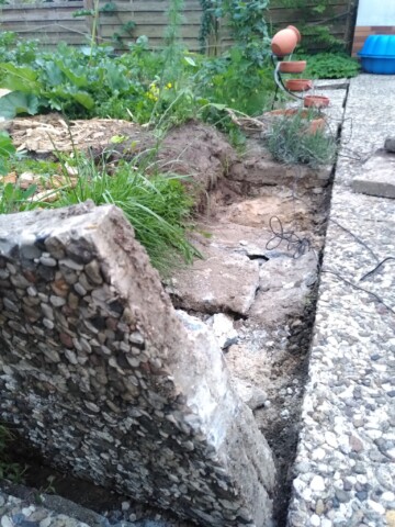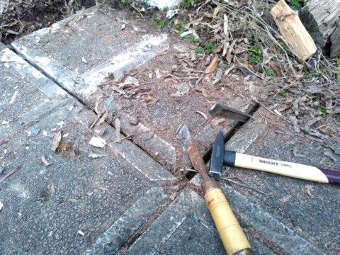 Leichter gesagt als getan: 15cm Zement liegen unter den Steinplatten. Sollte hier ein „Panzer“ (SUV) parken können?