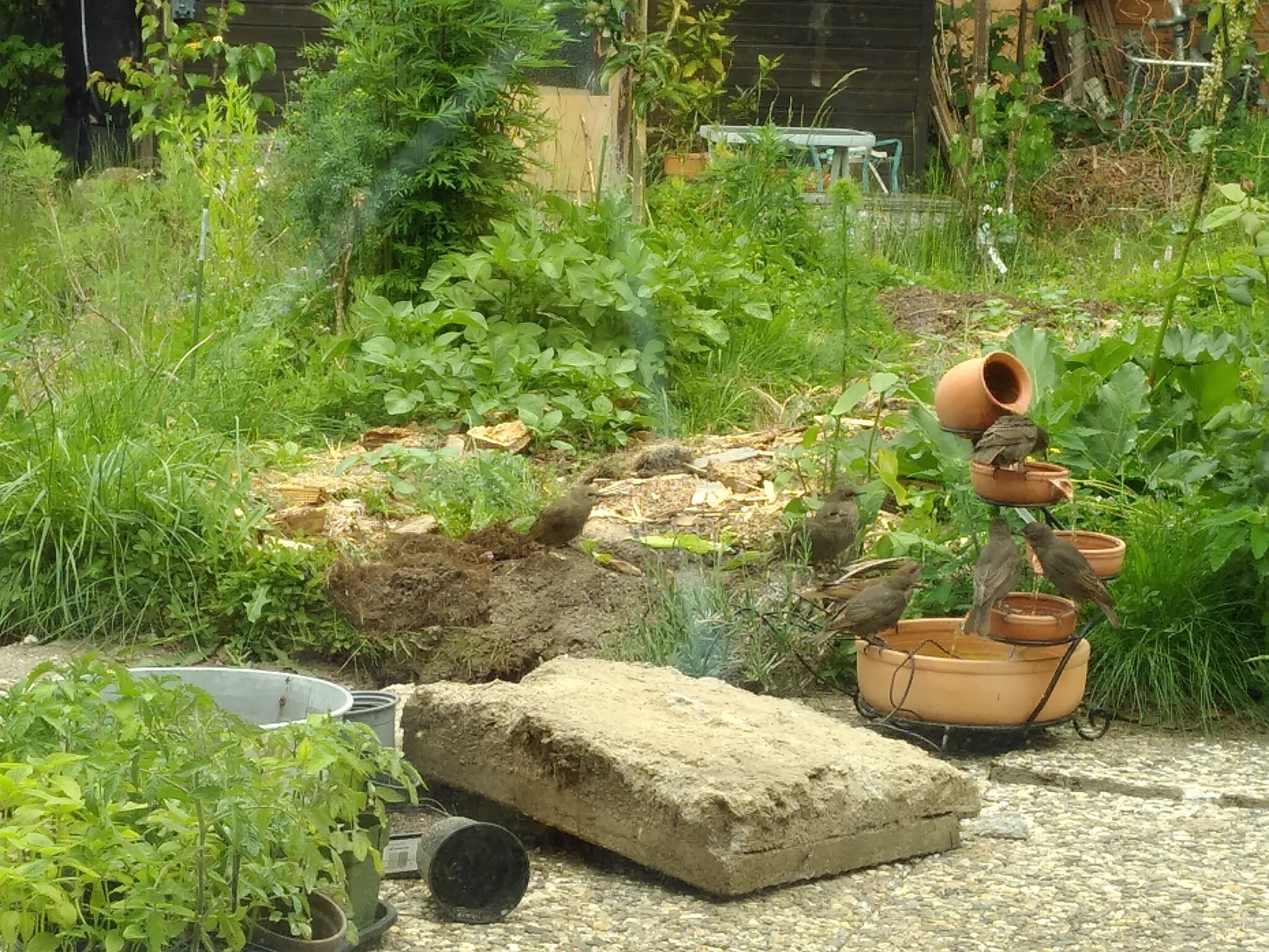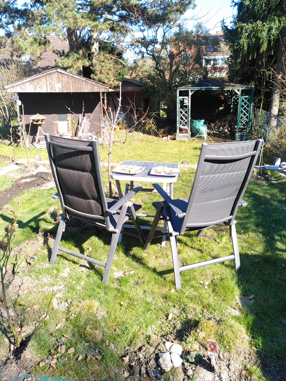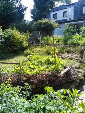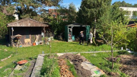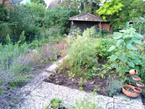 Unsere kleine Familie investiert jede freie Minute in Anlegen und Pflege des Gartens – trotz Elternzeit und Teilzeitarbeit ist das nie genug. Aber auch mit Nachbar:innen entstehen Gespräche über nachhaltige Gartengestaltung: von erstaunten Fragen („Ihr wollt wirklich so viele Steine herausreißen ohne neuzupflastern?“) über neugierige Blicke („Wir freuen uns schon auf euer Sonnenblumenfeld!“) bis hin zu schenkenden Händen (Erdbeerpflanzen, Rittersporn, Borretsch). Obststrauchschnitt aus dem Gemeinschaftsgarten Paulusgarten Schöneberg verschaffte uns eine kleine Strauchanzucht.
