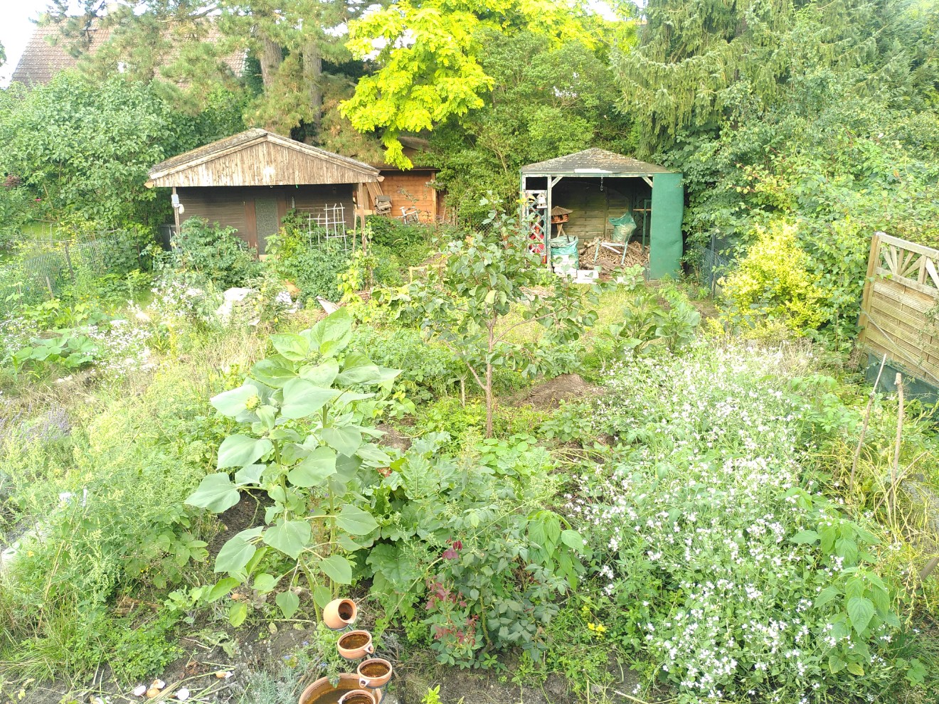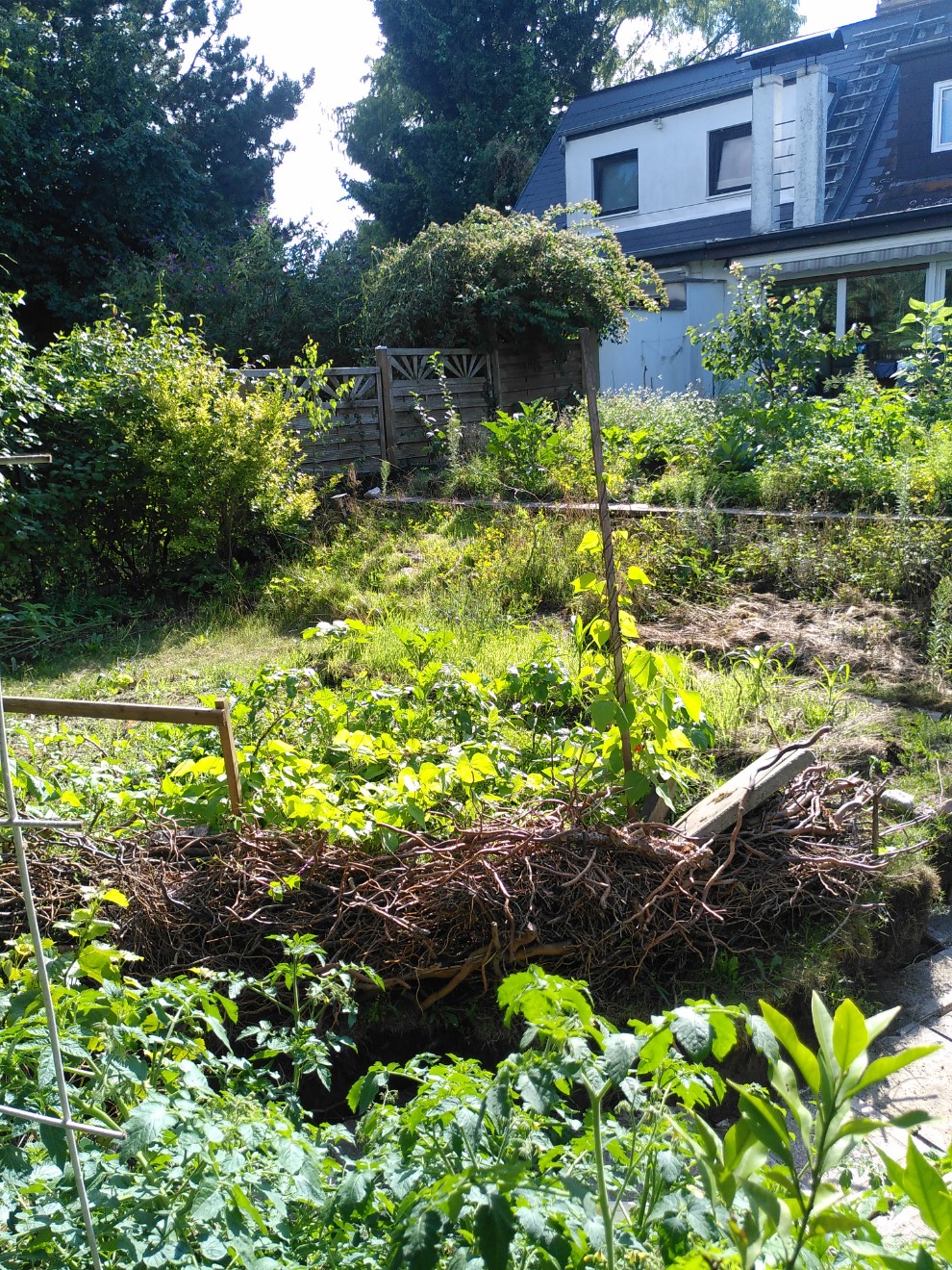 Kohl, Bohnen, Paprika umrahmt von einer Benjeshecke. Im Vordergrund: Tomatenplantage unter dem Vordach des Gartenhauses.