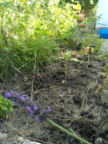 Um dem Garten zuverlässig Wasser zur Verfügung zu stellen, haben wir neben der Anschaffung von zwei gebrauchten IBC-Containern die Sickergrube versiegelt. Der neu angelegte Weg dient dafür auch als Ablauf in den Garten.