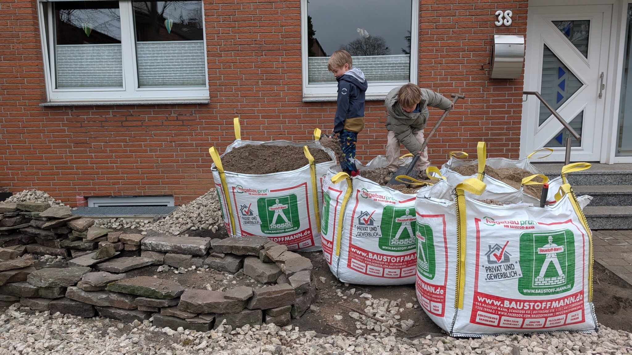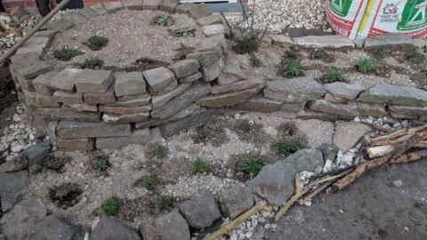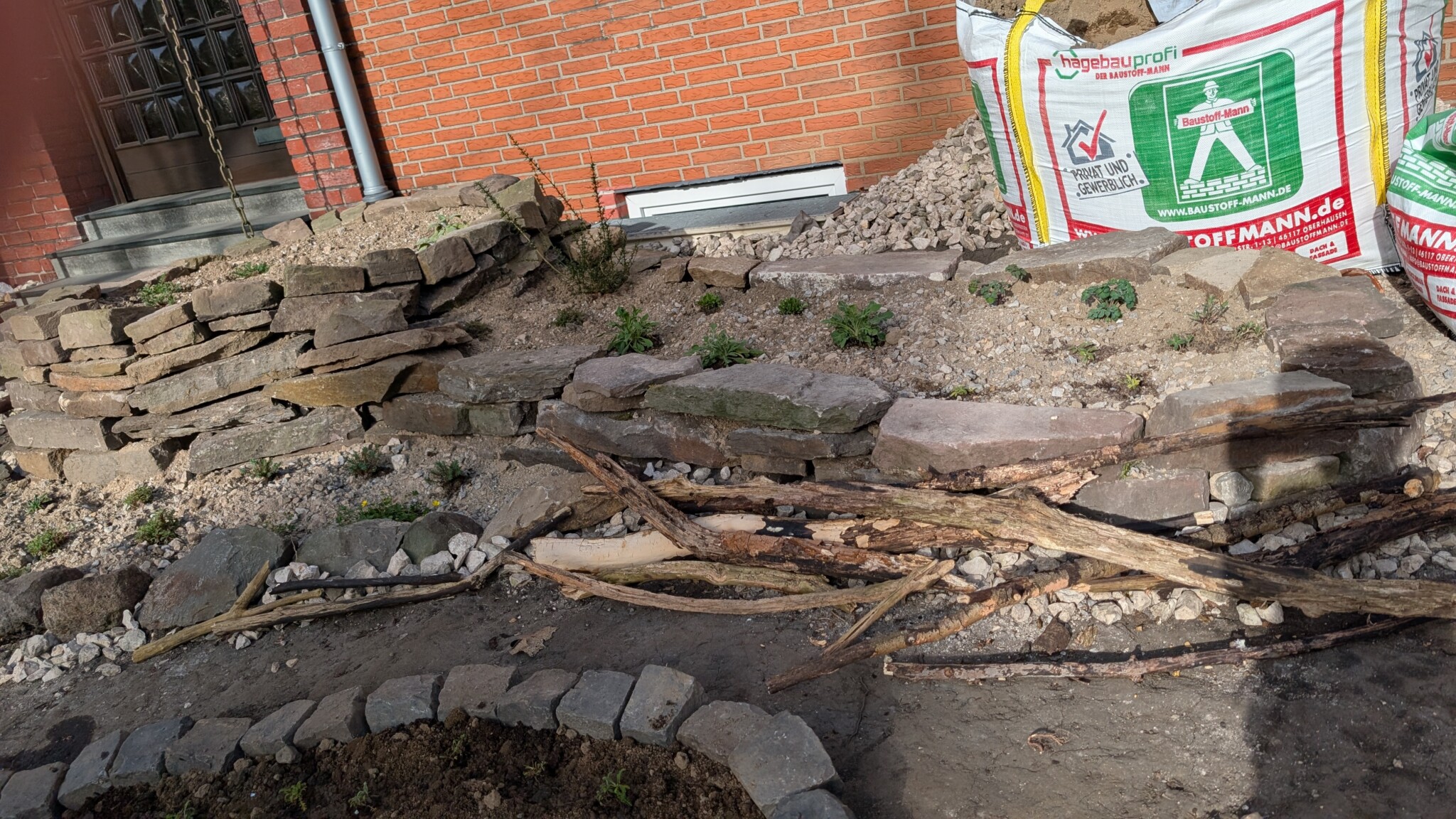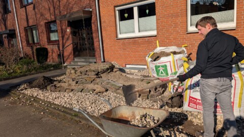 Leicht ist es nicht, aber voller Tatendrang werden die Schottersteine abgetragen, die drei Gehölze ausgegraben und verschenkt, neue Strukturen mit teils gebrauchten Steinen neu geschaffen.