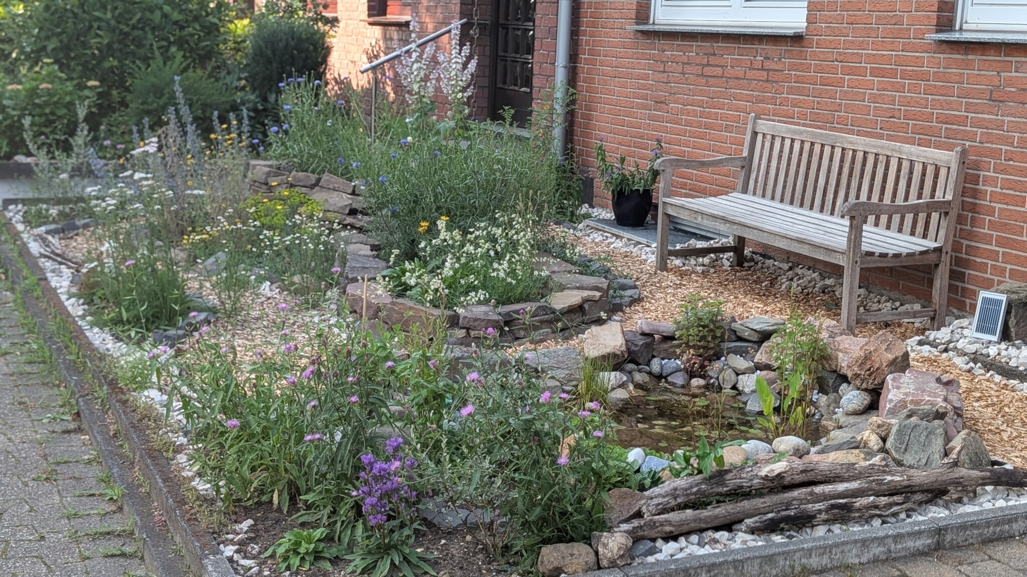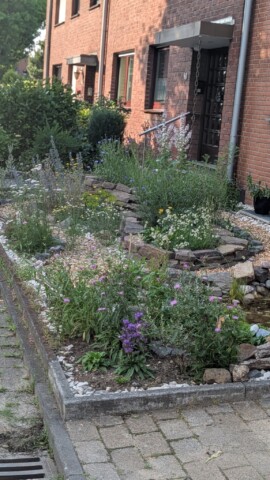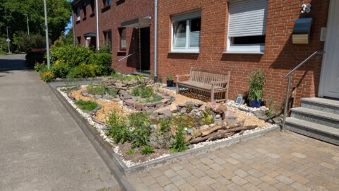 Ein Schottergarten, der vor Jahren mit dem Ziel der Reduzierung des Pflegeaufwandes durch die Schwiegereltern beauftragt wurde, soll in einen insektenfreundlichen Vorgarten verwandelt werden. Geplant und umgesetzt sind Strukturen und Elemente, die möglichst vielfältige Kleinstbiotope entstehen lassen. Hauptmodule sind ein Kies-Schotter-Beet mit entsprechender Bepflanzung und ein kleiner Naturteich.