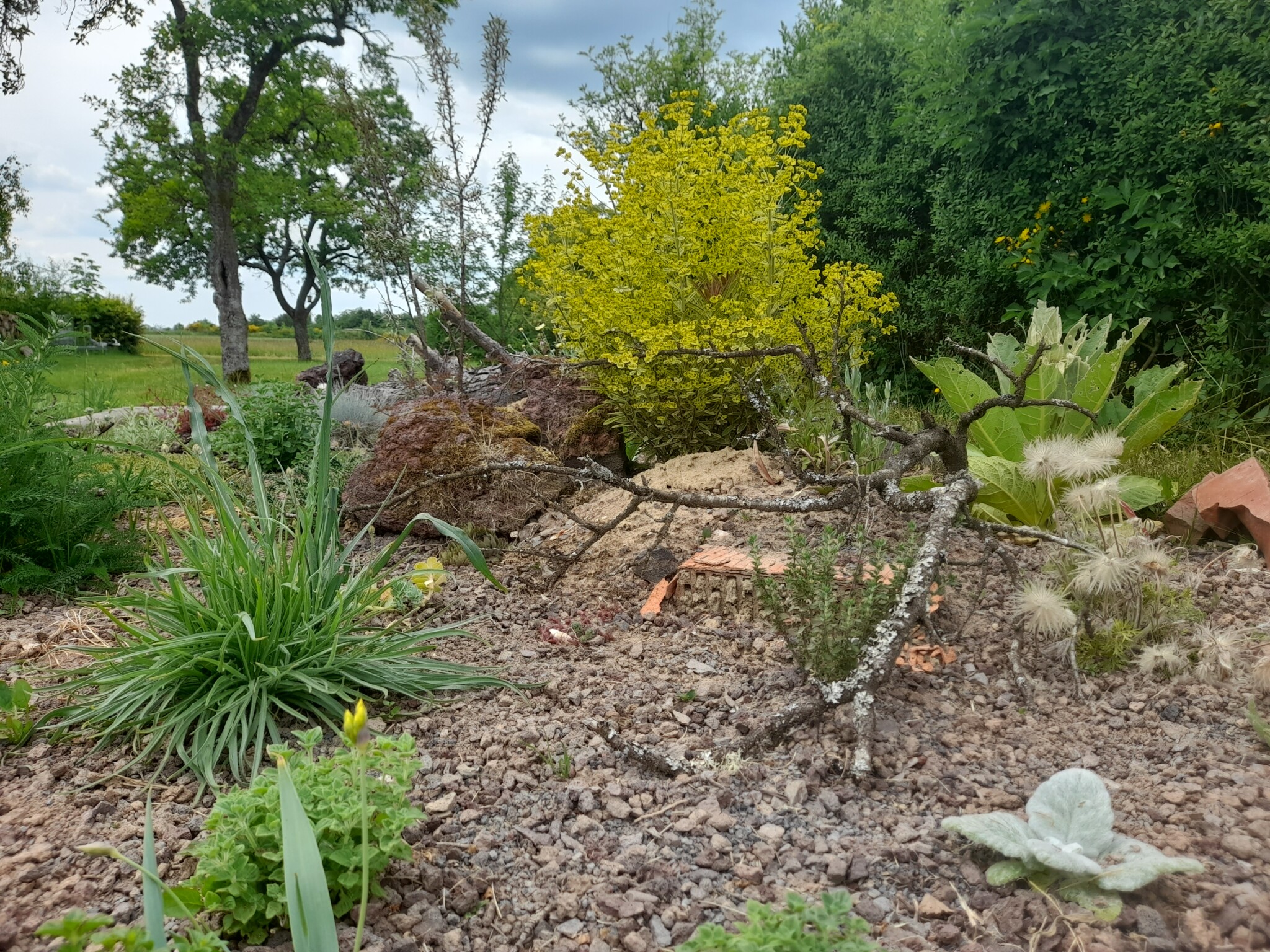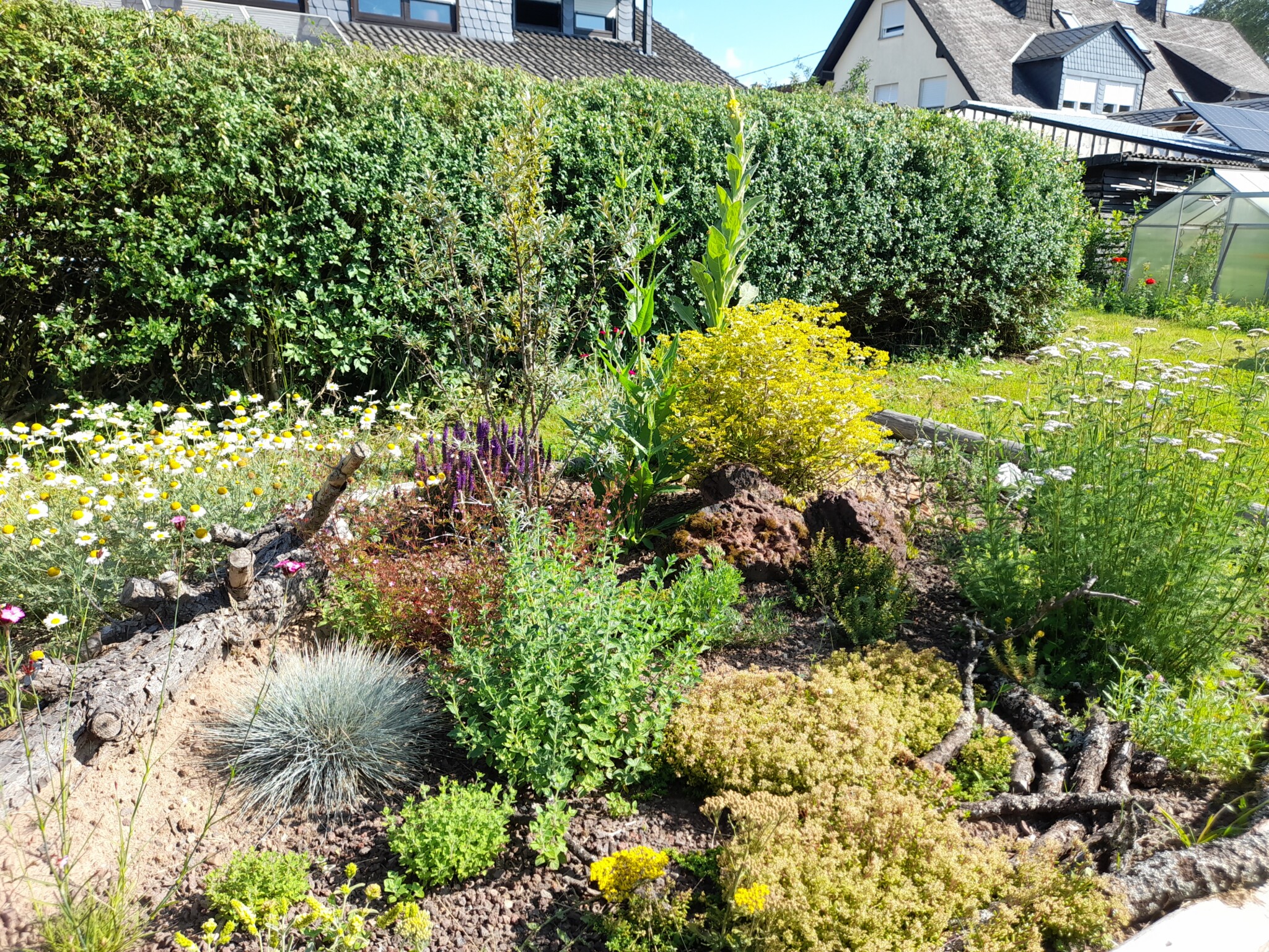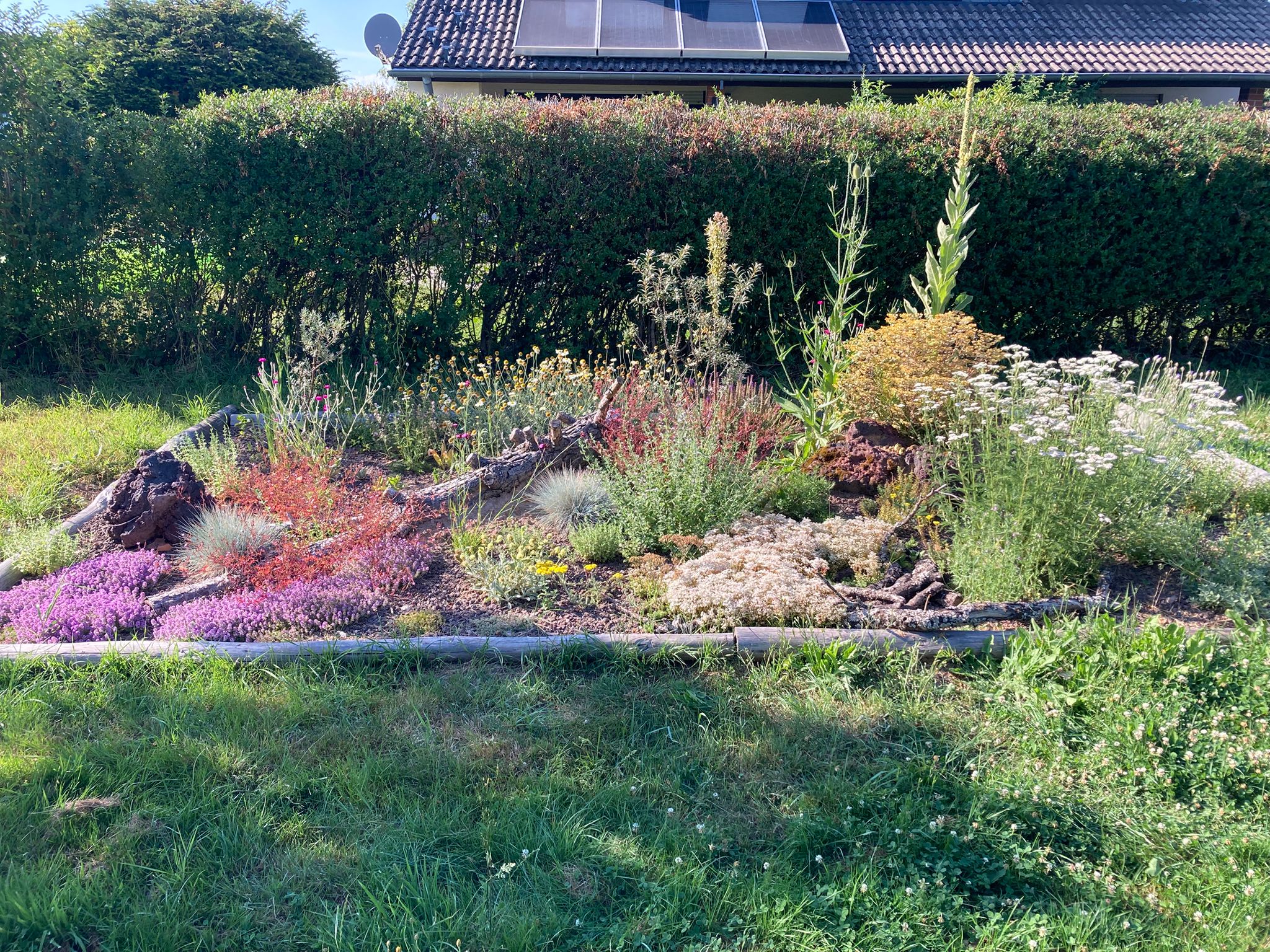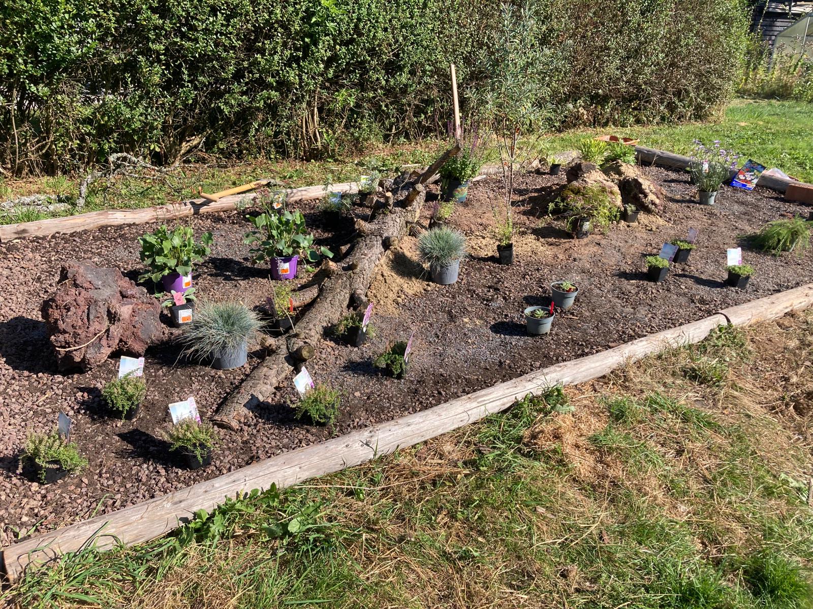 Gesagt getan, von der Idee kam es rasch zur Umsetzung. Jascha fing direkt an einen Pflanzplan mit heimischen Stauden zu erstellen, da wir schon immer ein insektenfreundliches und heimisches Trockenbeet anlegen wollten. Das Budget für die Pflanzen wurde so gering wie möglich gehalten. Also haben wir reduzierte Ware gekauft und geteilte Stauden von Freunden verwendet. Außerdem wollten wir mit Materialien arbeiten, die vorhanden waren, wie die Beetumrandung aus Rundhölzern und einem wunderschönen Stück Totholz einer Kiefer, die umgefallen war. Da wir ja in der Vulkaneifel wohnen,  organisierte unser Vermieter noch schöne gr0ße Lavabrocken. Außerdem versuchten wir eine Sandlehmmischung  beim Totholz und dem Lavagestein aufzuschütten, um hier eine Möglichkeit für Wildbienen zur Eiablage zu schaffen.