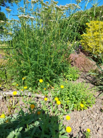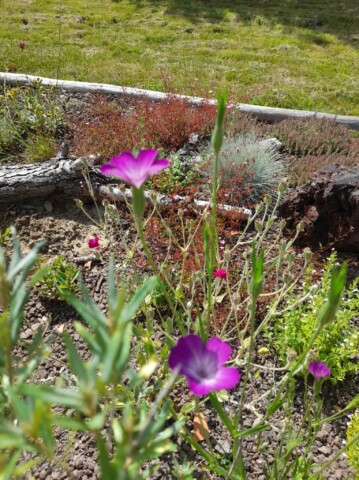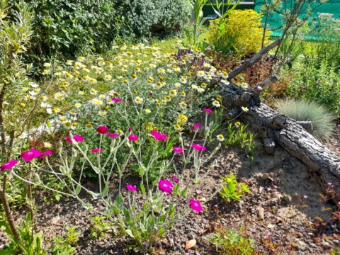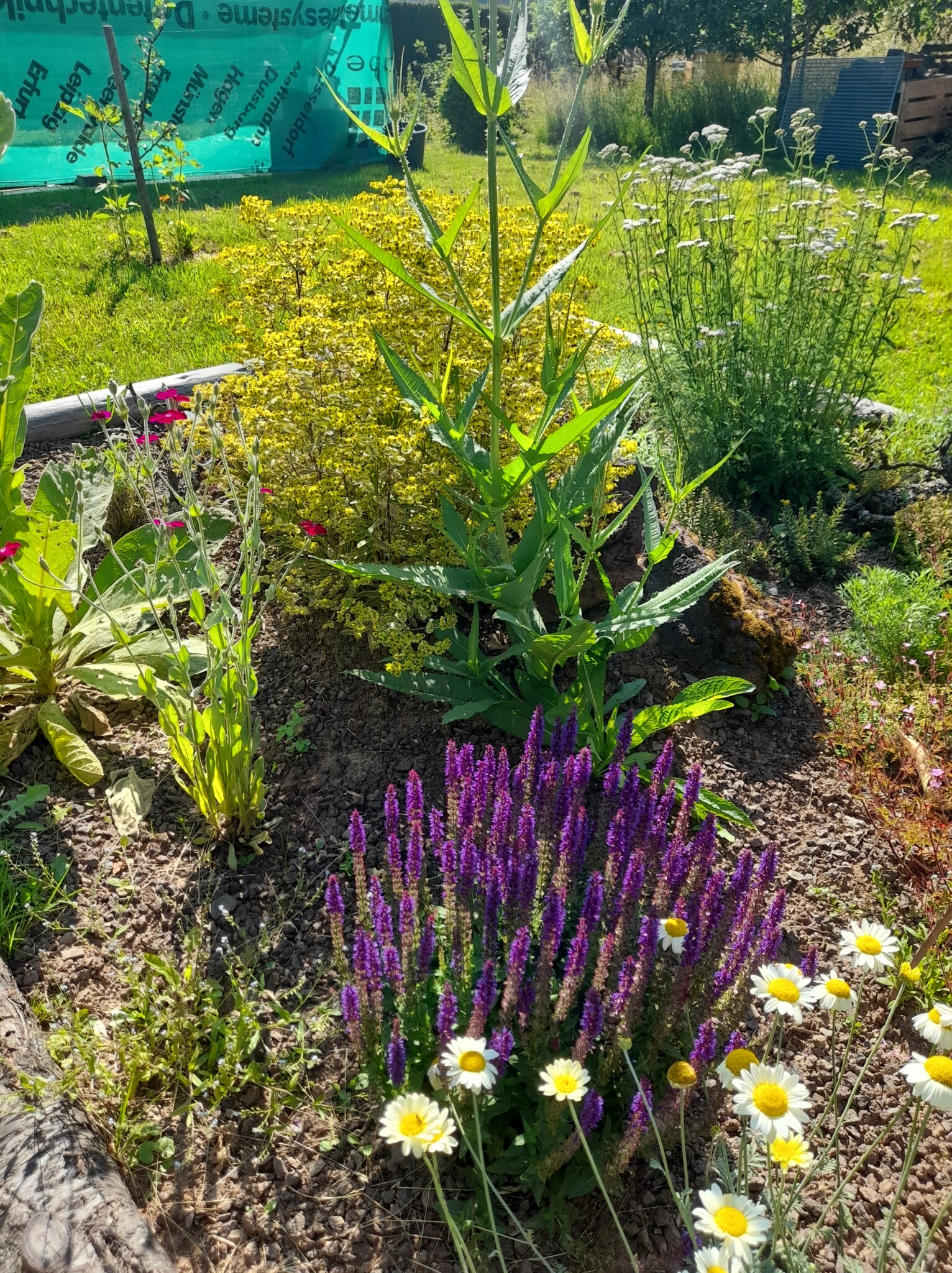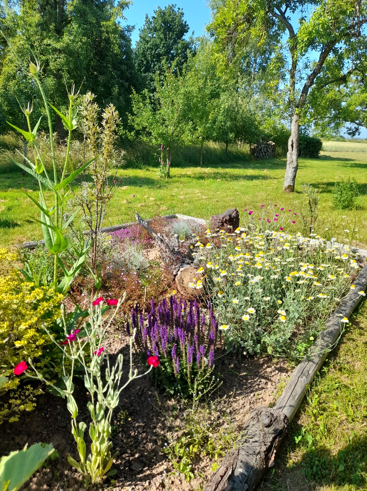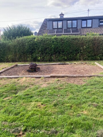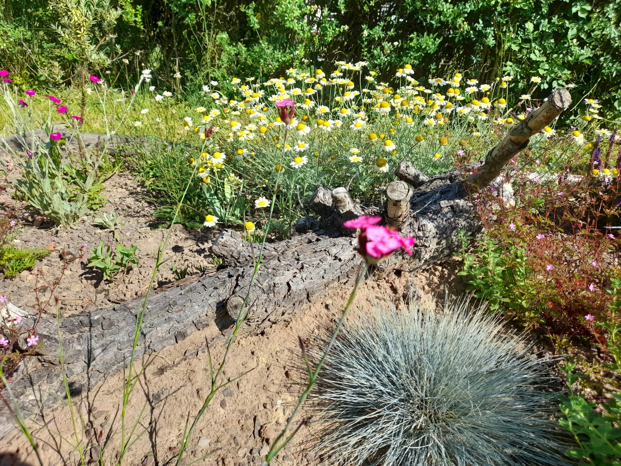 Gesagt getan, von der Idee kam es rasch zur Umsetzung. Jascha fing direkt an einen Pflanzplan mit heimischen Stauden zu erstellen, da wir schon immer ein insektenfreundliches und heimisches Trockenbeet anlegen wollten. Das Budget für die Pflanzen wurde so gering wie möglich gehalten. Also haben wir reduzierte Ware gekauft und geteilte Stauden von Freunden verwendet. Außerdem wollten wir mit Materialien arbeiten, die vorhanden waren, wie die Beetumrandung aus Rundhölzern und einem wunderschönen Stück Totholz einer Kiefer, die umgefallen war. Da wir ja in der Vulkaneifel wohnen,  organisierte unser Vermieter noch schöne gr0ße Lavabrocken. Außerdem versuchten wir eine Sandlehmmischung  beim Totholz und dem Lavagestein aufzuschütten, um hier eine Möglichkeit für Wildbienen zur Eiablage zu schaffen.