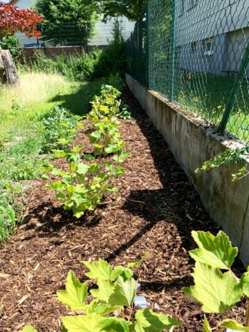 Neue heimische Beerensträucher wie Himbeere, Johannisbeere und Brombeere säumen die 30 Meter Beetfläche. Apfelbaum, Haselnuss und Holunder ergänzen die Artenvielfalt.