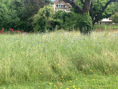 230 m² wurden gezielt in eine vielfältige Blühwiese umgewandelt – der Rest der 1030 m² großen Fläche bleibt größtenteils ungemäht, nur die Wege bleiben begehbar.
