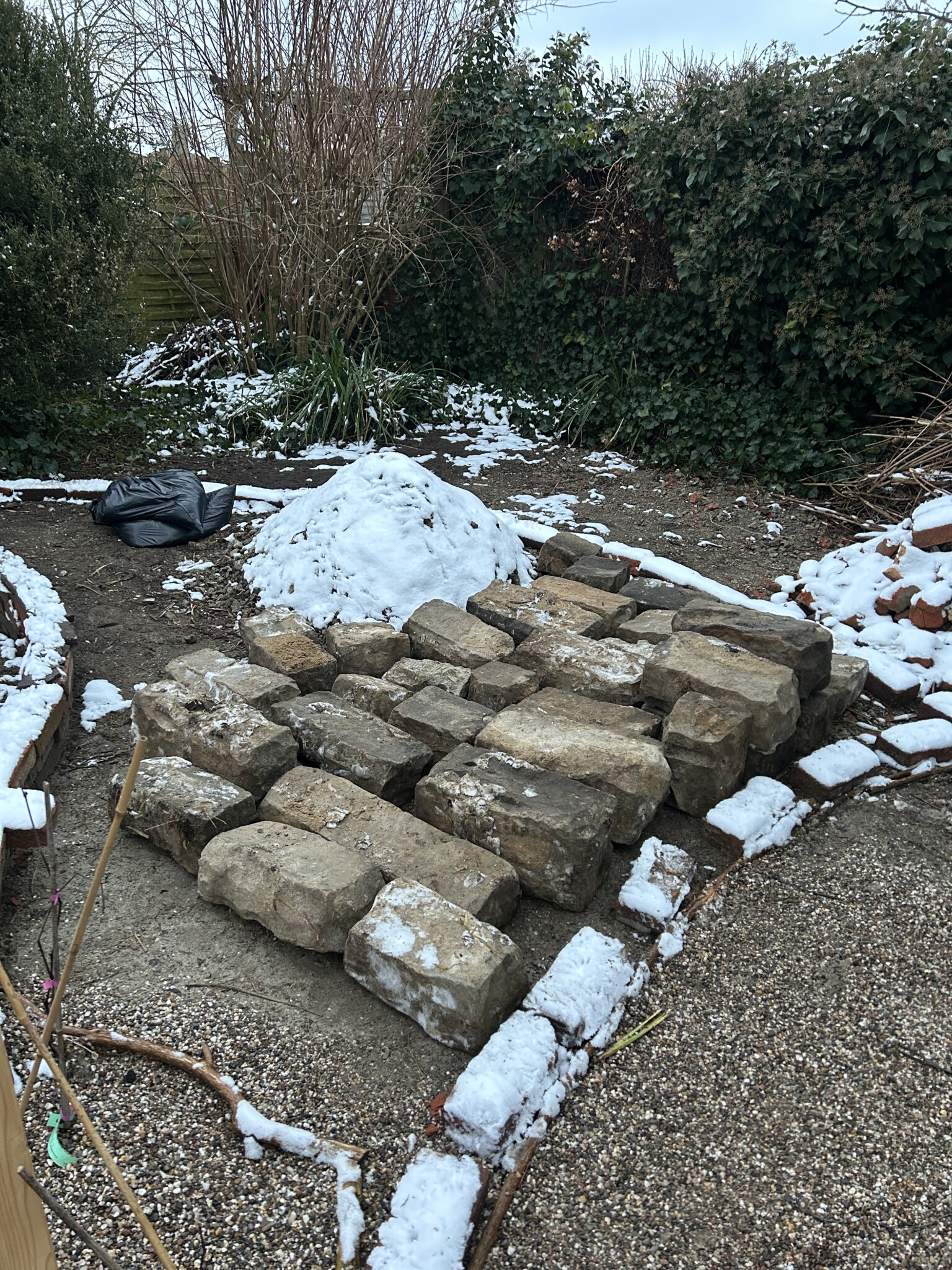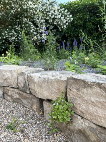 Die Trockenmauer besteht aus Steinen, die wir über Kleinanzeihen erworben haben.